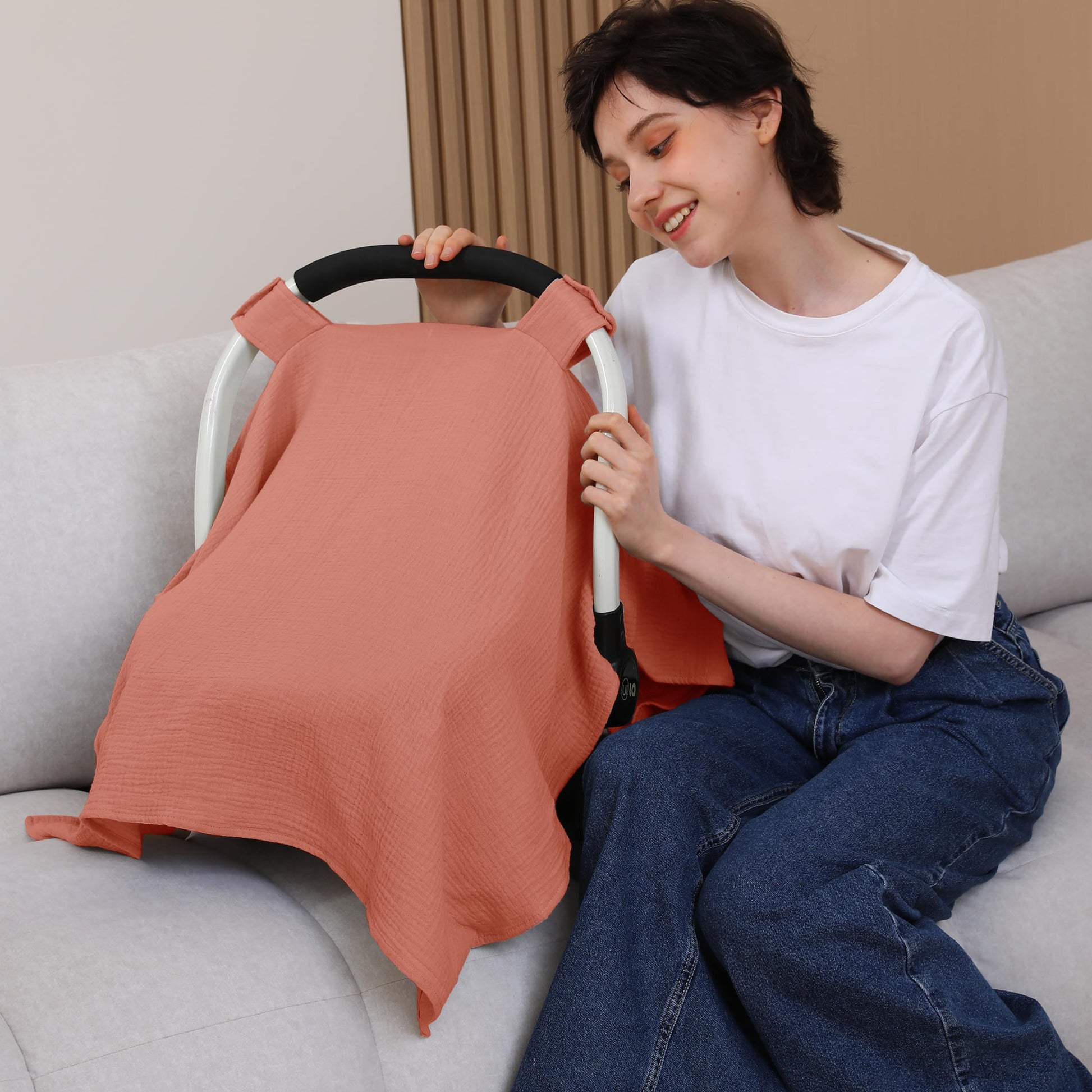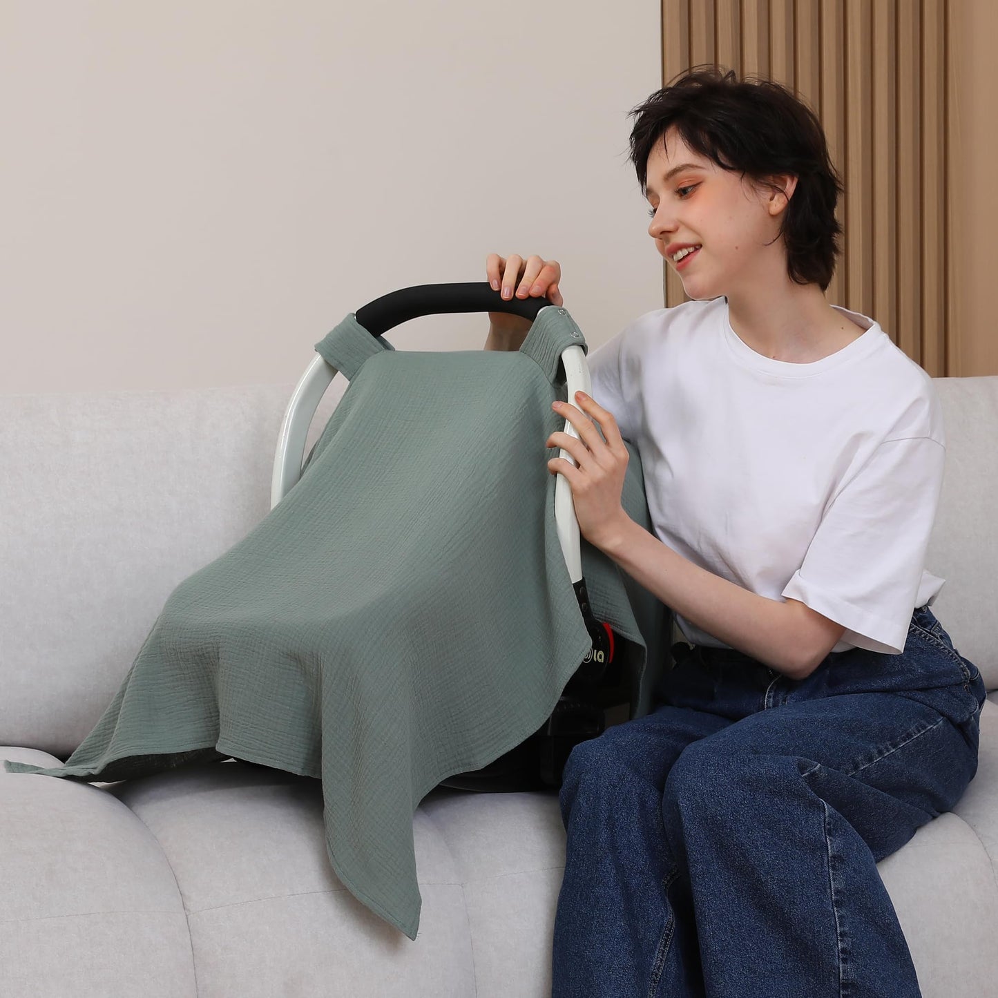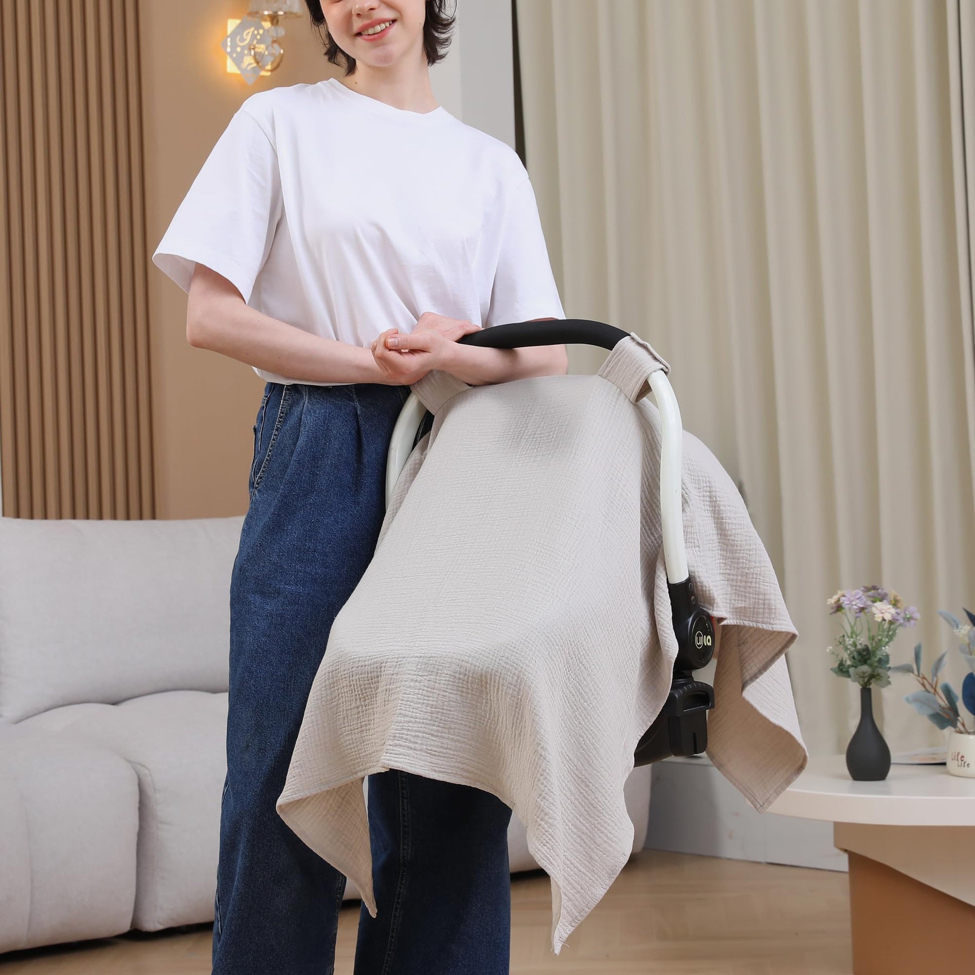 The carseat canopy cover is also lightweight and easy to wash, which is a big plus for busy parents. It support machine wash! Recommend wash at low temperature.(Do not tumble dry, do not Iron, high temperature will let muslin cotton be hard and shrink). It’s versatile enough to use as a nursing cover or even a light blanket.