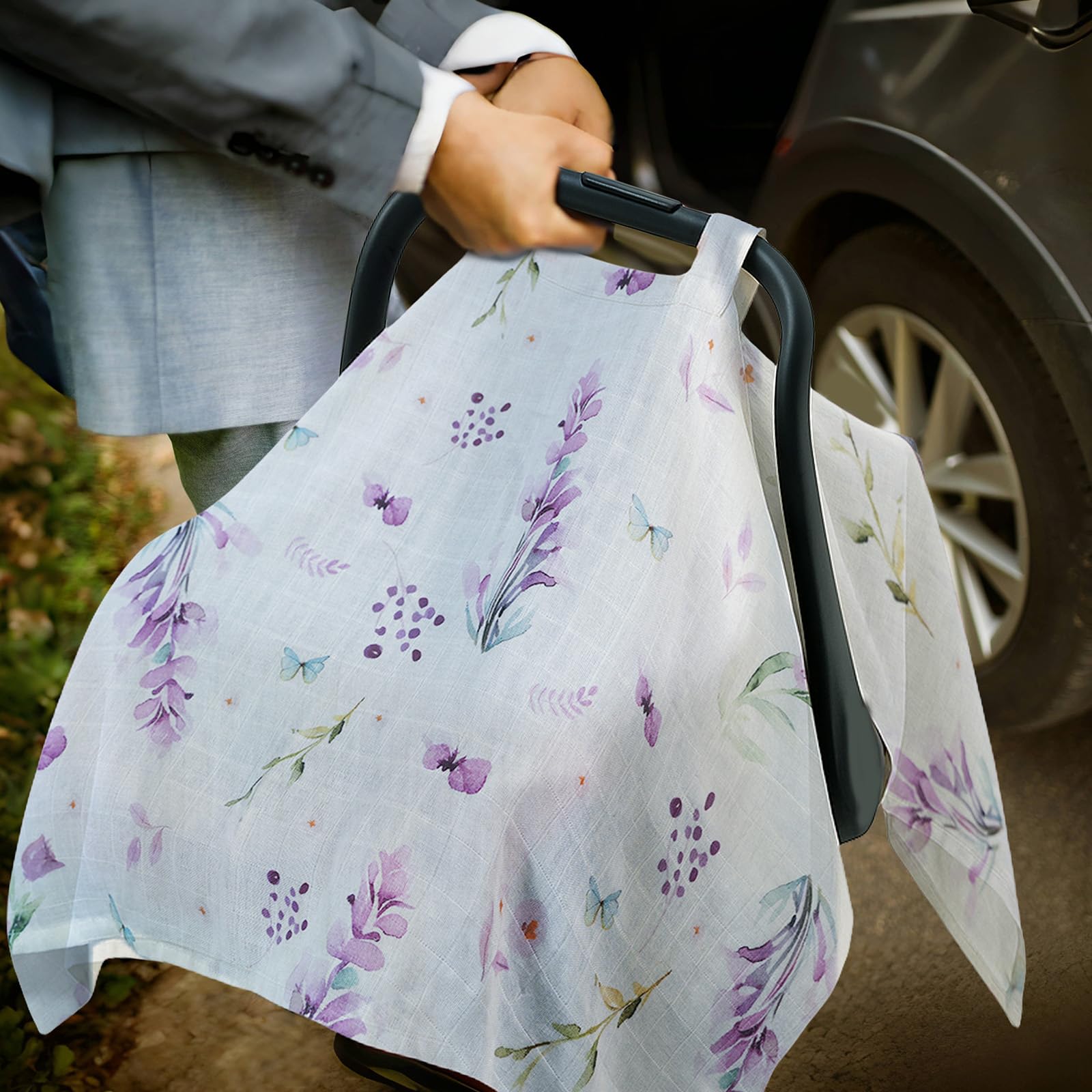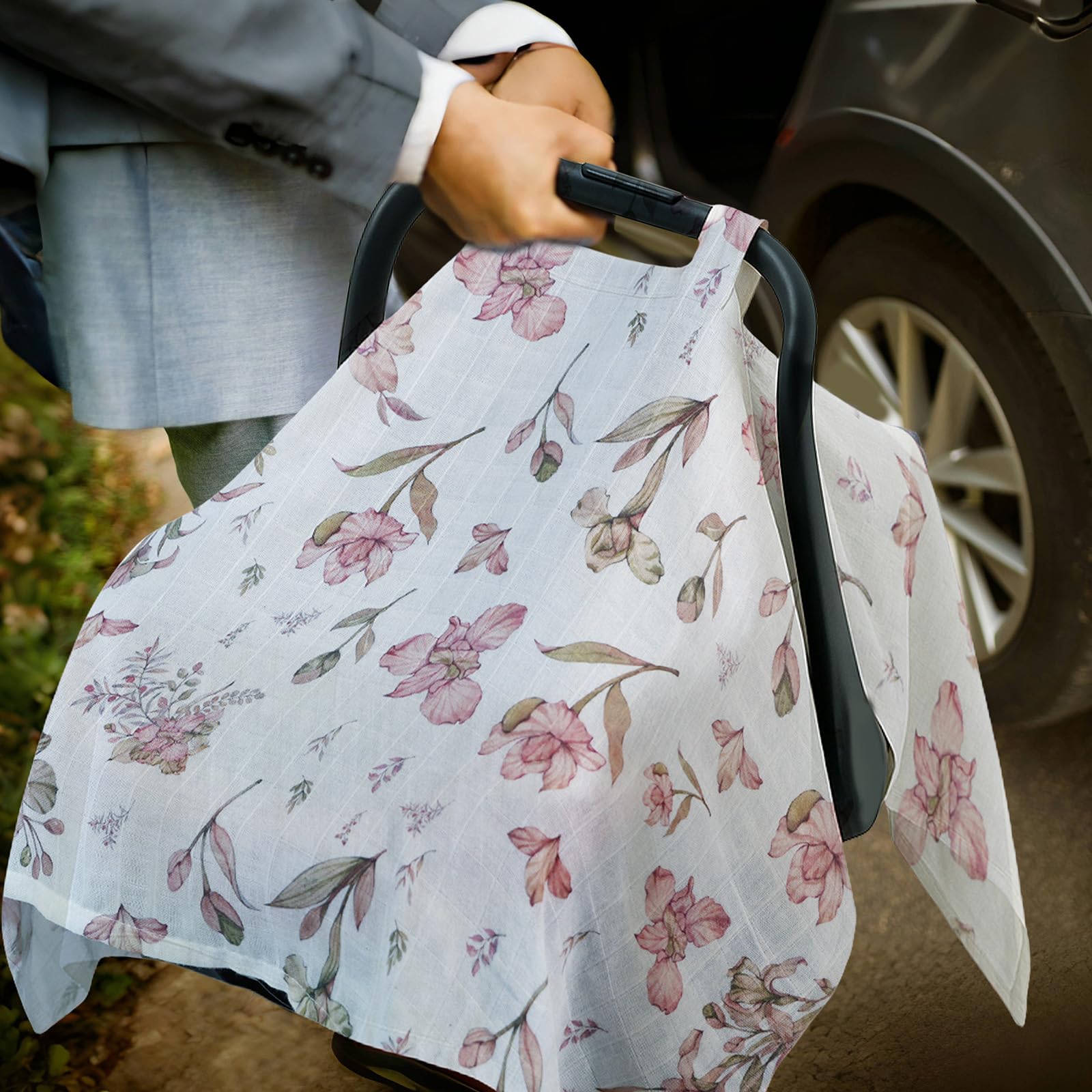 100% Muslin Summer Baby Car Seat Cover, Universal Fit Infant Car Seat Canopy, Breathable & Lightweight Sun, Weather Protection for Boys & Girls