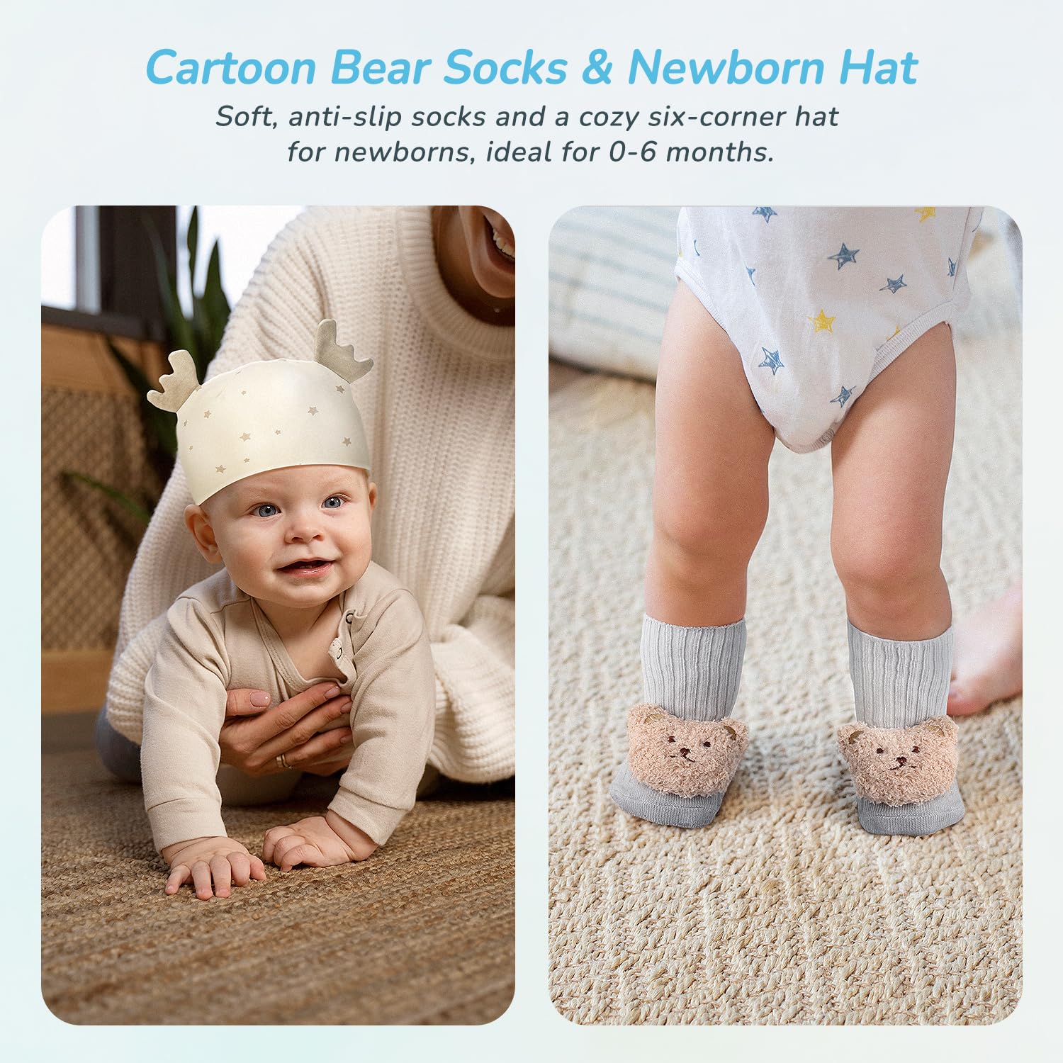 High-quality combed cotton, anti-slip dots, smooth seams, soft cuffs for Spring Fall. 3.2in long, fits baby between the age 0-6 months.