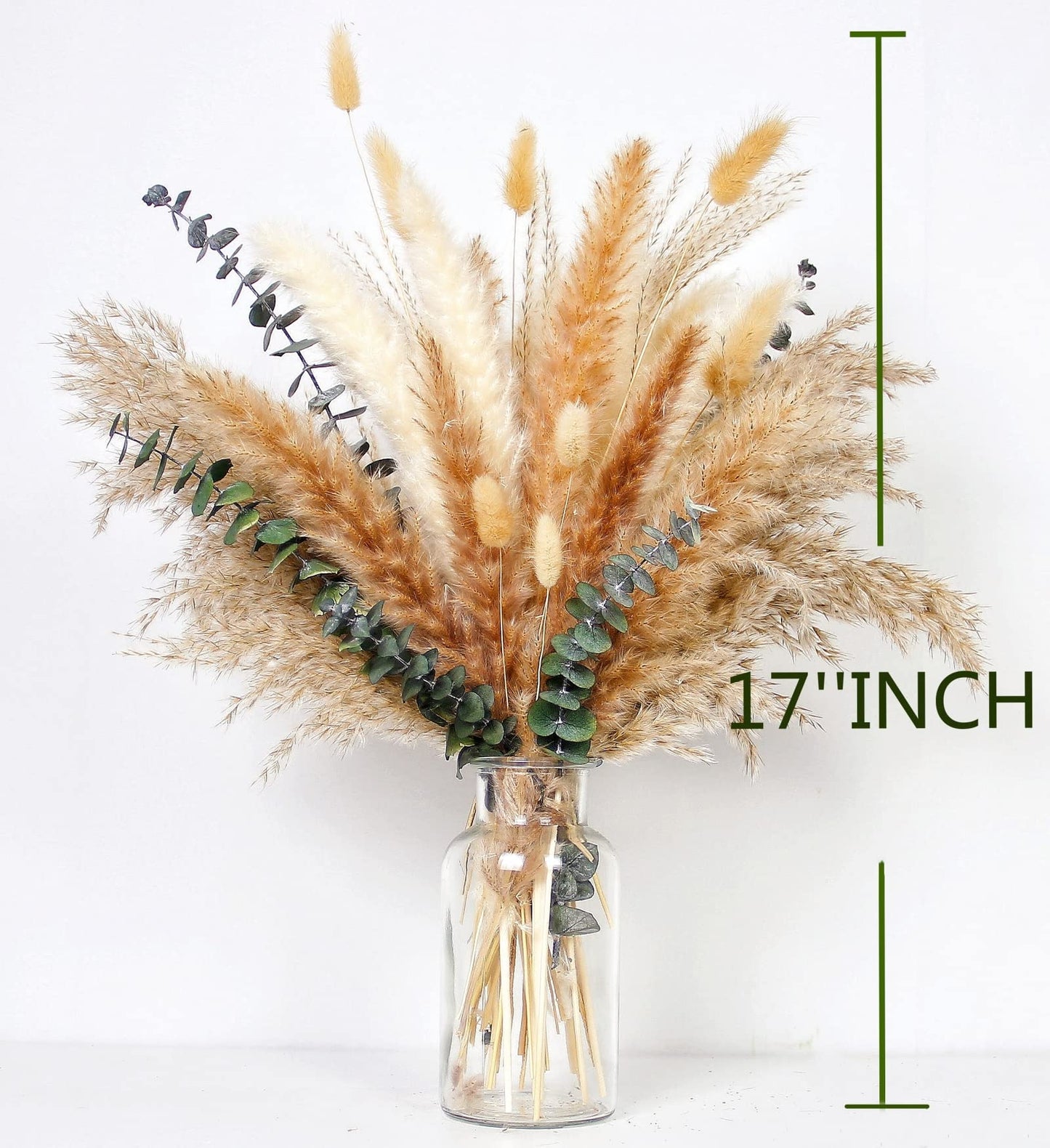 - Pampas Grass Bouquet Decor: The dried pampas grass eucalyptus bouquet measures 14 to 17 inches in length. It has been air-dried, picked, and treated with mixed leaves to enhance its appearance. These pompas are suitable for most home vases as decor. The dried flowers have a fluffy and elegant look, while the mini pampas grass adds a touch of beauty.