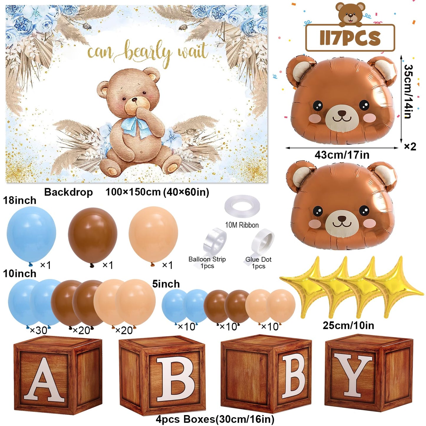 117 Teddy Bear Baby Shower Decorations for Boy Birthday Supplies Brown Blue Balloon Garland Kit Wood Grain Boxes with Letters Bearly Wait Backdrop Bear Theme Baby Shower Decor