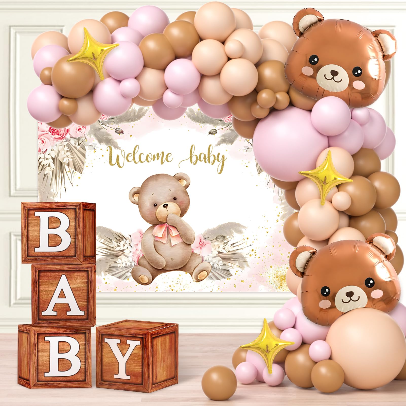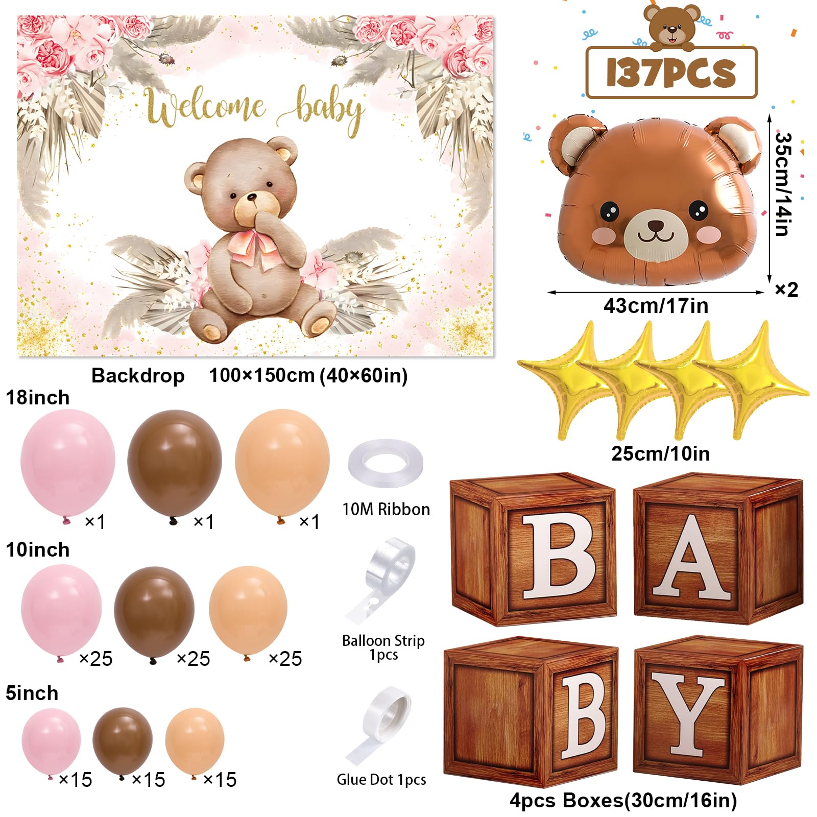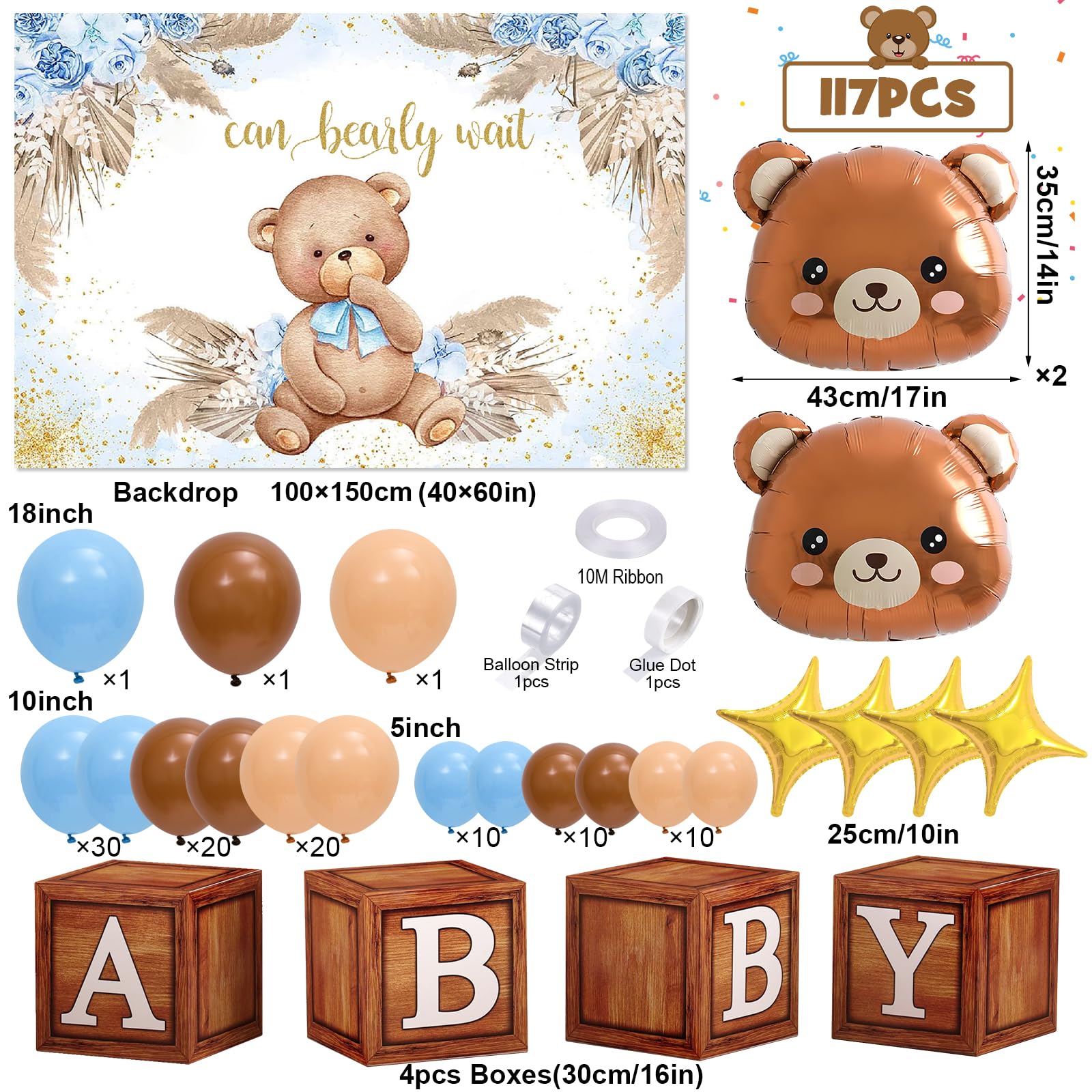 - COMPLETE BEAR BABY SHOWER DECORATIONS KIT: Our teddy bear baby shower decorations boy kit includes 4 baby boxes with letters for baby shower, 1 bearly wait backdrop, 2 bear heads and 4 gold four pointed star foil balloons, 103 latex balloons (3 colors, 5"+10"+18") with 3 tools. Have a teddy bear baby shower to express expectations for the baby