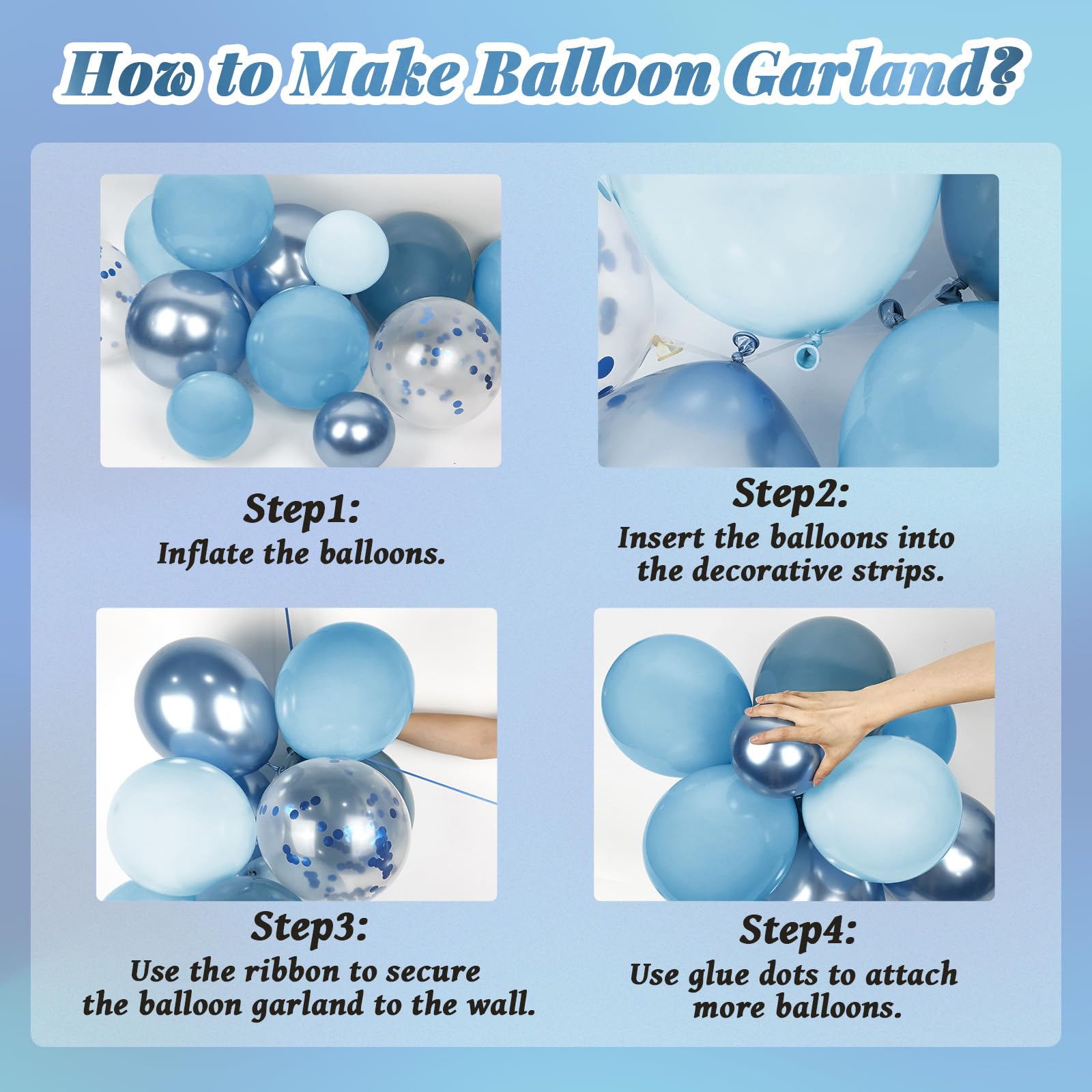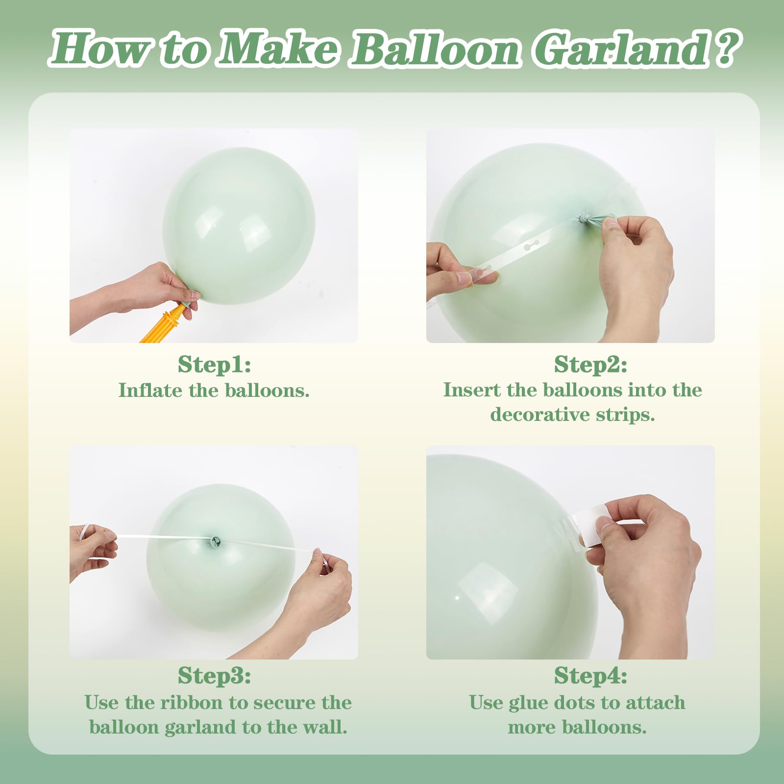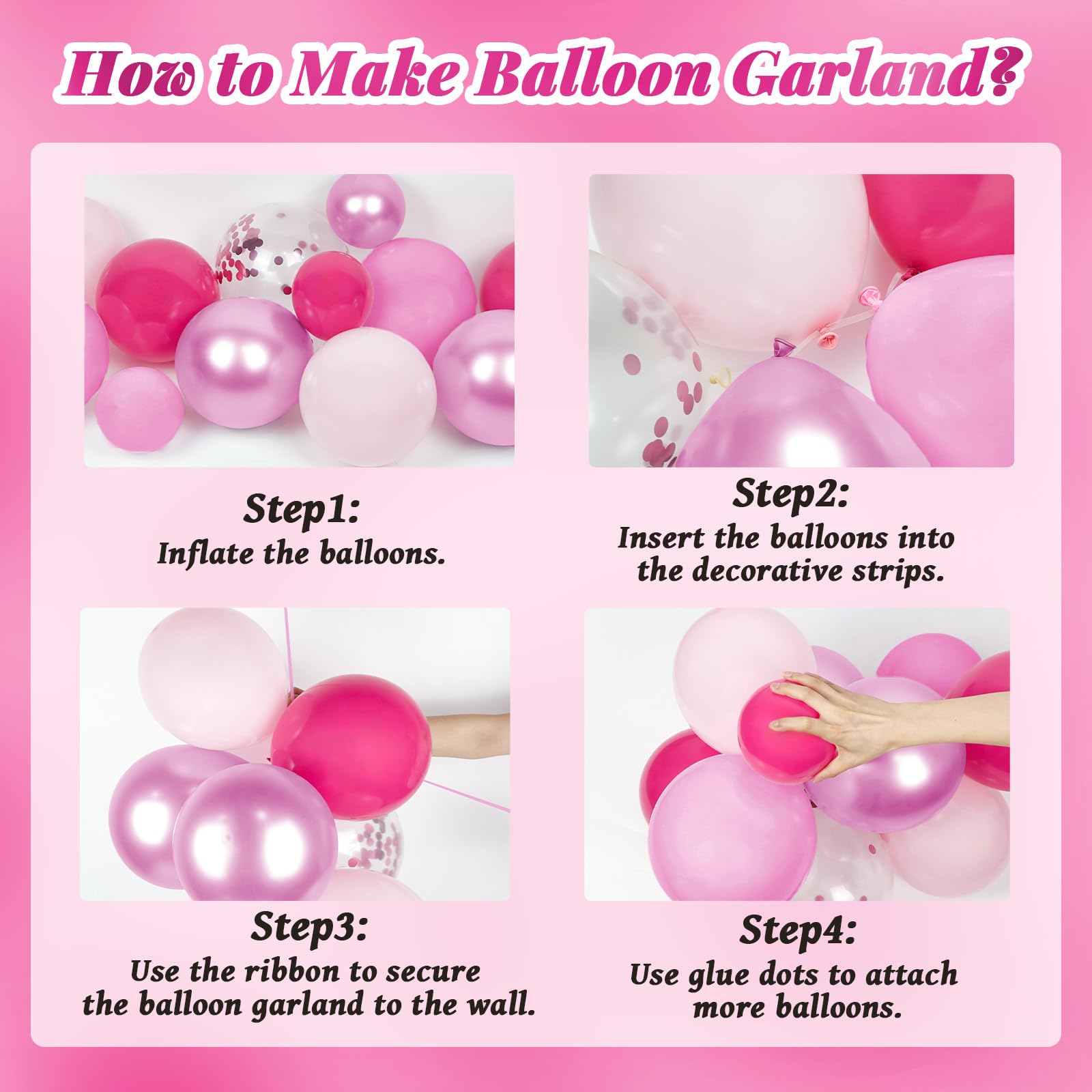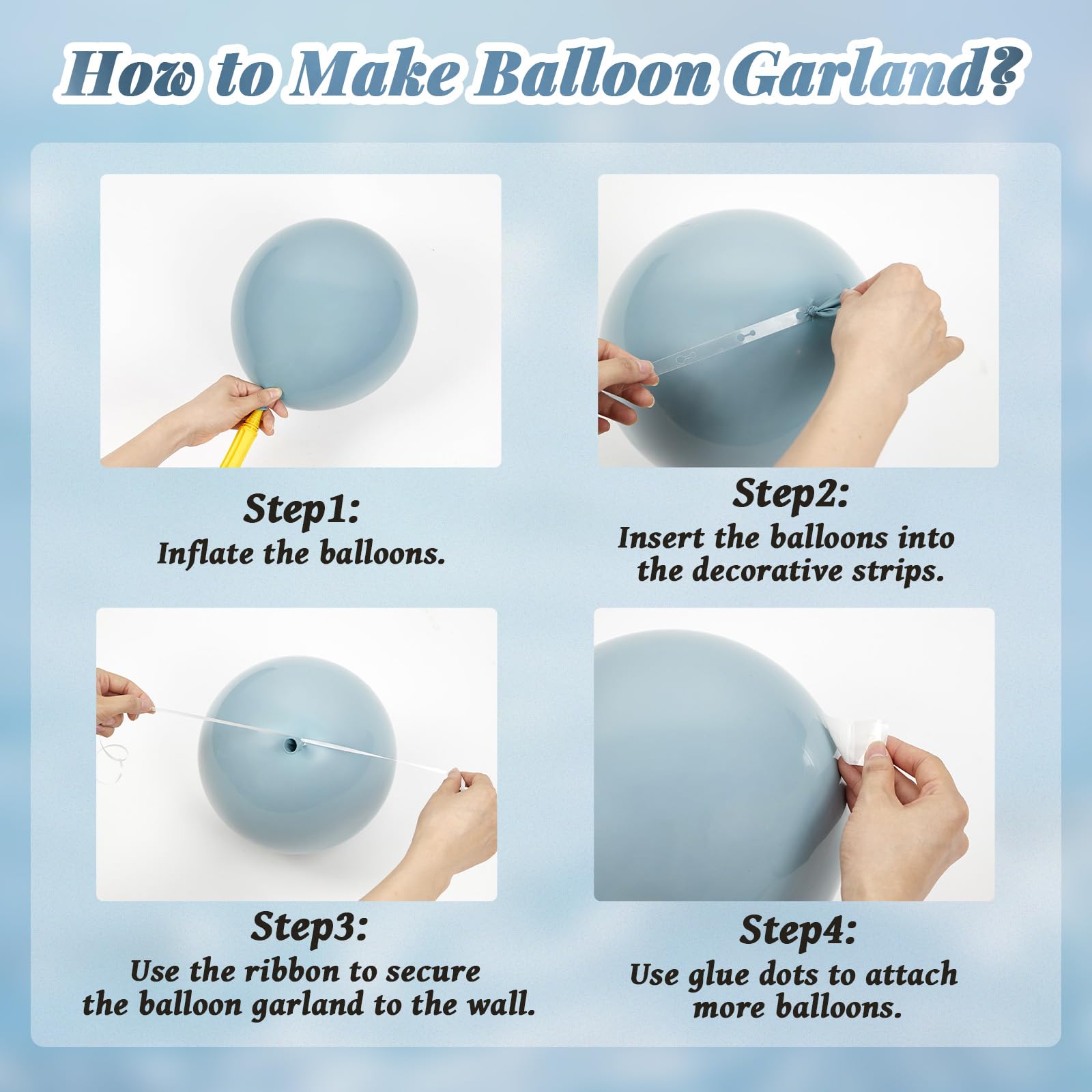 - Ease of Assembly:The balloon kit have ribbon, glue dot, decorative strip to help complete balloon arch kit more easily. first, Inflate the balloons with pump, crossing each other to form some balloon clusters. Then, insert the balloon knot into the decorative strip hole, or tie them together with ribbon to form balloon arch. Finally, hang it on the party backdrop, use glue dots to attach 5 inch balloons to fill gap area
