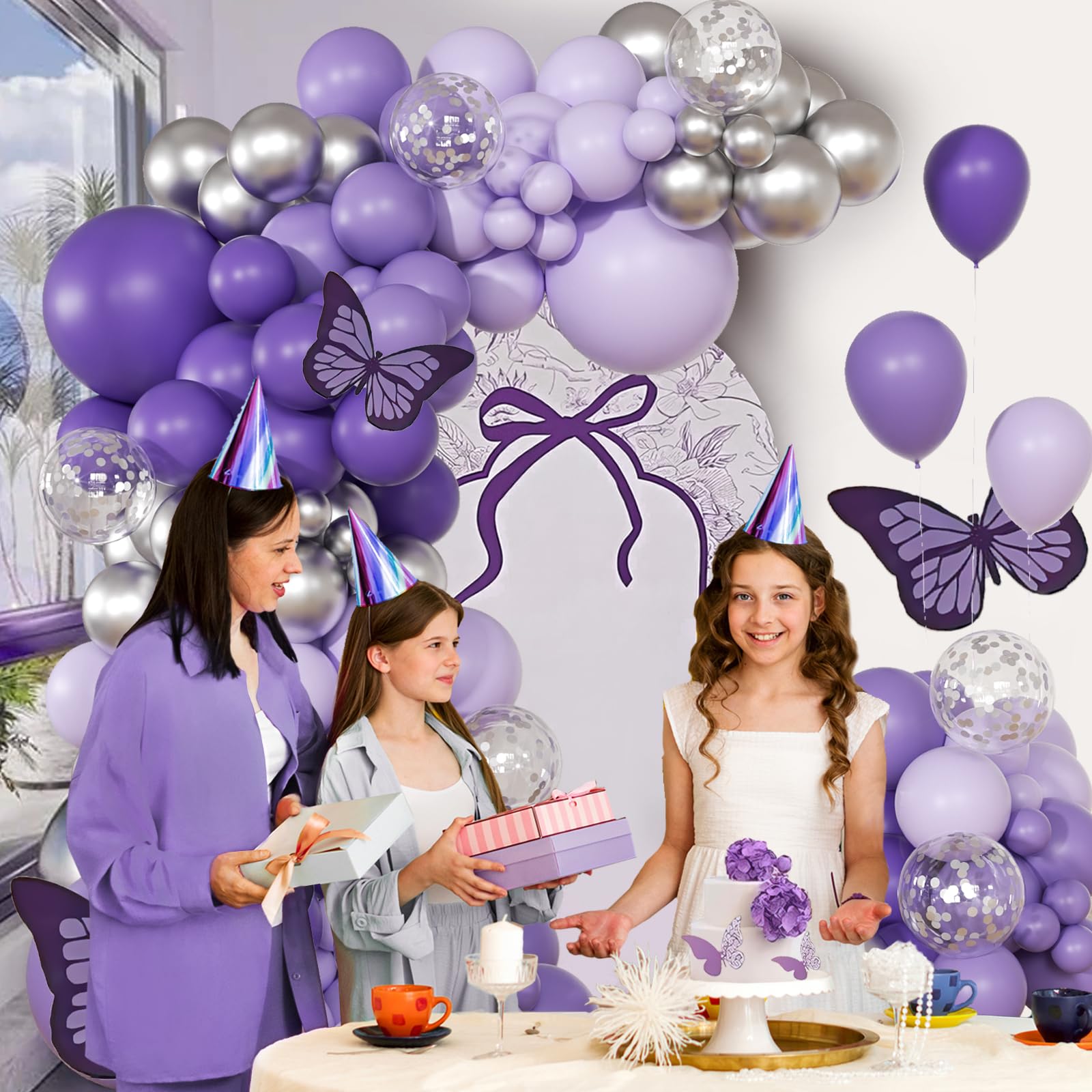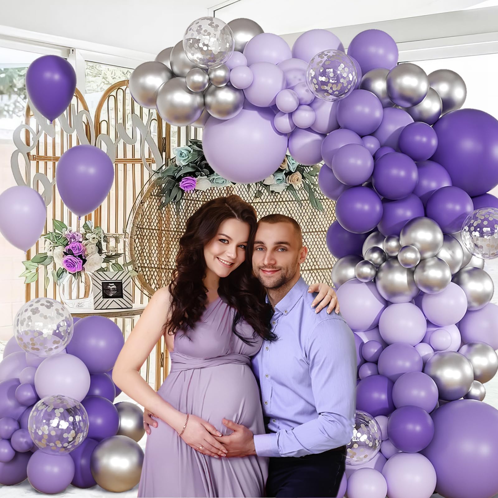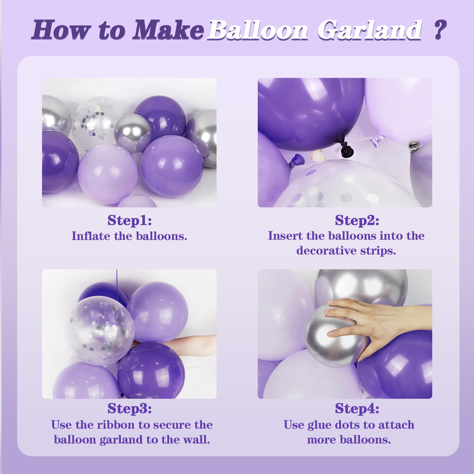 - Package Include:The purple balloon arch include 26pcs dark purple balloons(18inchx1, 12inchx5, 10inchx10, 5inchx10), 41pcs pastel purple balloons(18inchx1, 12inchx5, 10inchx15, 5inchx20), 41pcs light balloons(18inchx1, 12inchx5, 10inchx15, 5inchx20), 30pcs metallic silver balloons(12inchx5, 10inchx10, 5inchx15), 12inch silver confetti balloonsx5, ribbonx2, glue dotsx100, decorative stripx1