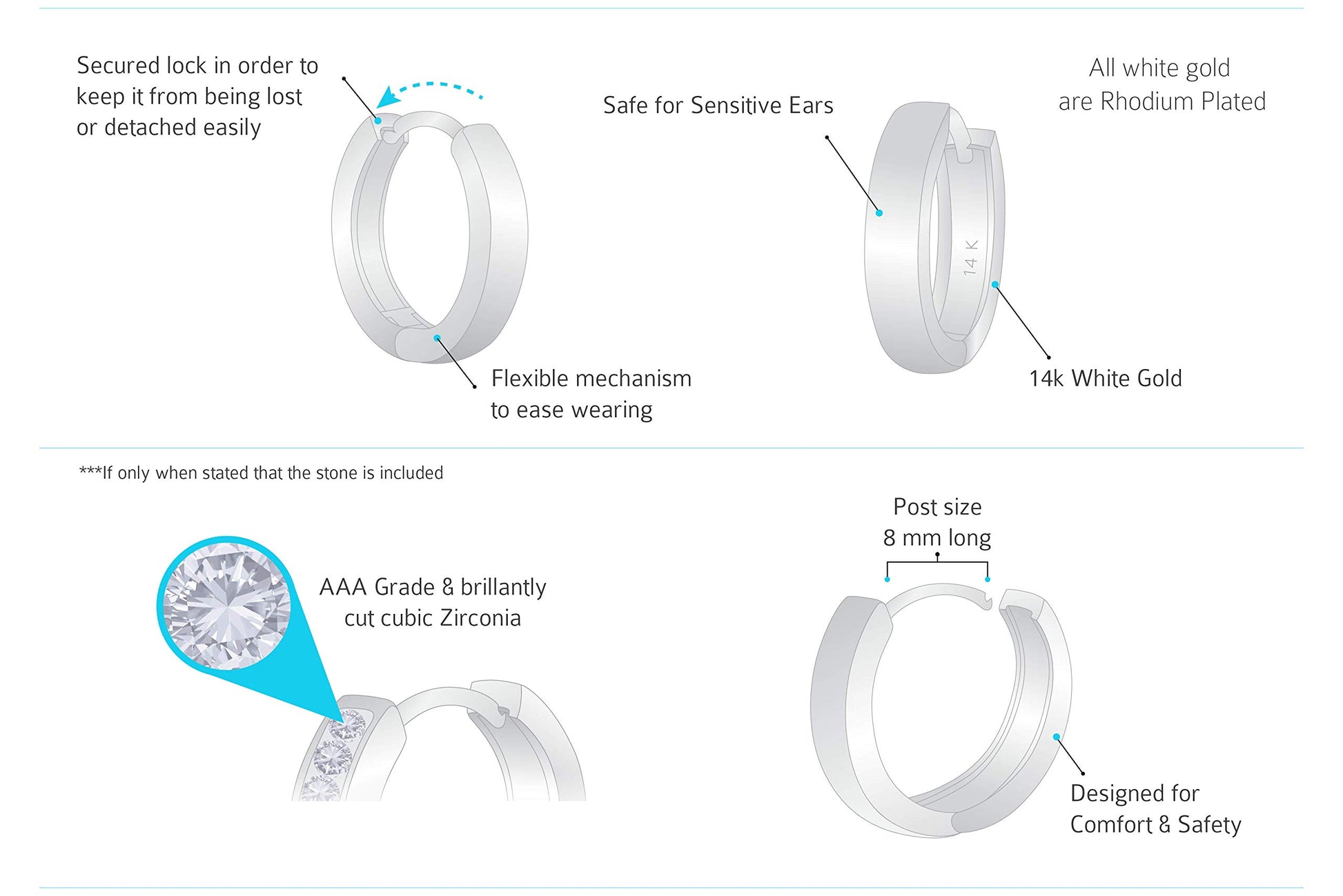 These beautiful earrings are composed of 14k gold (58.5% of pure gold). High polished for long lasting shininess and durable quality. CZ accents fulfill its delicateness and further deliver its brilliant look. The screwback is a safety back that screws on and locks thus preventing for any poking in the back of the earlobe and lessening chances of lost earrings.