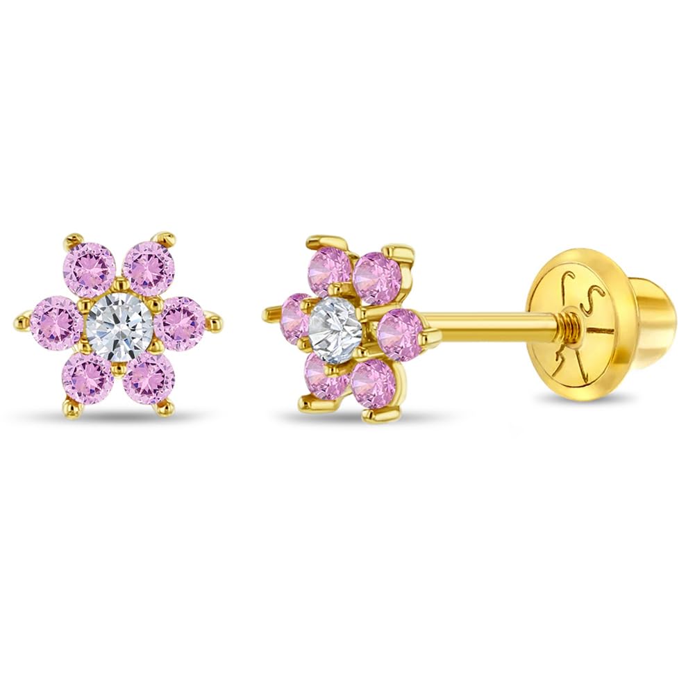 - Earring Size: 6mm flower, (pink, clear) cubic zirconia; 7mm threaded earring post; recommended for ages 6m-6 years
