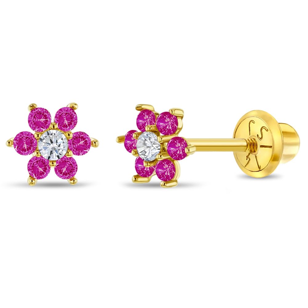 14k Yellow Gold Colorful Cubic Zirconia Flower Studs - Screw Back Earrings for Toddlers & Little Girls - Casual & Sparkly Flower Earrings for Children