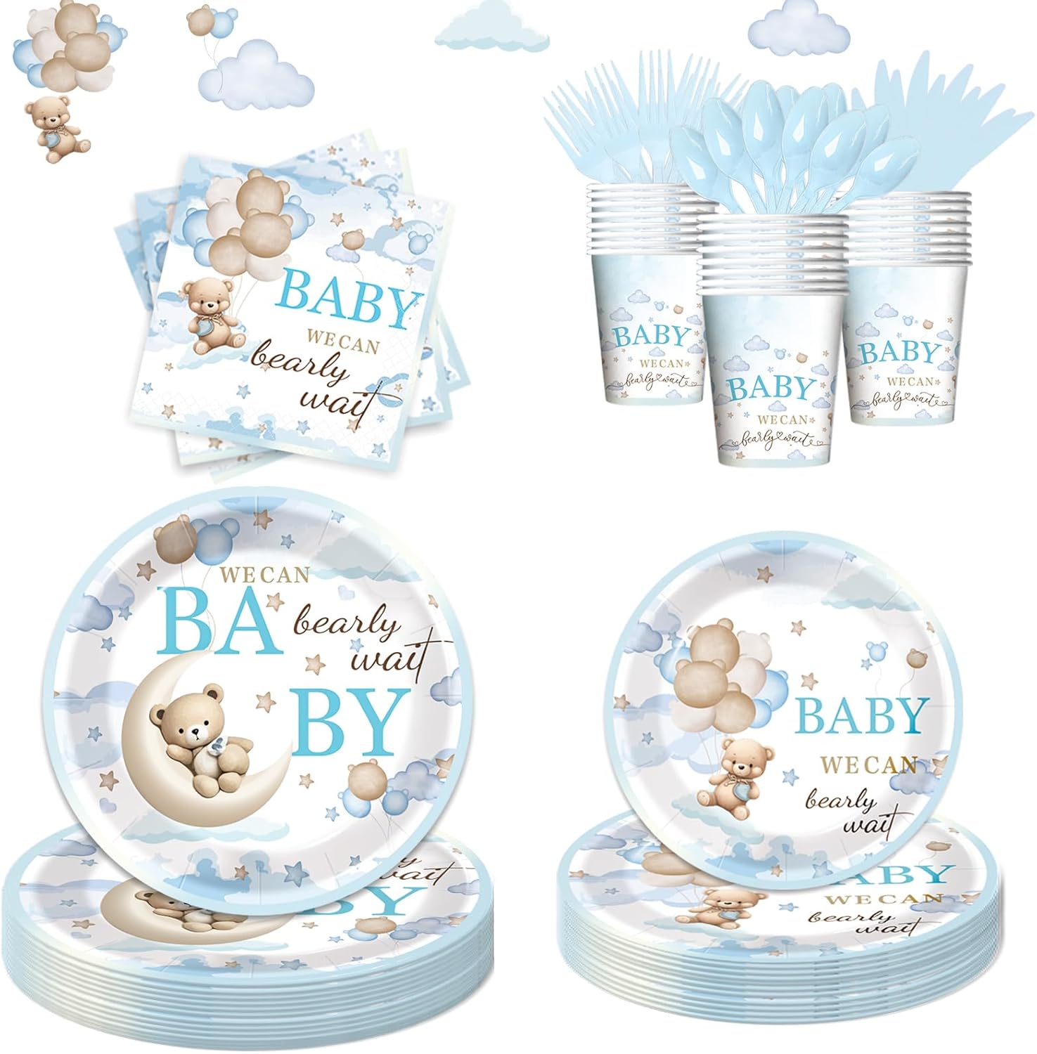 168pcs Bear Party Plates, Bear Birthday Decorations & Baby Shower Supplies - Bear Themed Plates, Cups, Napkins for "We Can Bearly Wait" Baby Shower Decorations, Kids Party Supplies