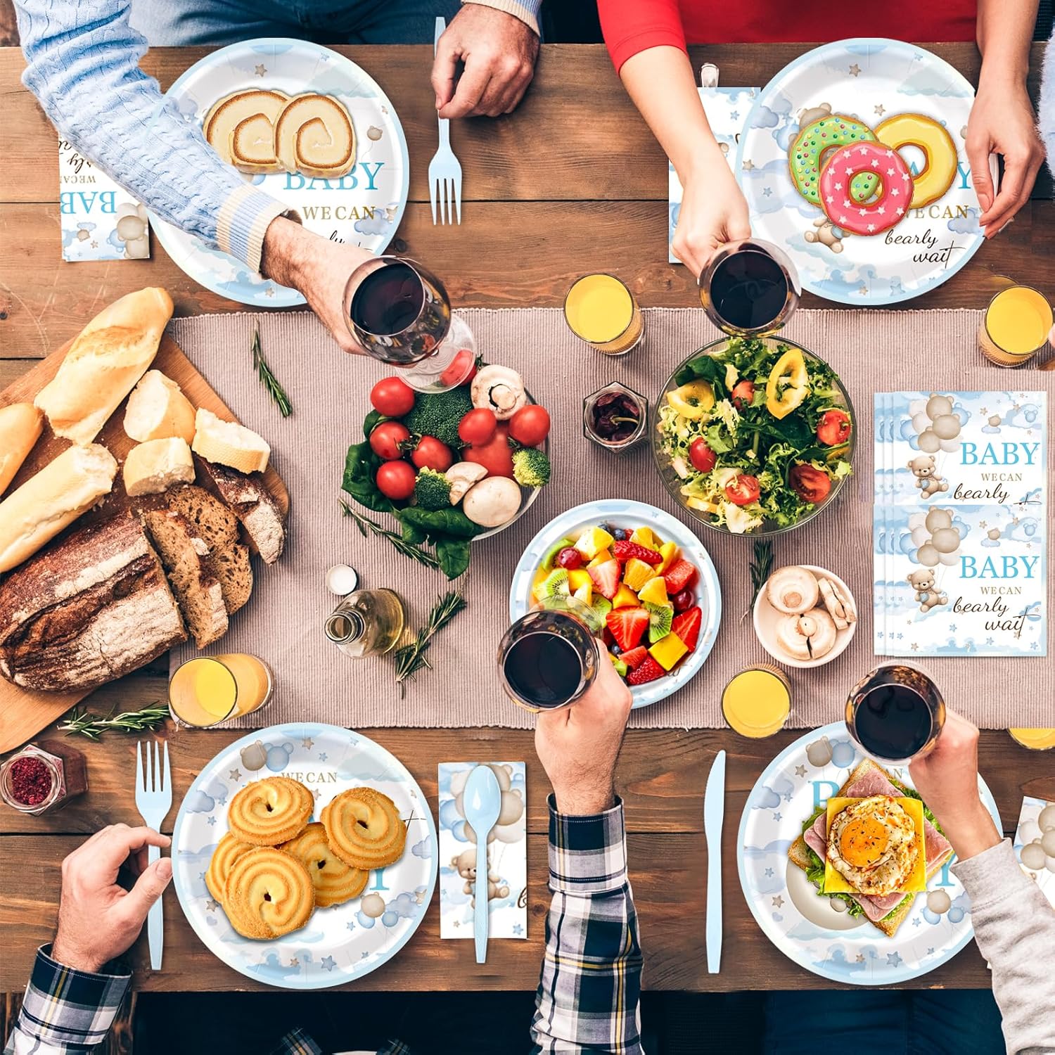 - Complete 168PCS Bear Baby Shower Set – Includes 24pcs 9'' dinner plates, 24pcs 7'' dessert plates, 24 sets of forks, knives, spoons, and 24 napkins. Perfect for baby showers, birthdays, and themed parties.