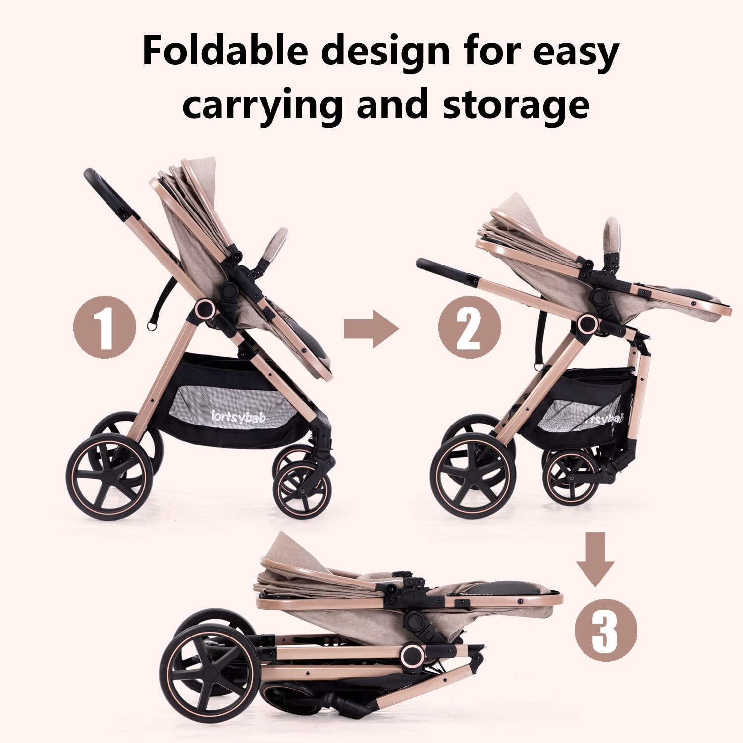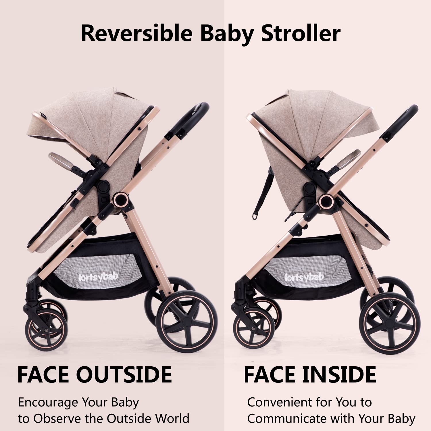 2-in-1 Baby Stroller with Bassinet Mode - Folding Infant Newborn Pram Stroller with Reversible Seat - Toddler Strollers for 0-36 Months Old Babies (Beige)