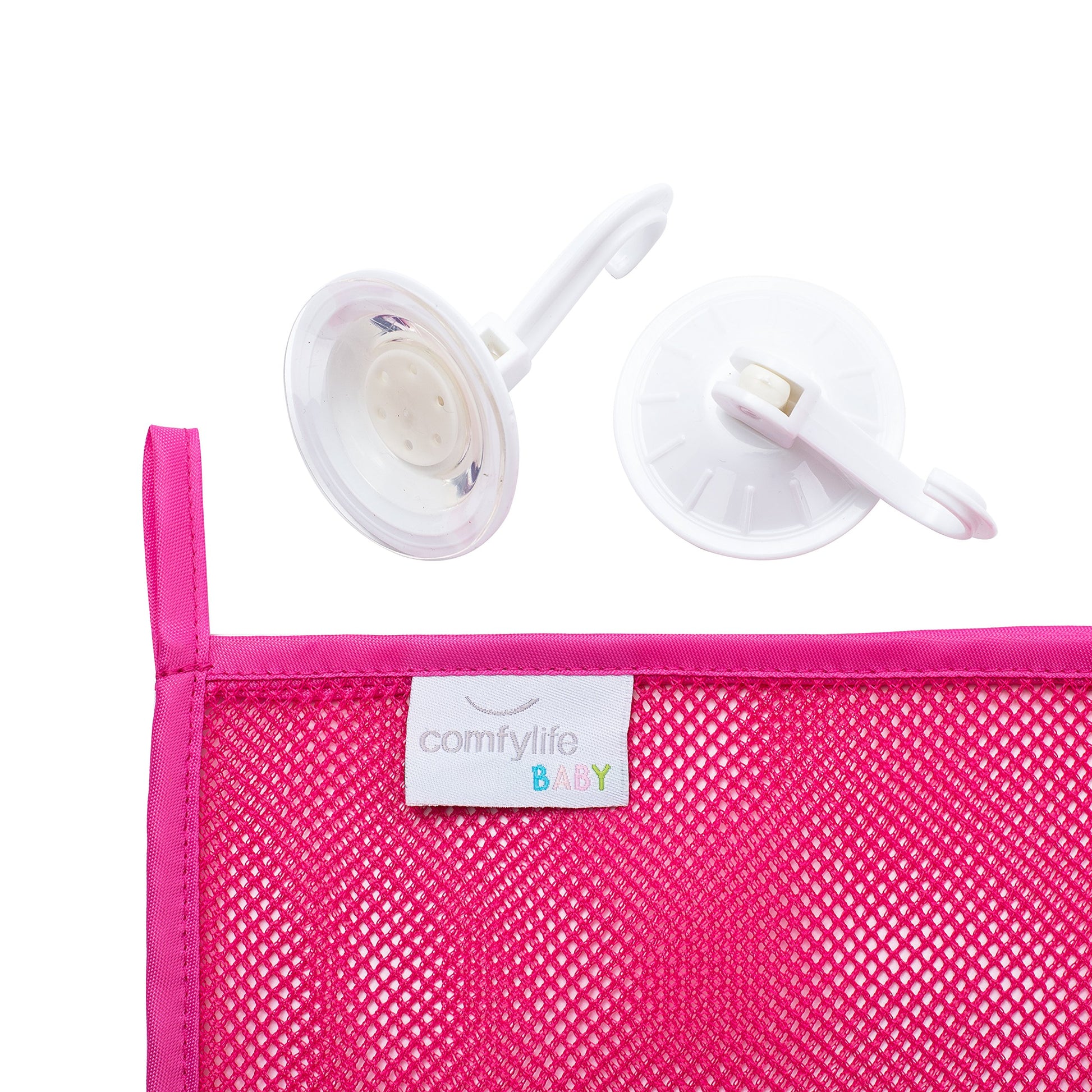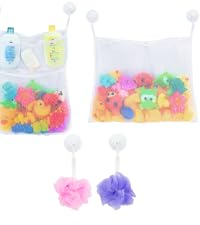 - STRONGER MESH HOLDS MORE TOYS! We only use the highest quality mesh, fast drying polyester edging, and large, powerful suction cups. Our mesh bags are large enough and tough enough to hold all of your baby's toys and your bathroom essentials. The bag stays close to the tiles too so it doesn’t get in your way and clutter up the tub