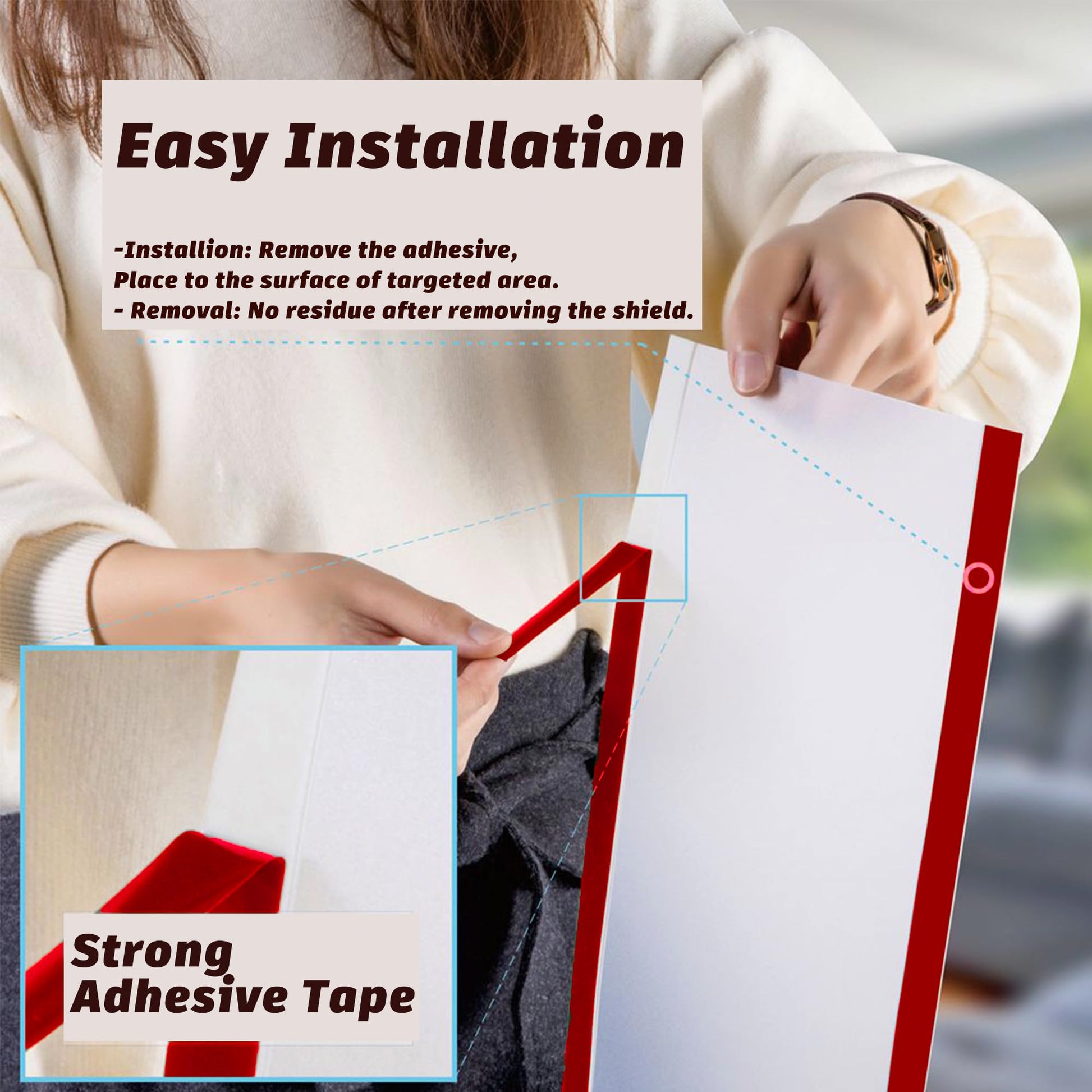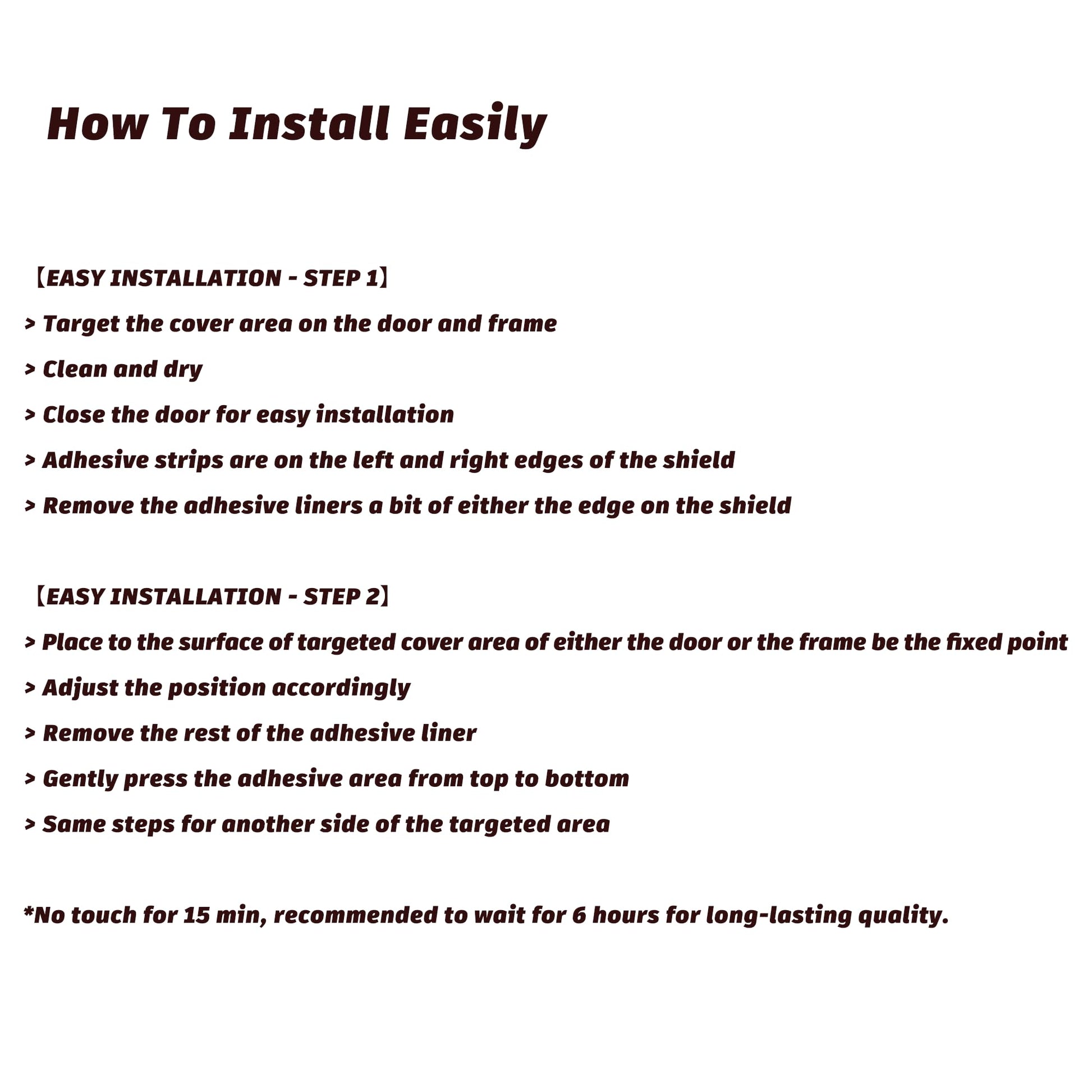 - 【Easy Installation - Step 1】Target the cover area on the door and frame > Clean and dry > Close the door for easy installation > Adhesive strips are on the left and right edges of the shield > Remove the adhesive liners a bit of either the edge on the shield.