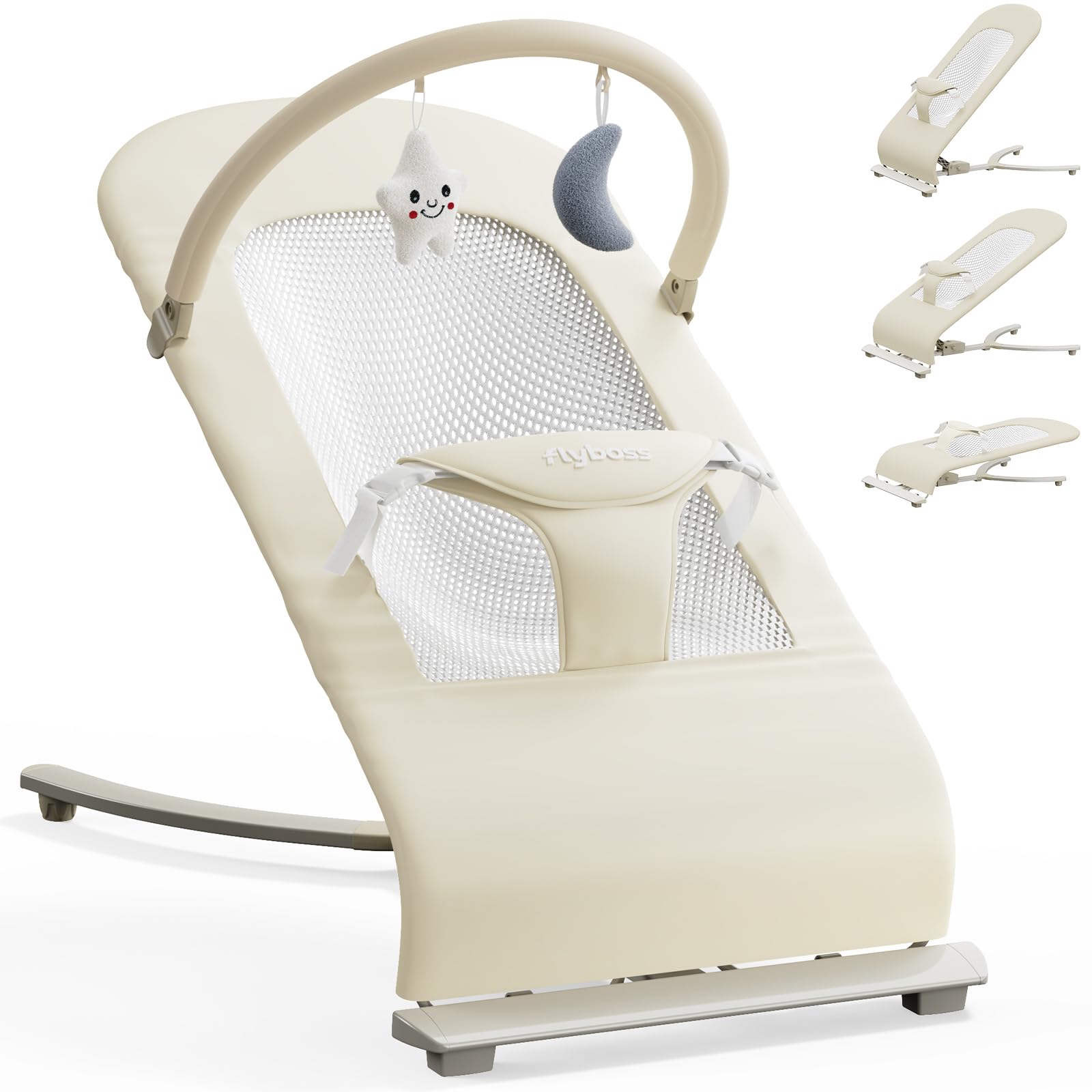 - 【3-Level Easy Adjustment】Customize the baby bouncer’s angle to suit your baby’s needs: the lowest level for relaxation, the middle position for playtime, and the highest level for feeding or sitting upright. The one-hand adjustment makes it effortless to find the perfect position
