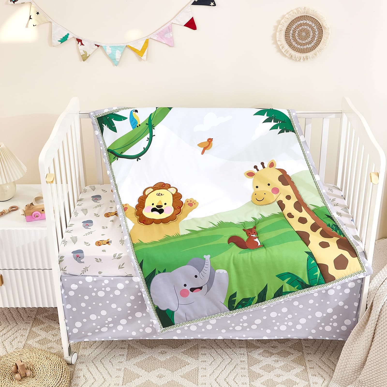 - 3-Piece Complete Set - This crib sets for boys includes a 35x45 inches crib comforter, a 52x28x8 inches crib sheet suitable for standard size crib, and a 52x28 inches crib skirt with 14 inches layer hem. We use non-compressed packaging to make the crib bedding more fluffy and soft, giving your baby a better experience