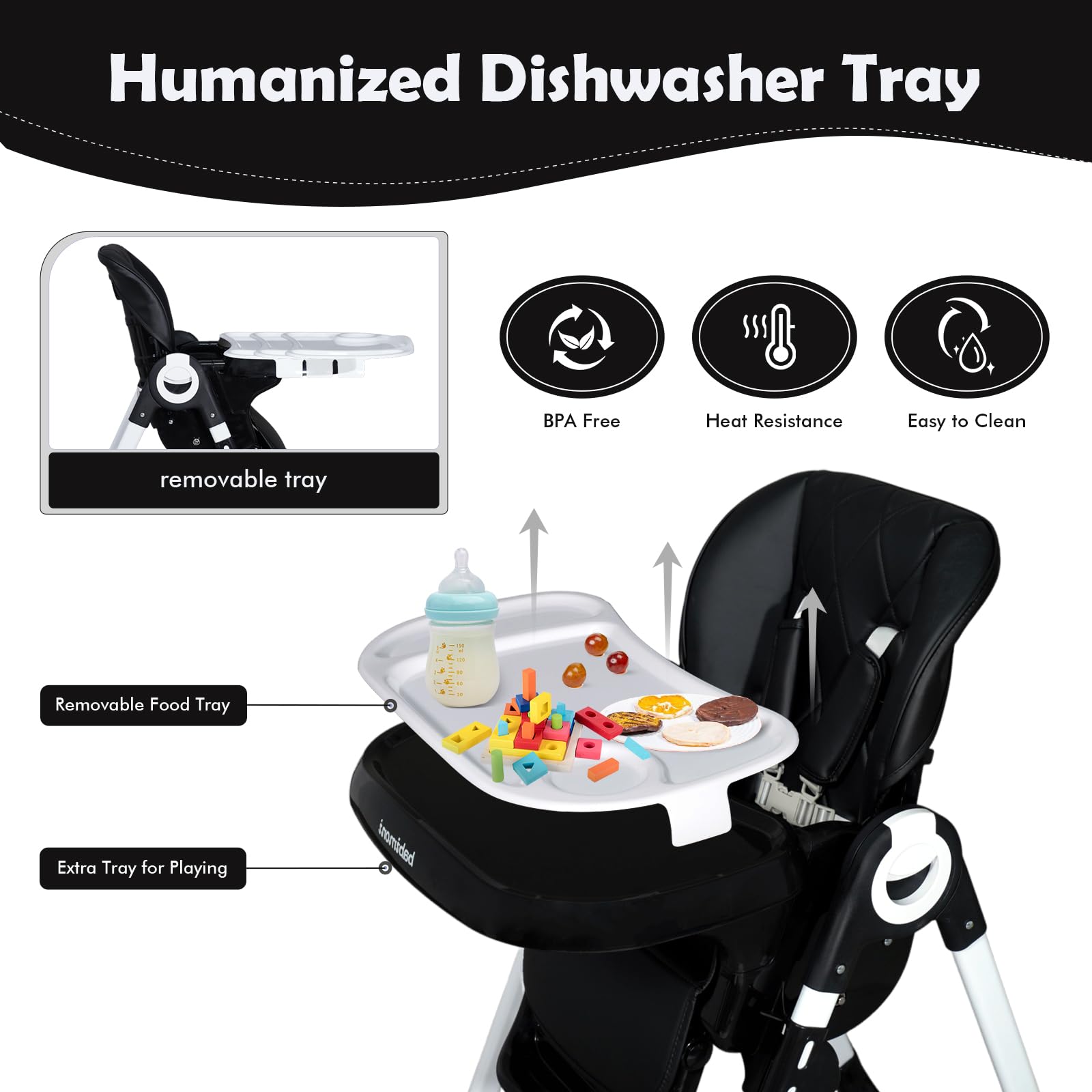 - Easy to Clean: The removable tray and seat cushion make maintenance of the wipeable high chair effortless. Dishwasher safe PP trays and wipeable PU leather cushions ensure that the easy clean high chair is cleaning. This would be the best option for busy families.