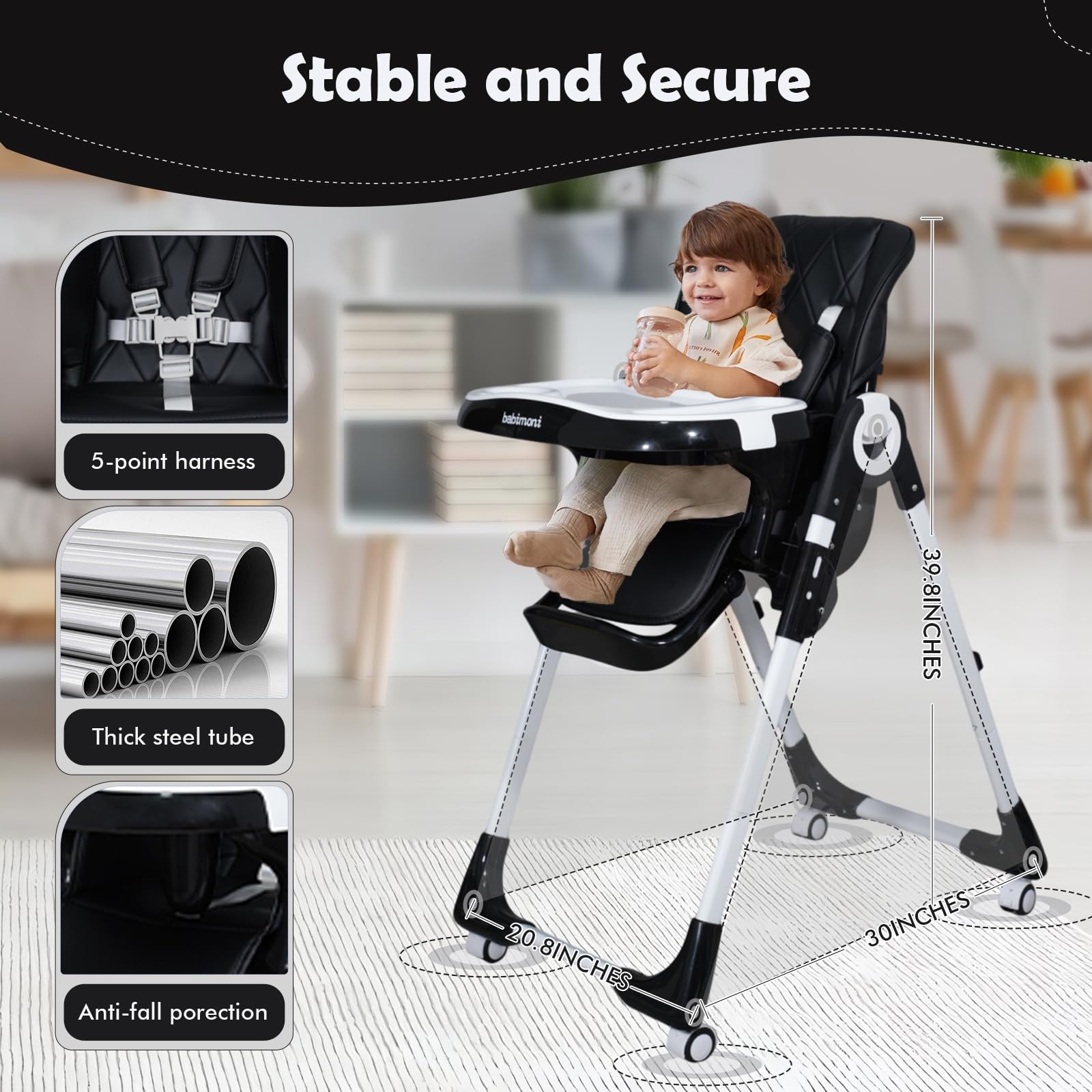 - Safe and Secure: Our baby high chairs is made of durable steel tubing to ensure stability. Adjustable 5 point harness and smooth, edge-free corners, it ensures your baby's safety. So parents can rest assured your baby is safe while eating.