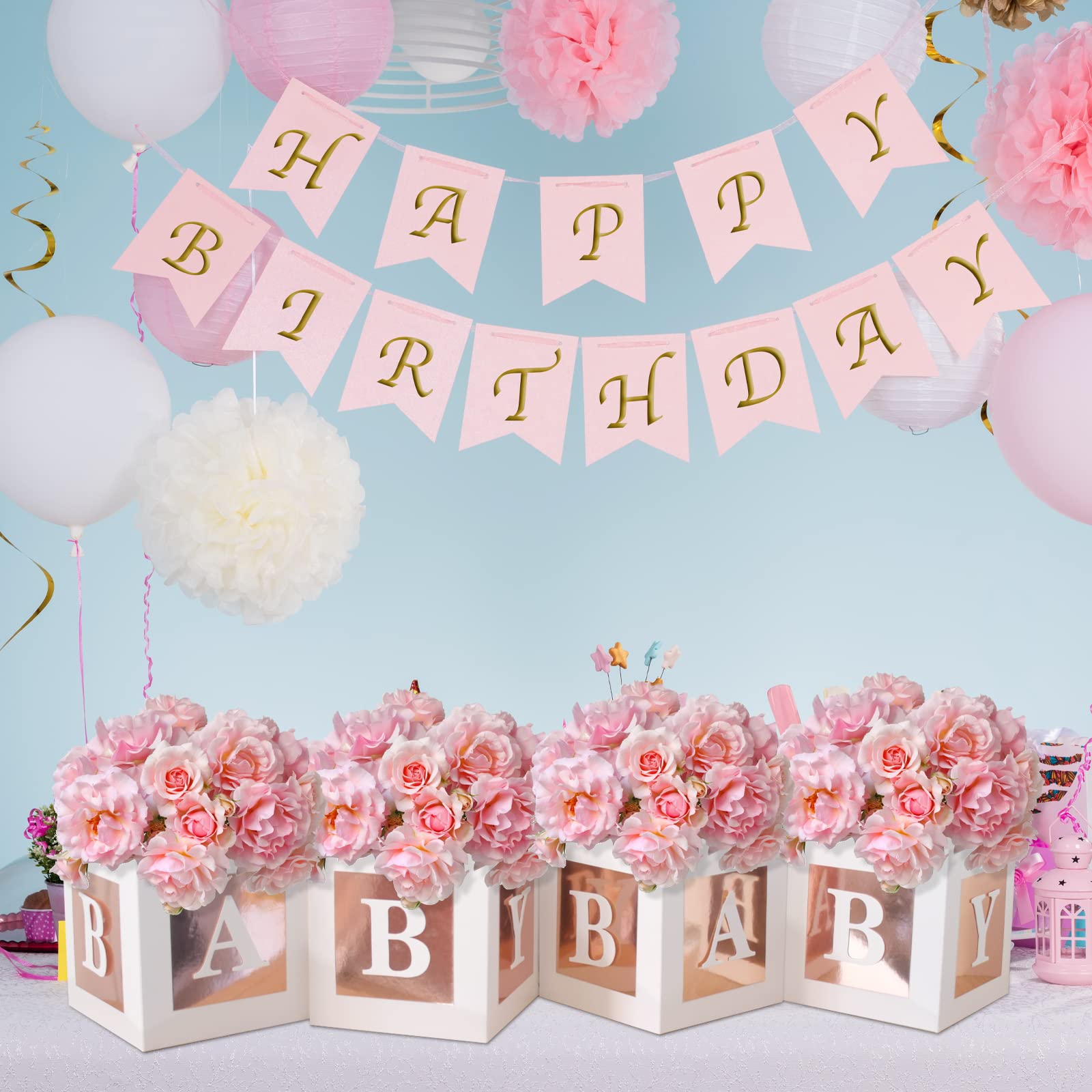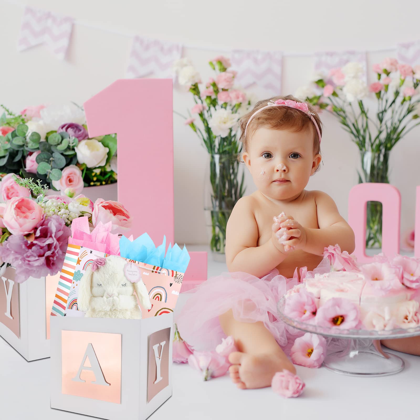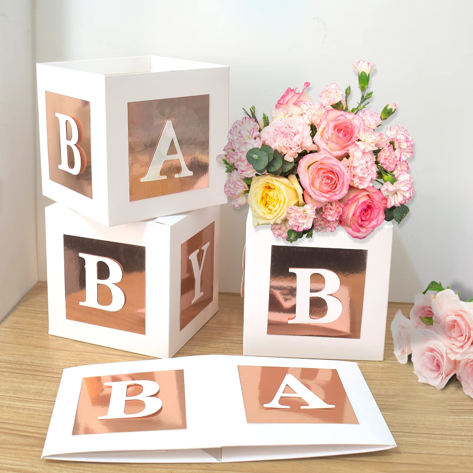 - ✔SET OF 4 BABY SHOWER BOXES: Package includes 4 pcs bronzing cardboard boxes(each with 4 letters). Flowers not included. Featuring delicate blooms and the rose gold Baby block centerpiece decor, make your baby shower event is packed with details to adore.