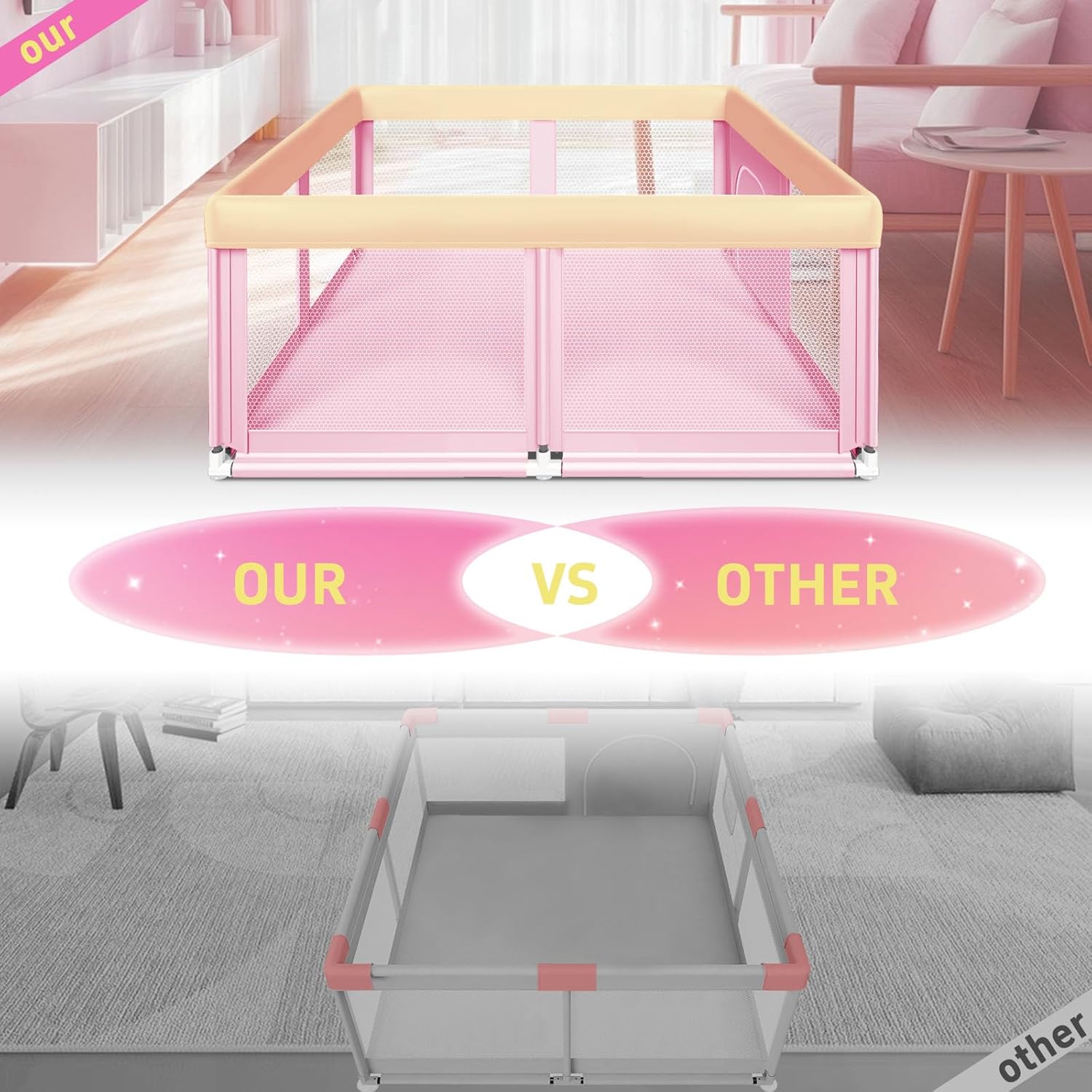- [PINK PRINCESS STYLE] Do you have a preference for pink? Our pink baby playpen is made for little princesses who love pink. Place it in the pink princess room and add a touch of color to it. Play with the little princesses in the pink game fence, and your mood will be even more beautiful.