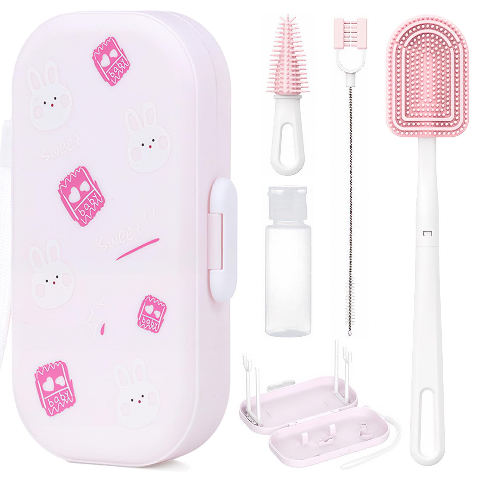 - Portable Bottle Brush Set - Includes silicone baby bottle brush, nipple brush, straw brush, drying rack, soap dispenser, and organizer.