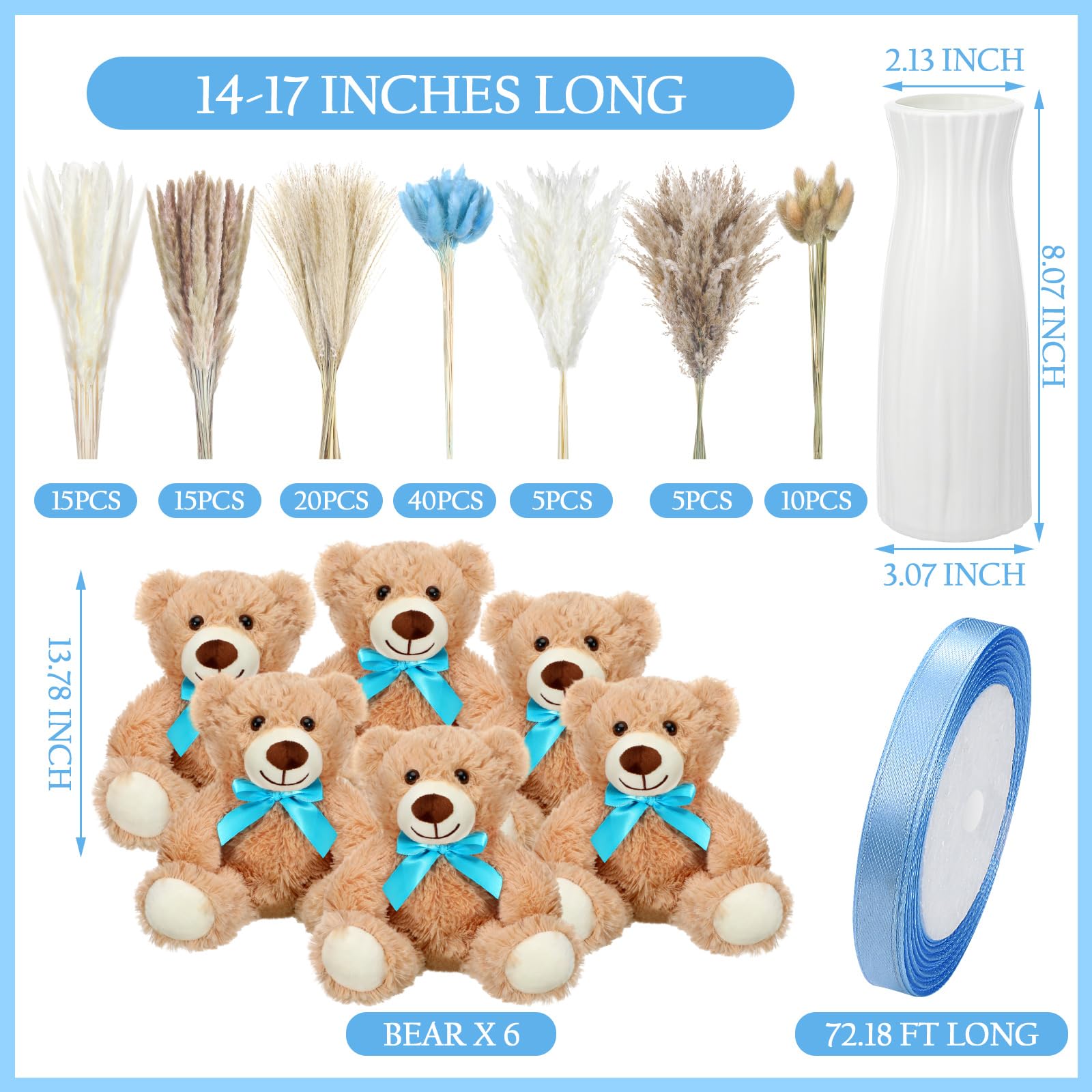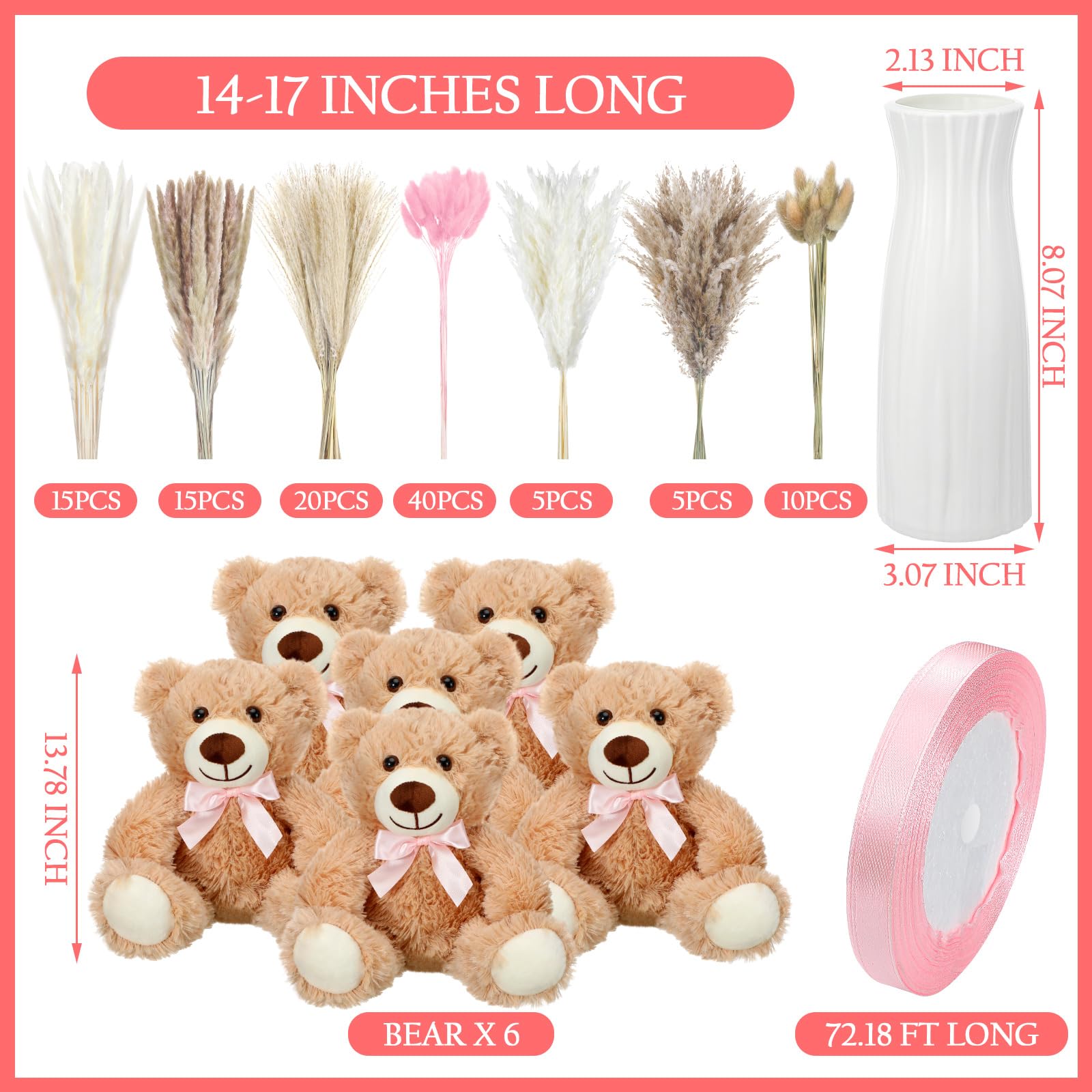 - Package Includes: the package includes 6 plastic vases, 6 stuffed plush bears, 1 ribbon and 110 artificial pampas, including 50 dried rabbit tail flowers, 20 mini reeds, 15 white rushes, 15 brown rushes, 5 white reeds, 5 brown reeds, nice in combination; When you open the carton, shake the bears and blow the fur gently with a hair dryer, you will see how fluffy and cute they are