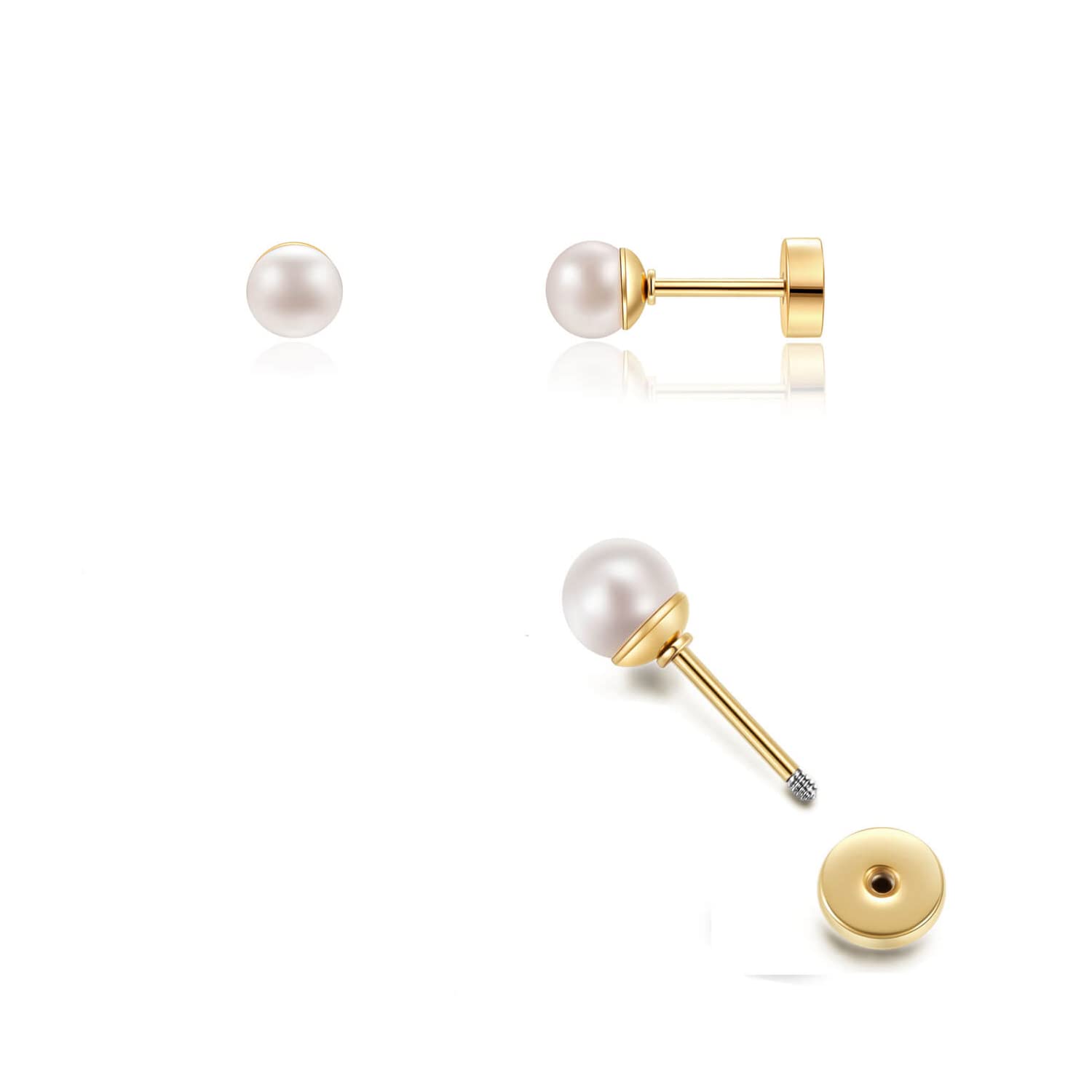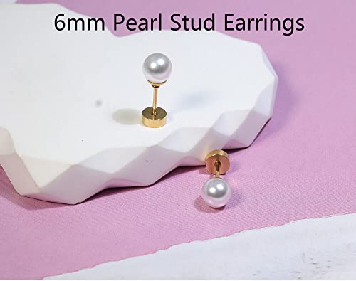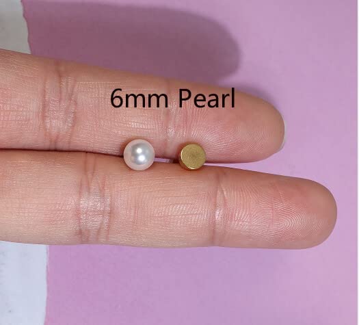 6mm Pearl Stud Earrings Flat Screw Back,14K Gold Pearl Cartilage Helix Earrings Hypoallergenic 316L Surgical Steel Piercing Jewelry Gift for Girls Women Toddlers(6mm Pearl, Gold)