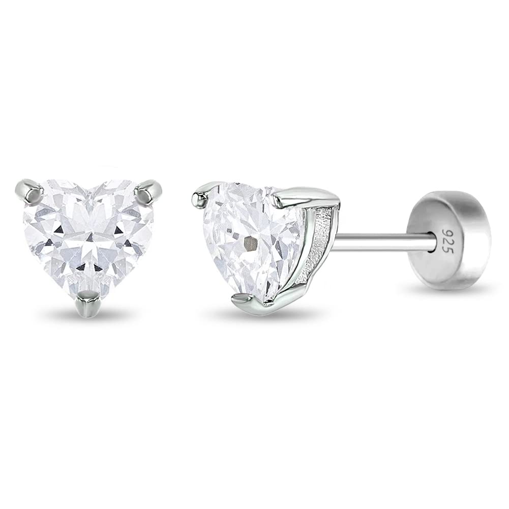 925 Sterling Silver Cubic Zirconia Heart-Shaped Solitaire Stud Girl's Earrings with Safety Push Back Locking 4mm- Excellent For Baby Girls, Toddlers & Young Girls- Best For Kids With Sensitive Ears