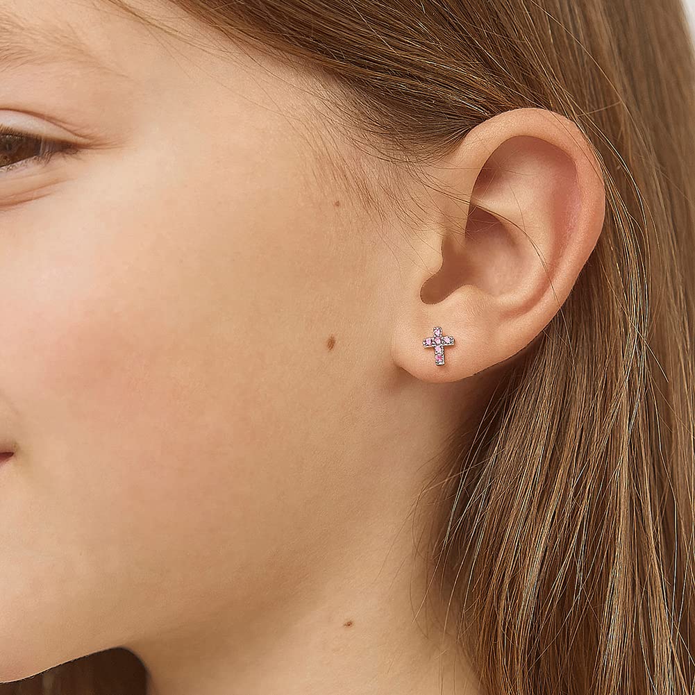- Earring Size: 6mm W x 7mm H cross (pink) stone; 9mm threaded earring post; recommended for children ages 1- 10 years
