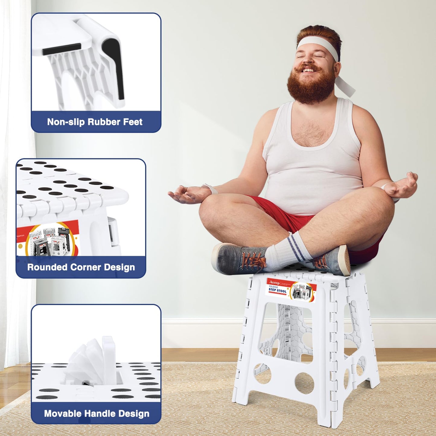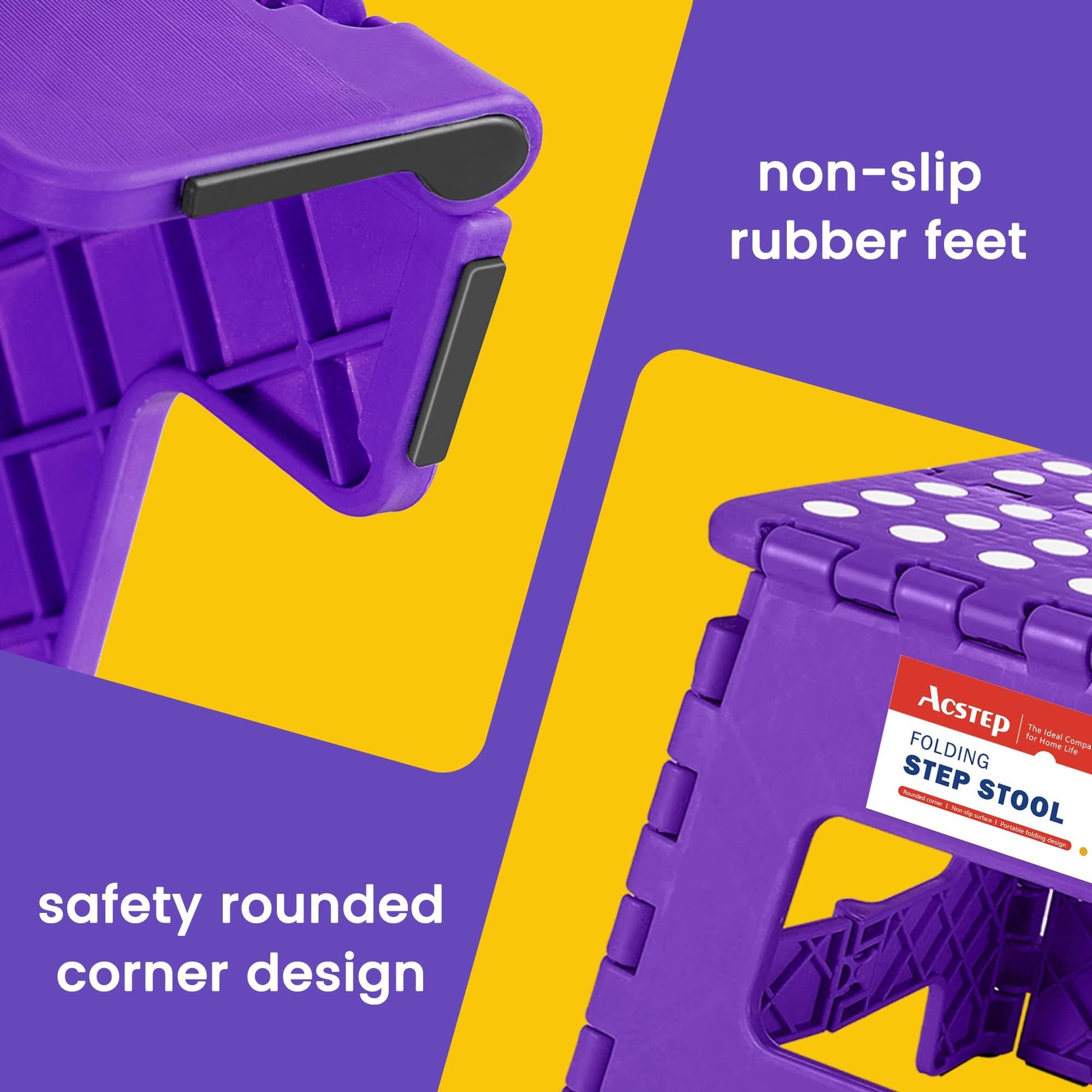 - ANTI SLIP - Special rubber dots on the surface and anti-slip black rubber strap on each foot for maximum foot grip and gives amazing comfort, preventing slippage. Unique, grip-dot textured surface makes the folding step stool safe for everyone. This safety features making the step stool great for multipurpose uses i.e. kitchen, bathroom, dining room, office, garden, camping, fishing and more.
