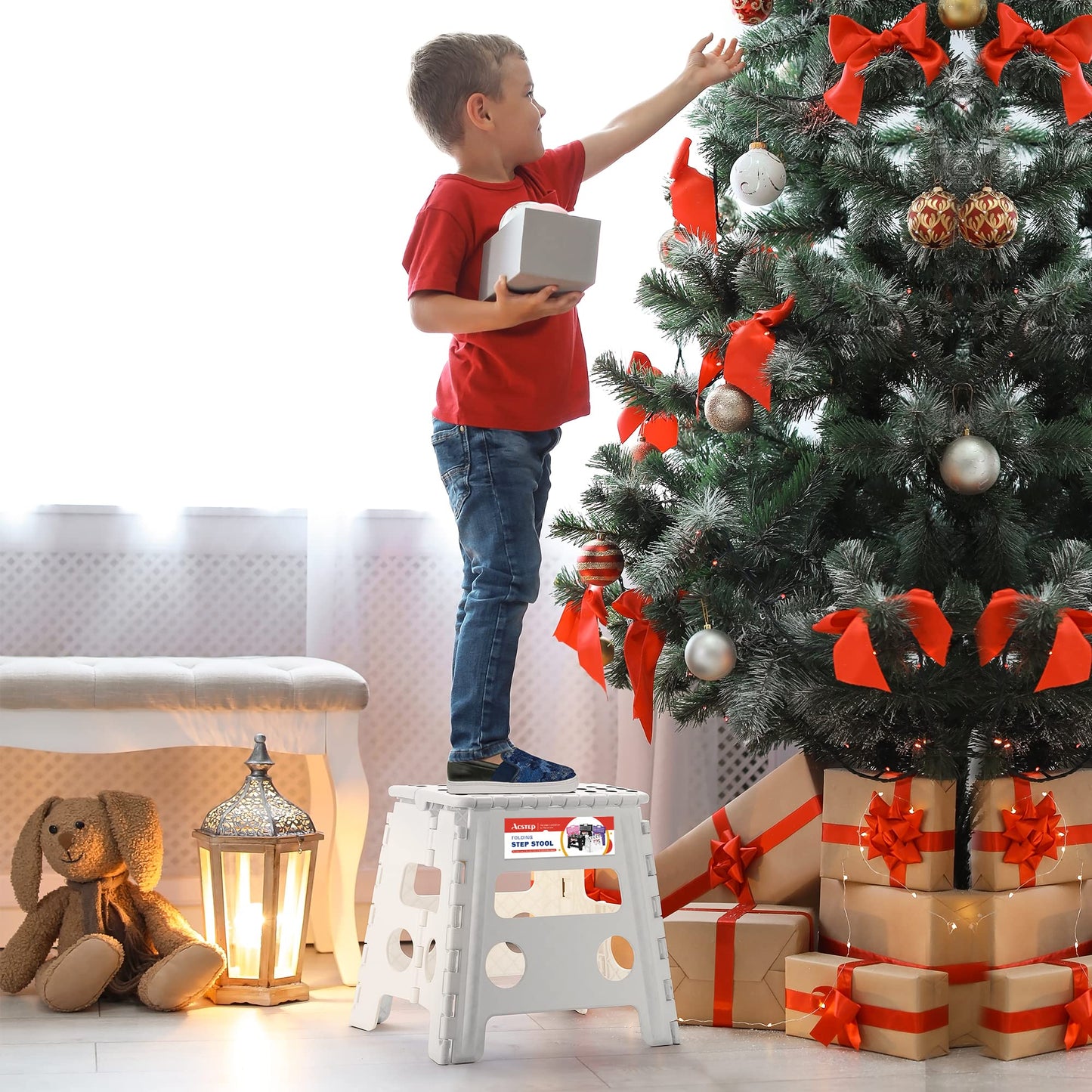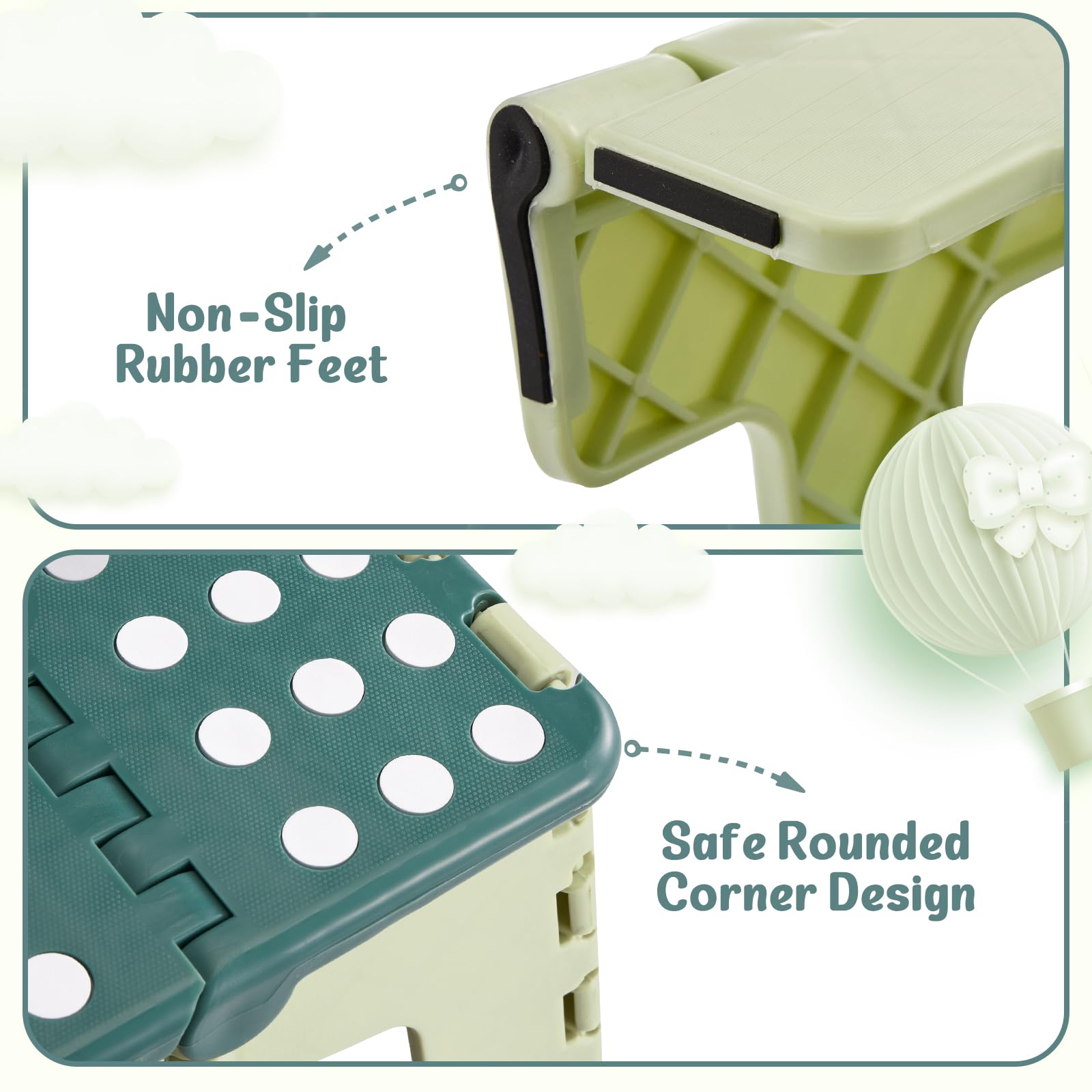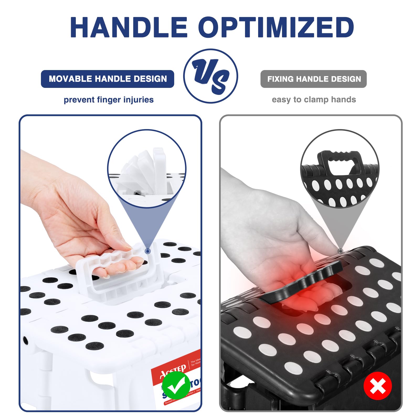 - CARRYING HANDLE - Ergonomic carrying handle is designed for easy folding and carrying. Just lift the handle, it will fold easily and quickly in a split second with only one hand. The step stool’s handle magically appears when the stool is folded flat. Allowing you comfortably carry it around so they can place it where they need it.