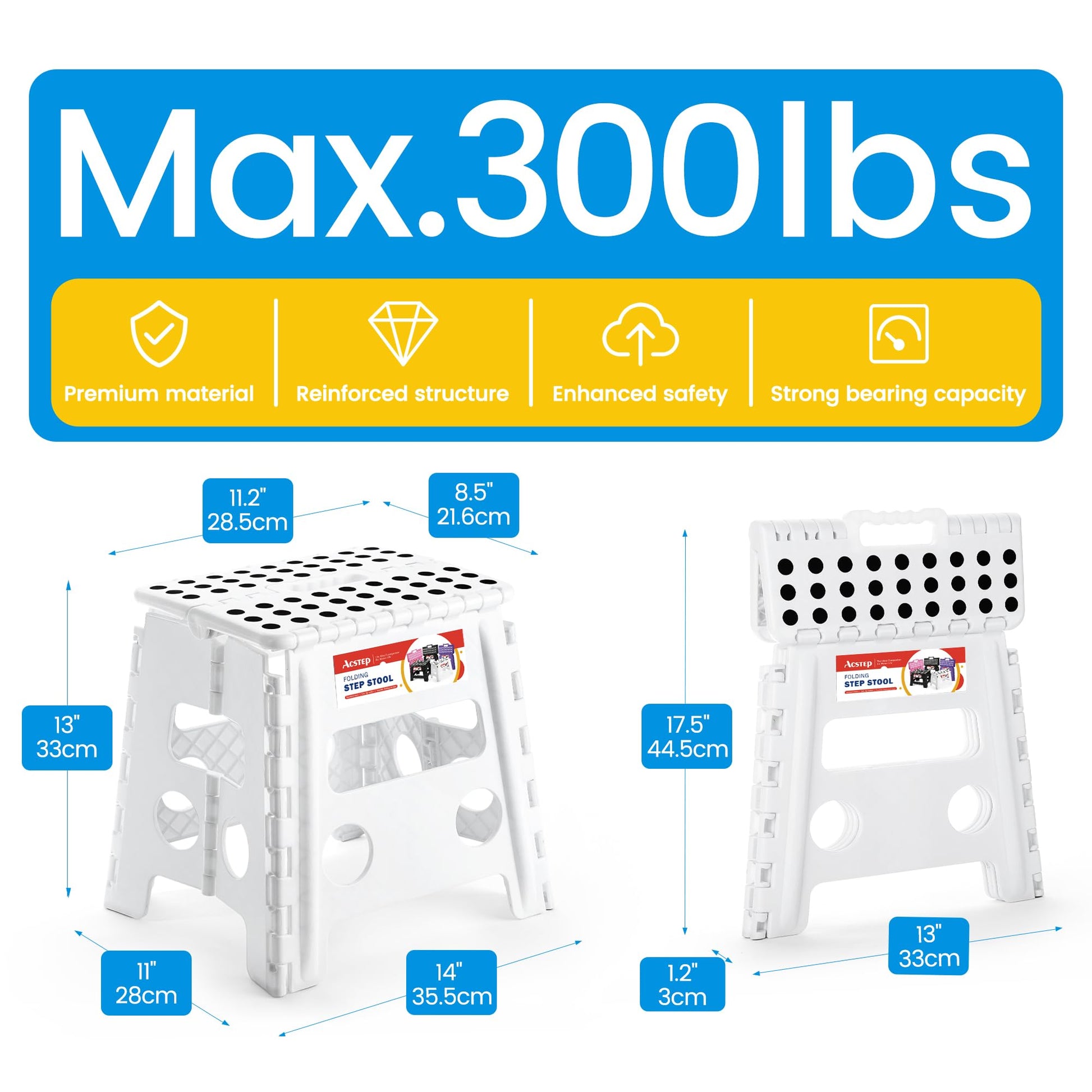 - PROPER USE - The maximum load capacity of the folding step is 300 pounds, which is mainly used for indoor sitting. The step stool must be used in dry and flat surface. Mustn't place the product in the environment above 30℃ and below﹣5℃ more than 5 hours.