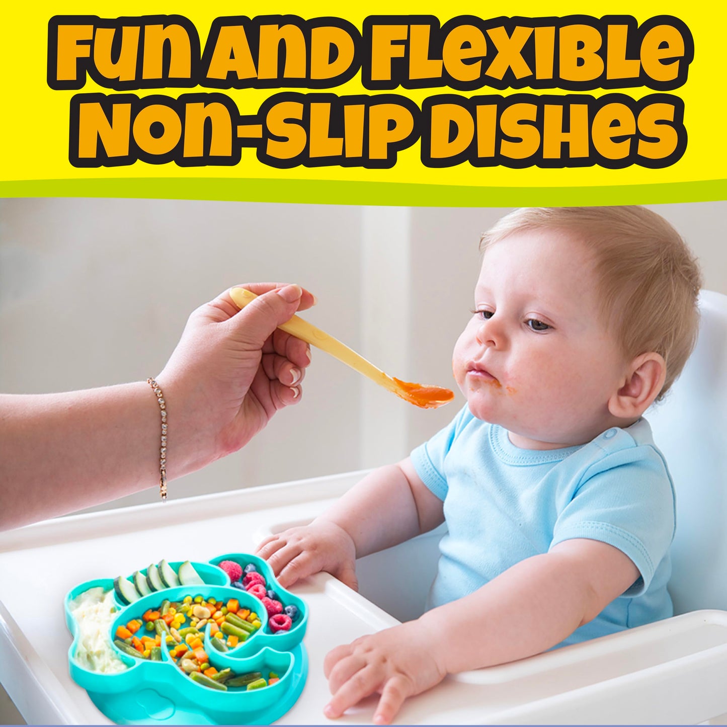- 3 ANIMAL NON-SLIP SILICONE PLATES: Bentology's Animal Flexible Silicone Feeding Plates feature divided compartments for easy feeding. This set features vibrant colored Lion, Monkey and Elephant shaped dishes. Make mealtime more fun! Great gift for mom!
