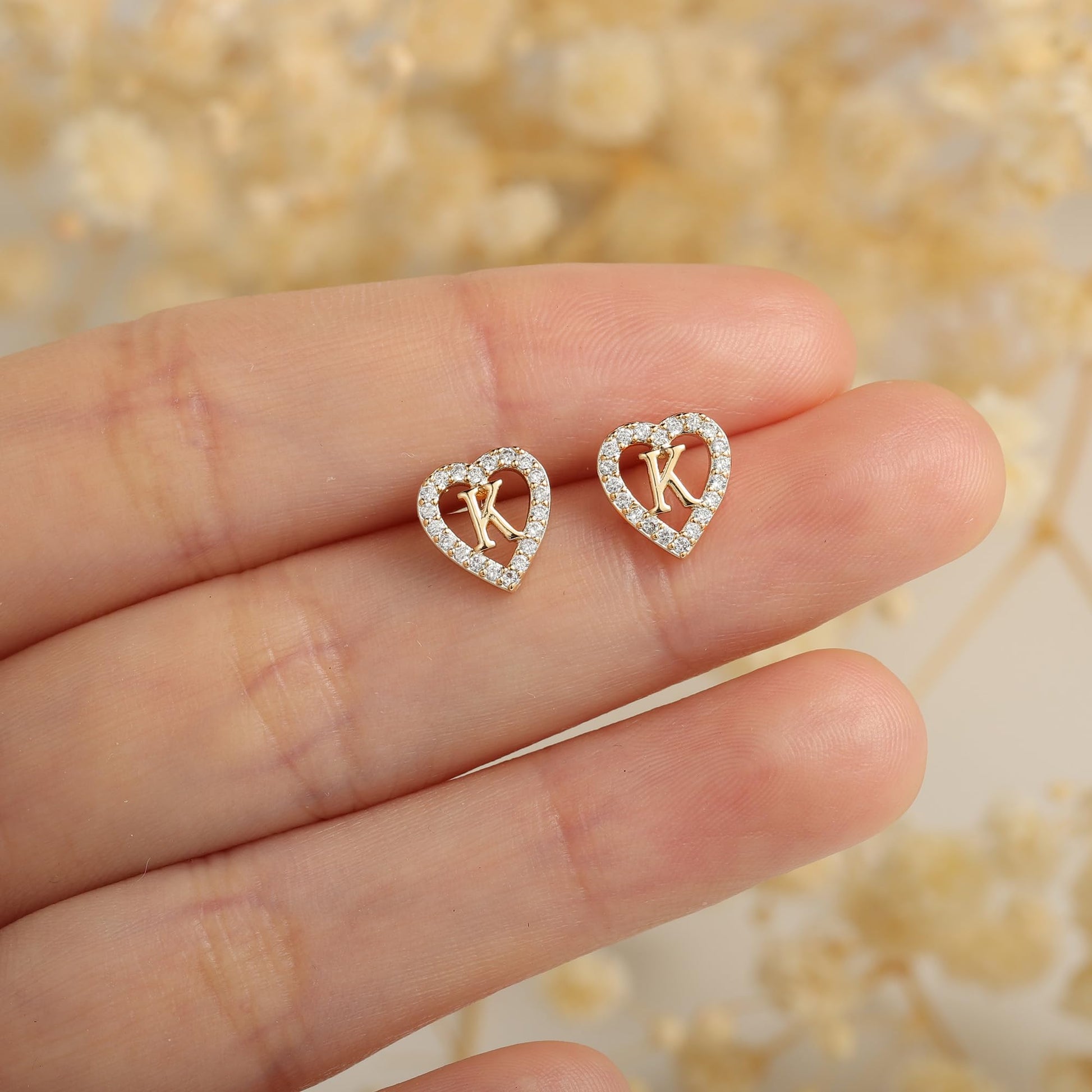 Anoup Heart Initial Stud Earrings - Gifts for Girls, Sterling Silver Post 14K Gold Plated All Over Hypoallergenic | CZ Simulated Diamond Stud Earrings | Birthday Gifts for Kids Toddlers Daughter