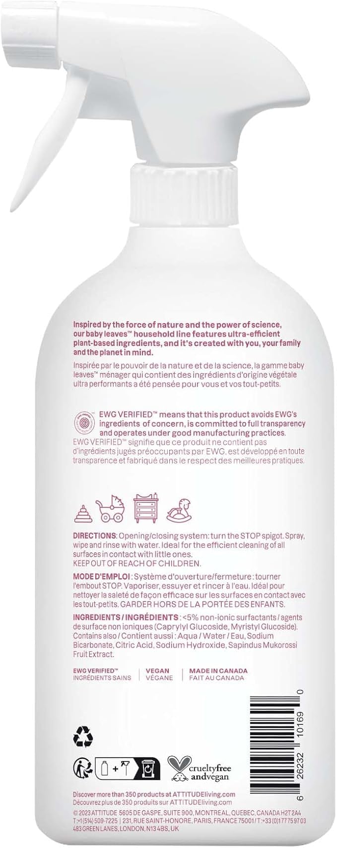 Clean safely and effectively with ATTITUDE® EWG Verified® Toys & Surfaces Cleaner, designed for toys and surfaces your little one touches every day. Made with 94% natural-origin ingredients¹, this baby toy cleaning spray easily removes dirt, grease, and residue from toys, high chairs, play tables, car seats, strollers, and even works as a yoga mat cleaner. Infused with plant- and mineral-based cleaning agents, it provides a quick, convenient clean without harsh ingredients. Free from phthalates, and sulfates, this baby toy cleaner spray is also fragrance-free, ideal for sensitive noses and everyday use. (Do not apply on skin.) Packaged in a recyclable HDPE #2 bottle, one of the easiest plastics to recycle, this vegan and cruelty-free baby toy cleaner is part of the Baby leaves® line—perfect for parents looking for an effective solution for cleaning toys, accessories, and surfaces. Whether you’re cleaning toys, high chairs, or yoga mats, this baby toy cleaner spray keeps everything fresh and spotless with ease.