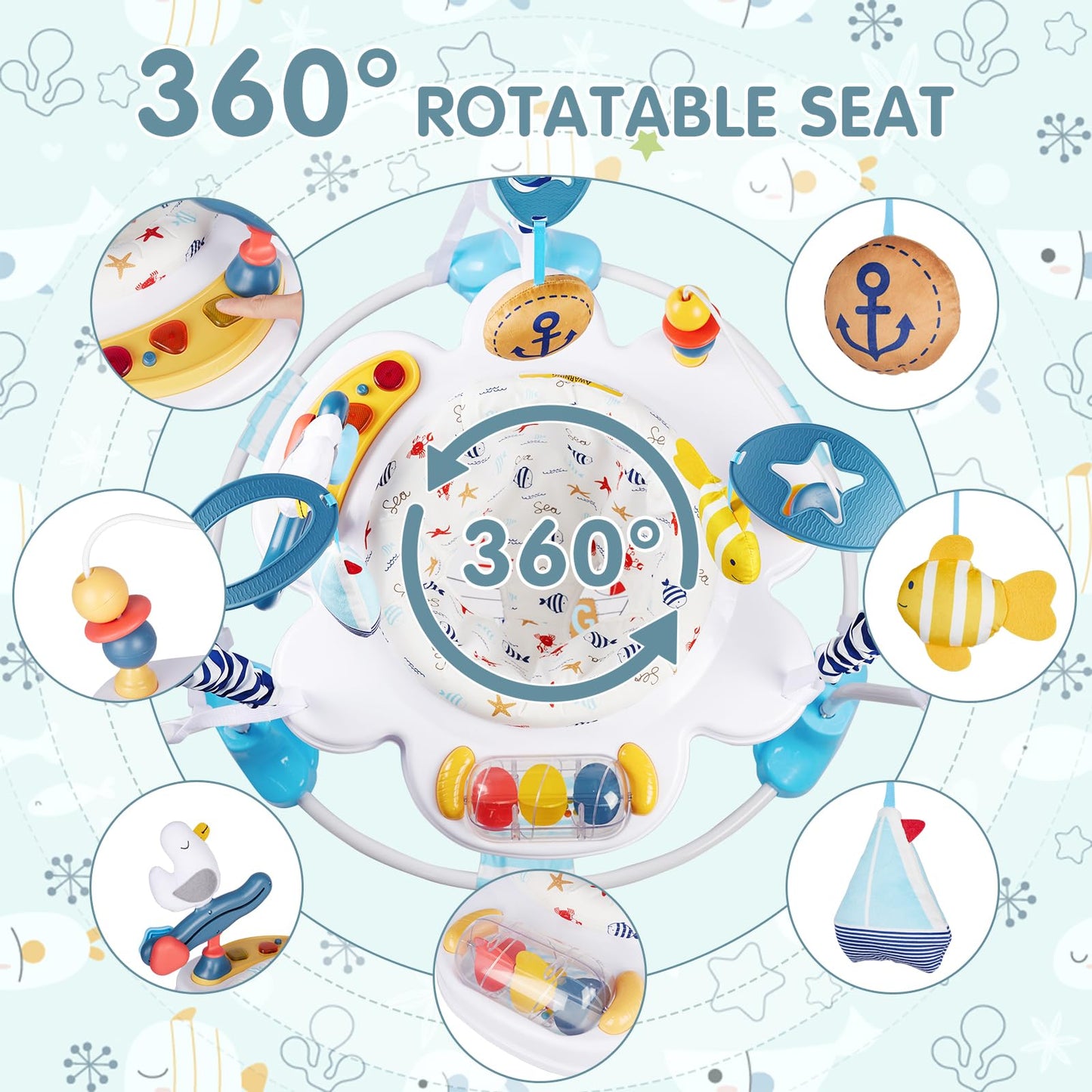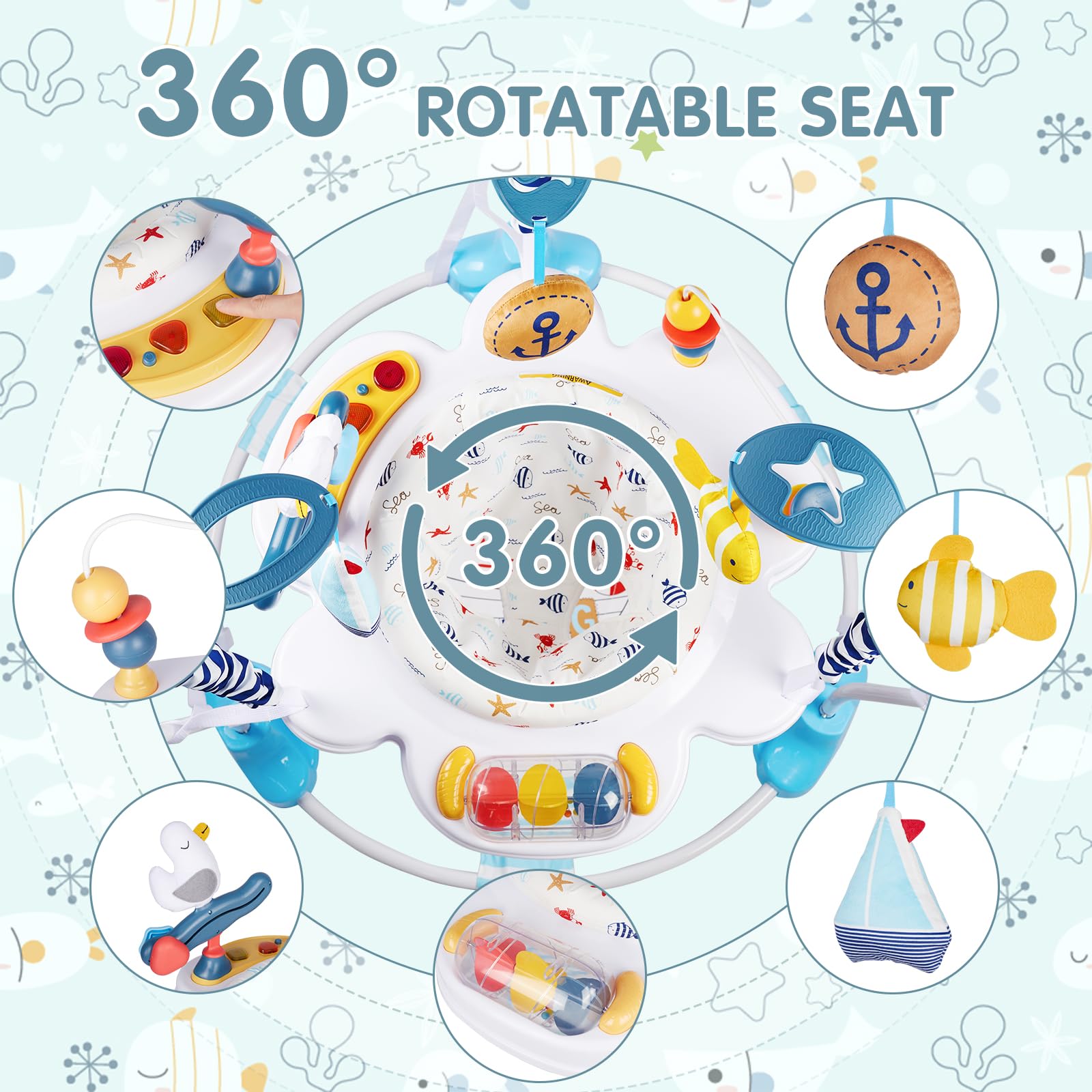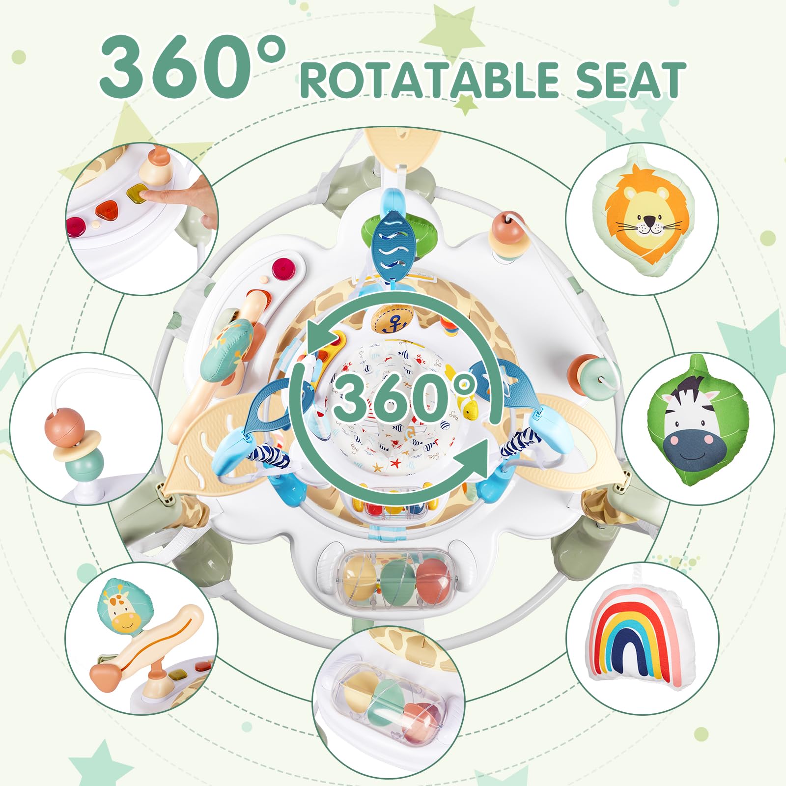 - 【360° Rotating Seat with Interactive Toys】 This baby bouncer activity center has a 360°rotating seat, allowing your baby to reach fun toys like a seesaw with sliding bar, light and music toy tray, a string of beads, roller toy and hanging toy. (3 AAA batteries required, not included.) A baby jumper that stimulates all senses.