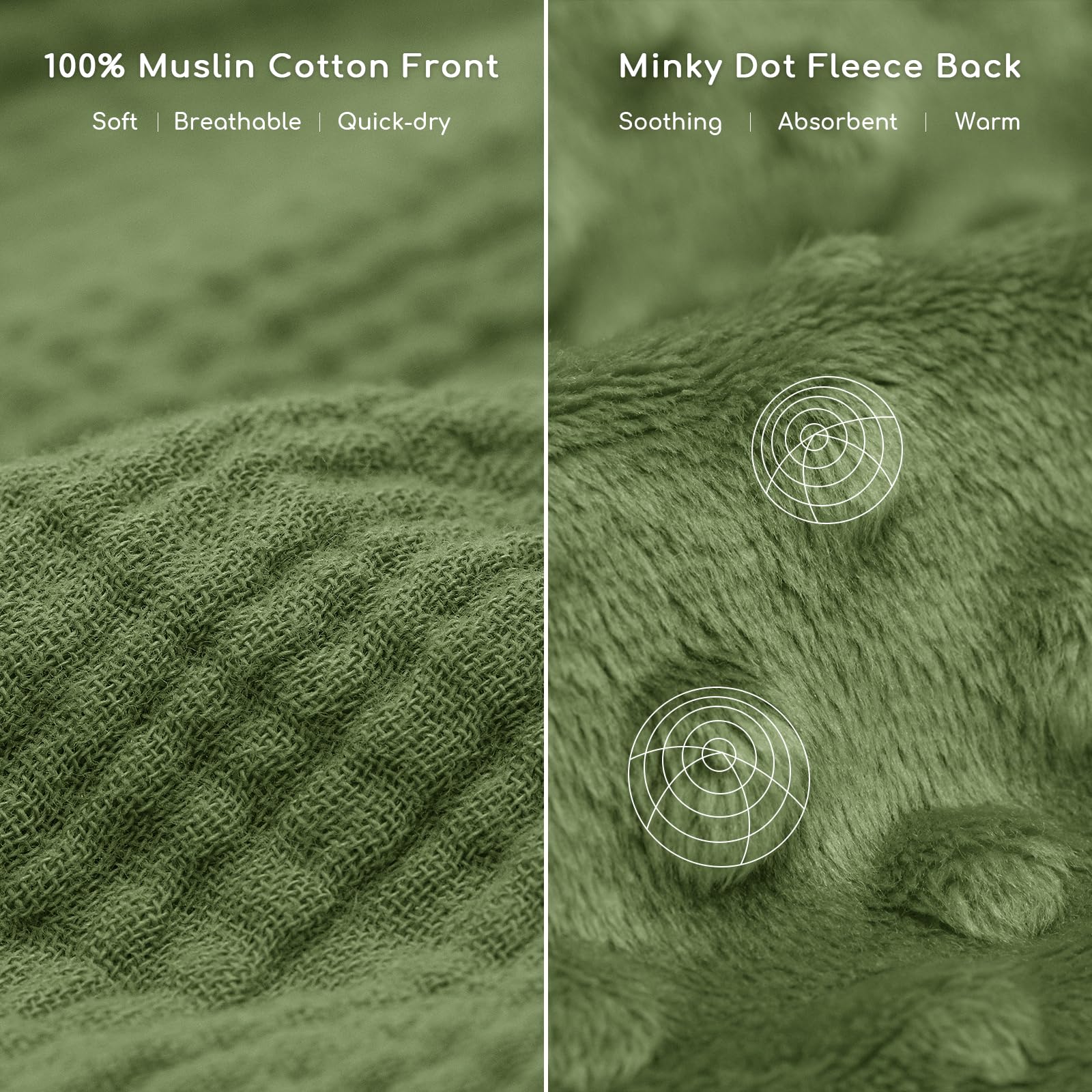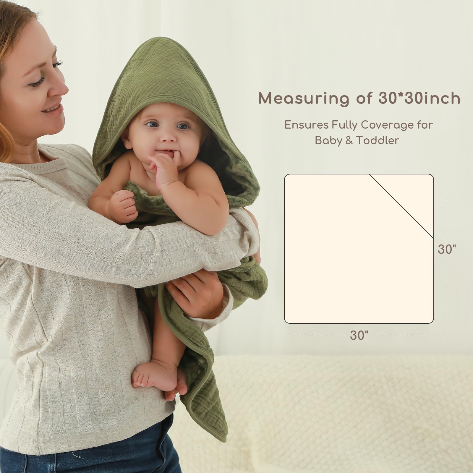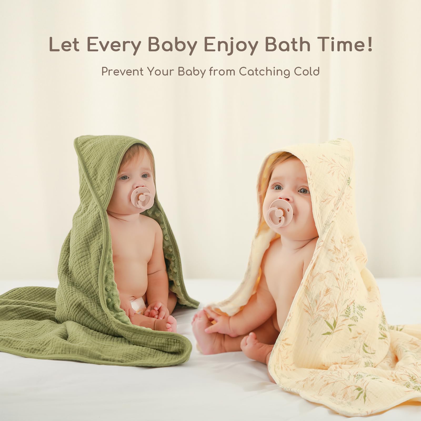 Baby Bath Towels for Newborn 100% Muslin Cotton and Minky Dot Fabric Neutral Hooded Baby Towels Set 2 Pack for Boys Girls Ultra Soft and Absorbent 30 x 30 Inch Green & Plant