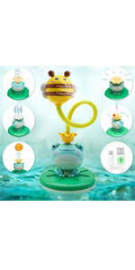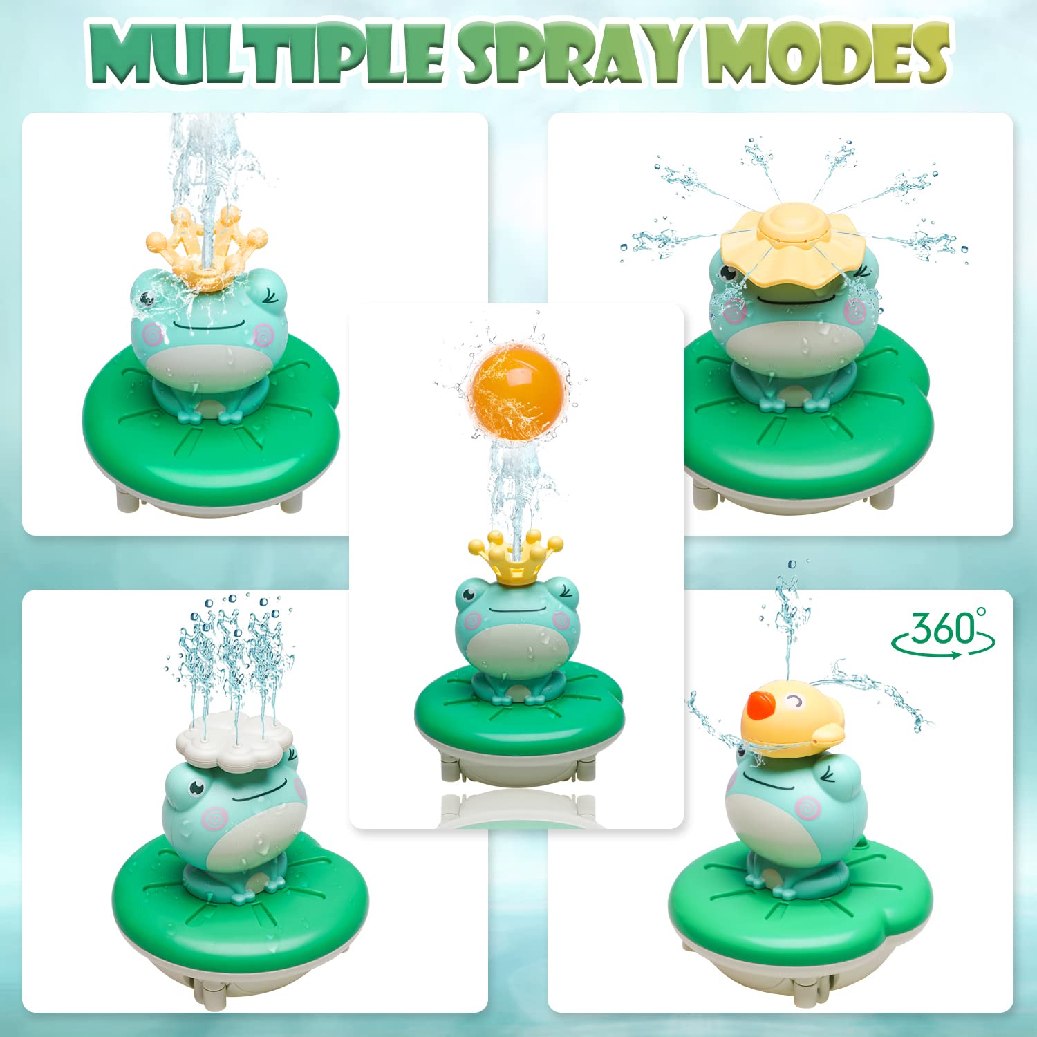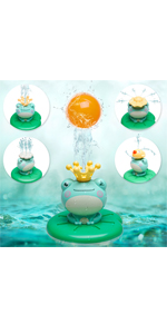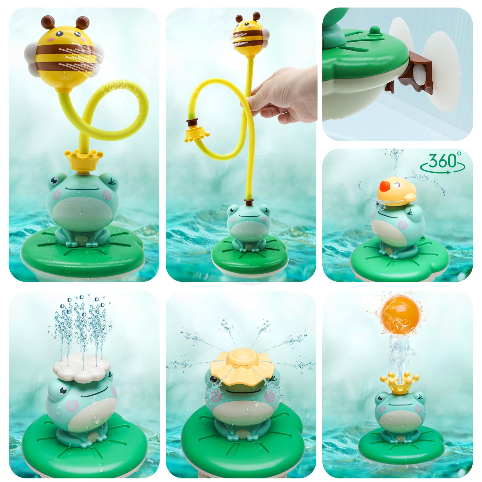 - 【6 in 1 Water Spray Bath Toys】The electric frog bath toy design with 1 Bee shower head &5 sprinklers accessories to spray water. Wearing different nozzles has different water spray effects, creating magical fountains, rotating water sprays, top balls, fancy water games. Bring endless entertainment for baby bathing