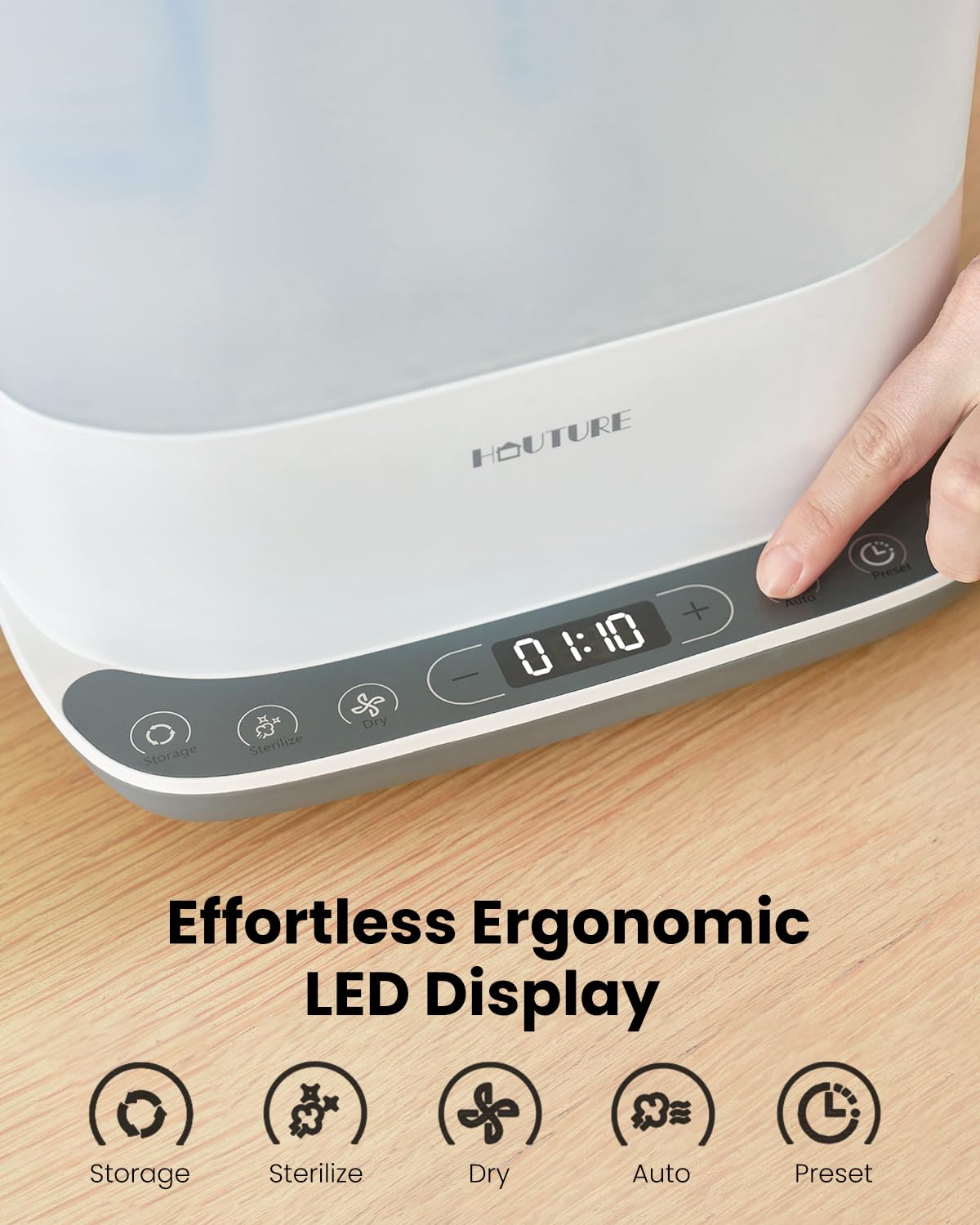 - 𝟱-𝙞𝙣-𝟭 𝙎𝙩𝙚𝙧𝙞𝙡𝙞𝙯𝙖𝙩𝙞𝙤𝙣: Enjoy Auto, Dry, Store, Sterilize-only, and Preset modes for superior safety and value with HAUTURE bottle sterilizer and dryer(hand-washing needed before use),avoiding detergent residues found in all-in-one washer-sterilizers. The ergonomic front-control panel eliminates bending for effortless operation.