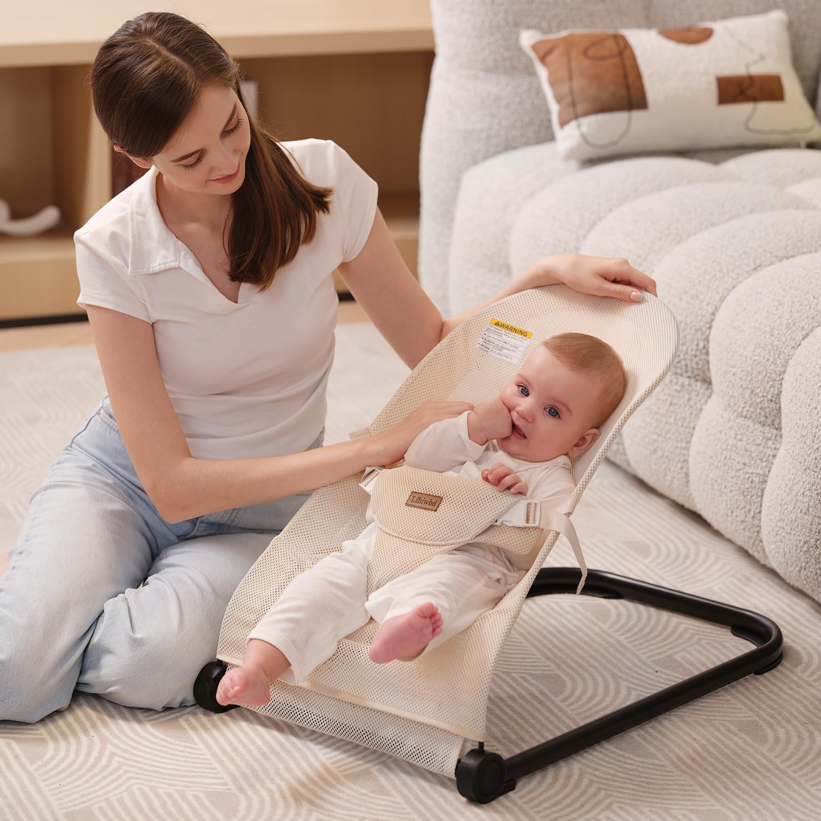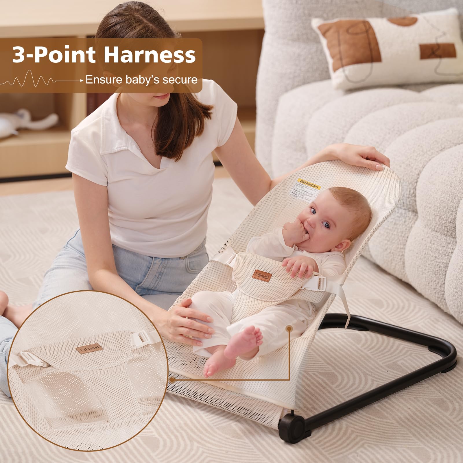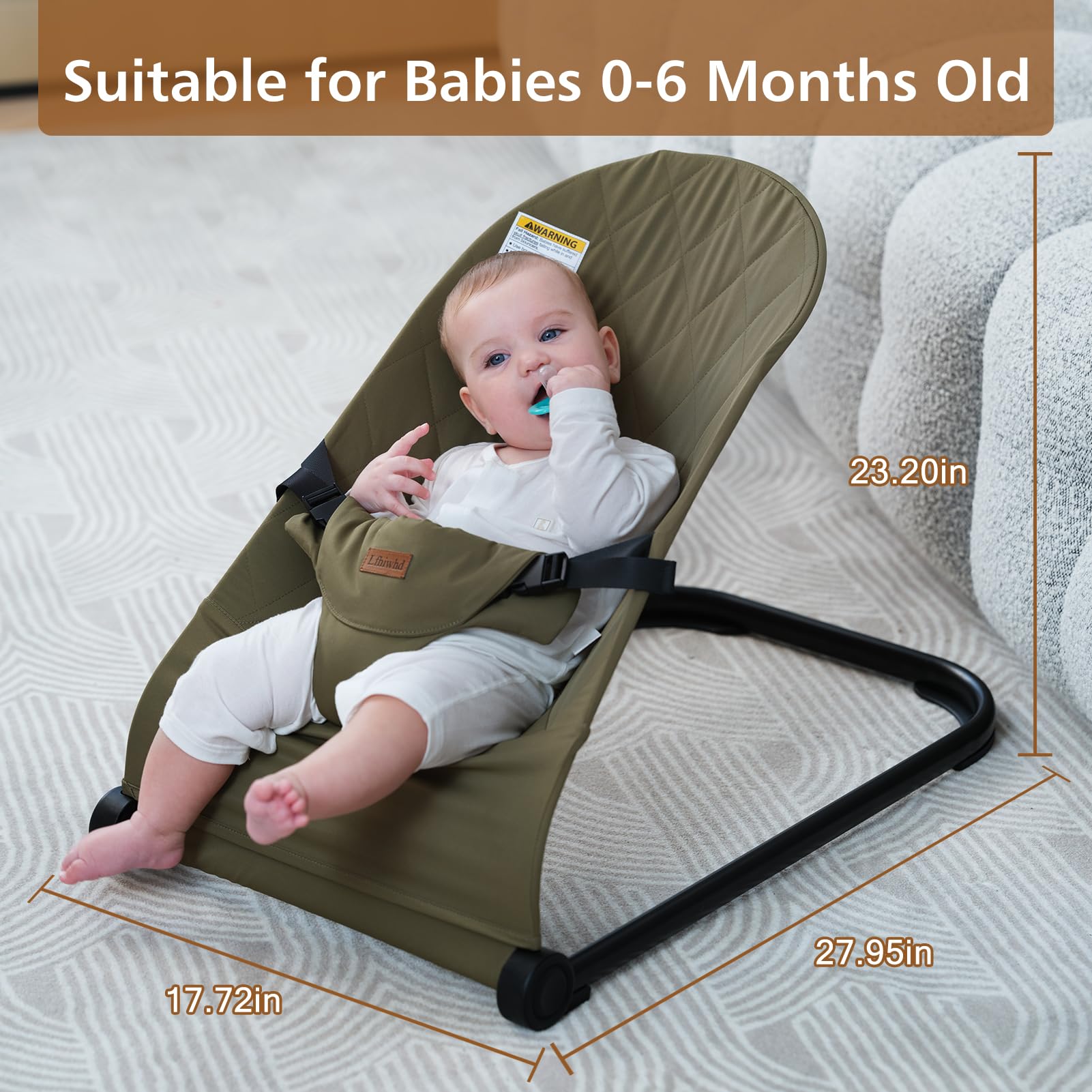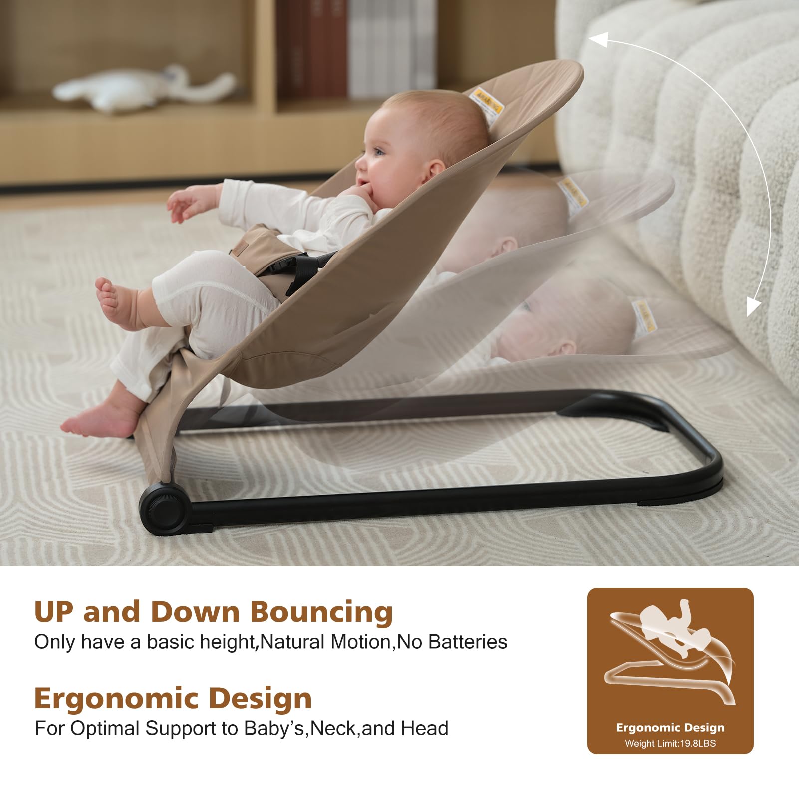 - Premium Fabric & Ergonomic Design:bouncer seat for babies made from high quality skin-friendly cotton fabric, which better protects and comfort for your baby's delicate skin.Portable baby bouncer feature ergonomic fabric seats and special backrest designs to provide proper support for your baby's developing spine and neck, ensuring their maximum comfort and safe