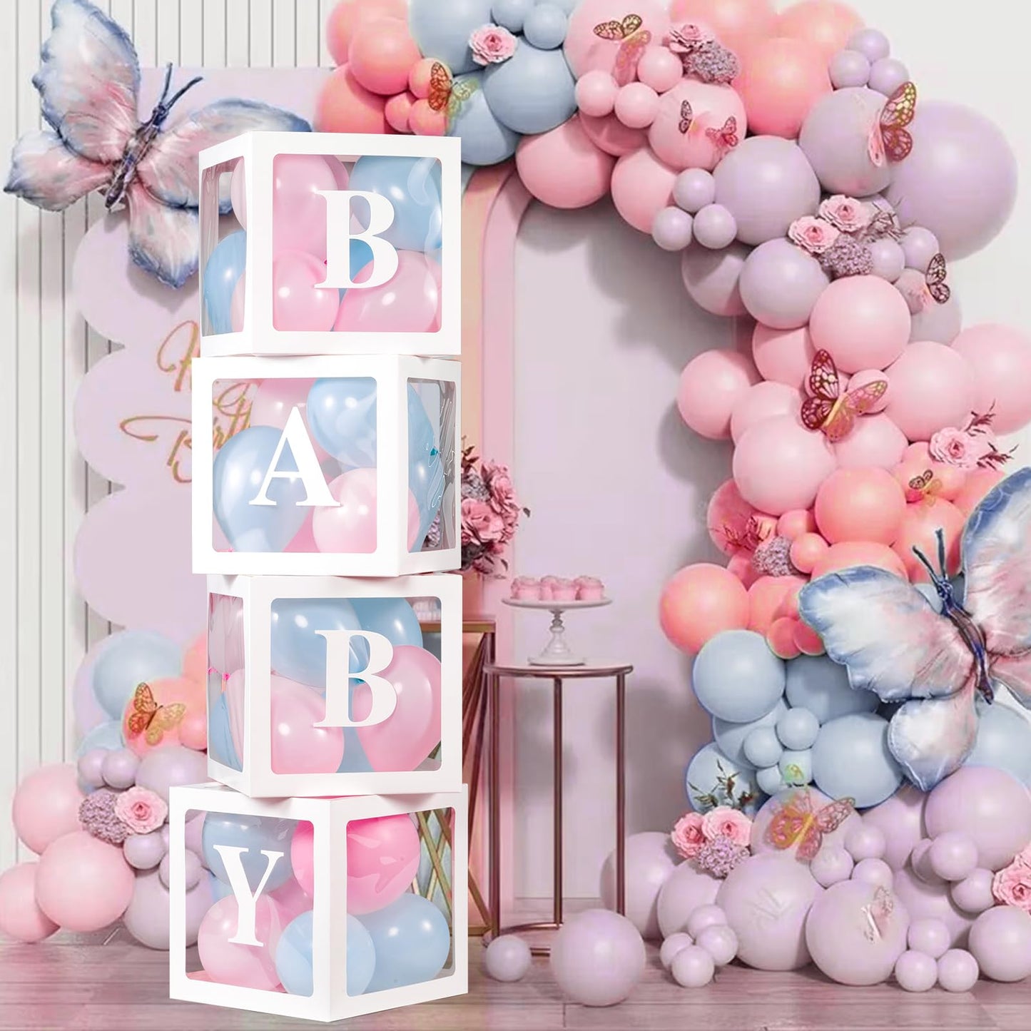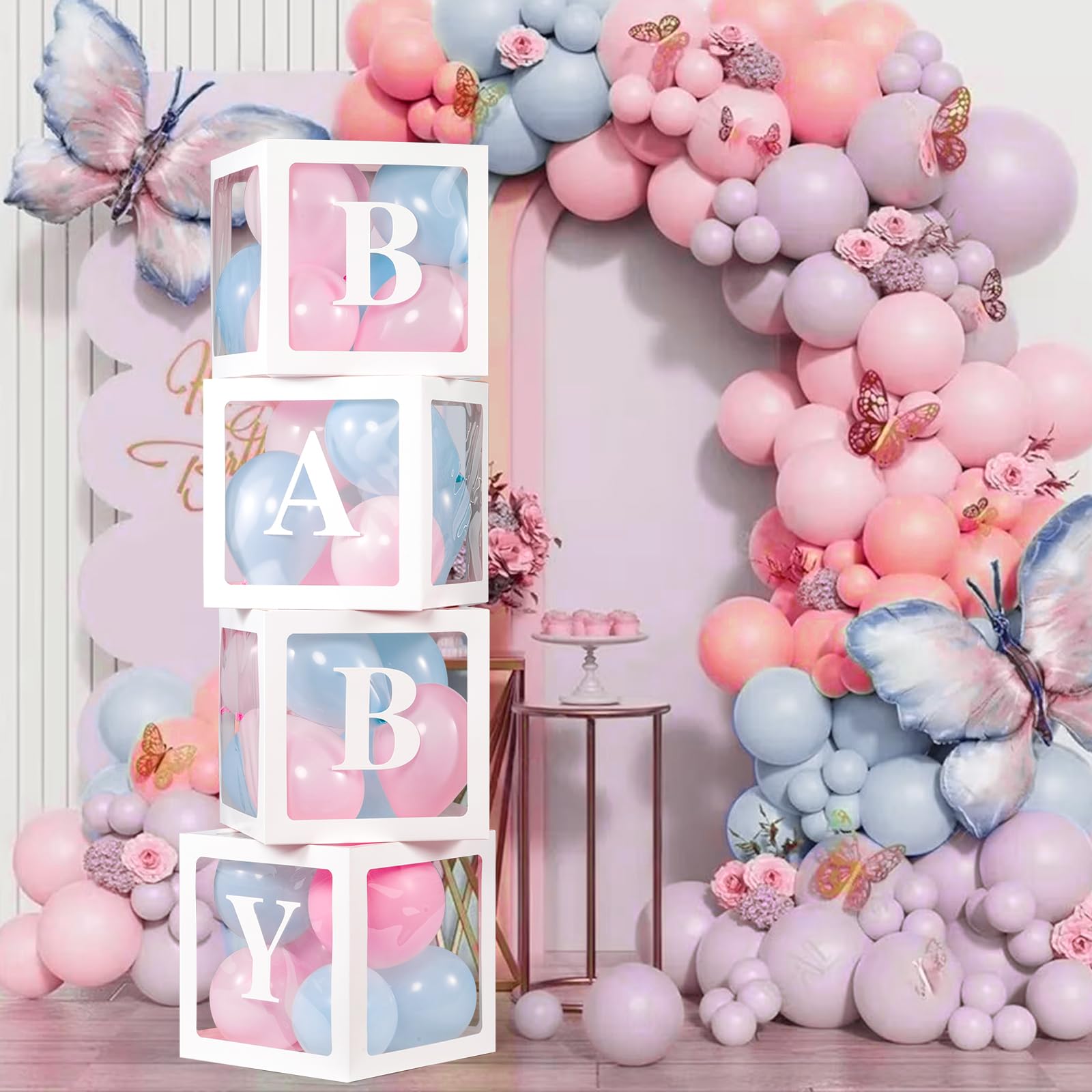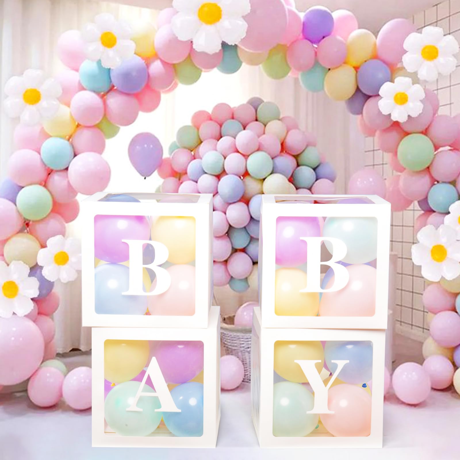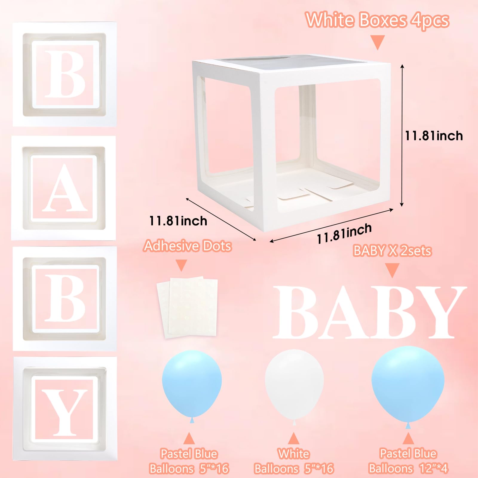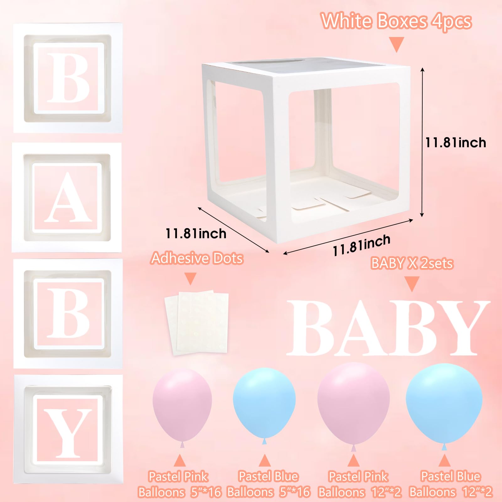 - Package Includes: Voircoloria baby boxes set includes 4pcs transparent balloon boxes, 2set "BABY" letters, 36Pcs pastel balloons and adhesive dots. The size of baby shower box is 11.81 x 11.81 x 11.81inch. The clear balloon boxes are enough to make a beautiful baby shower decorations