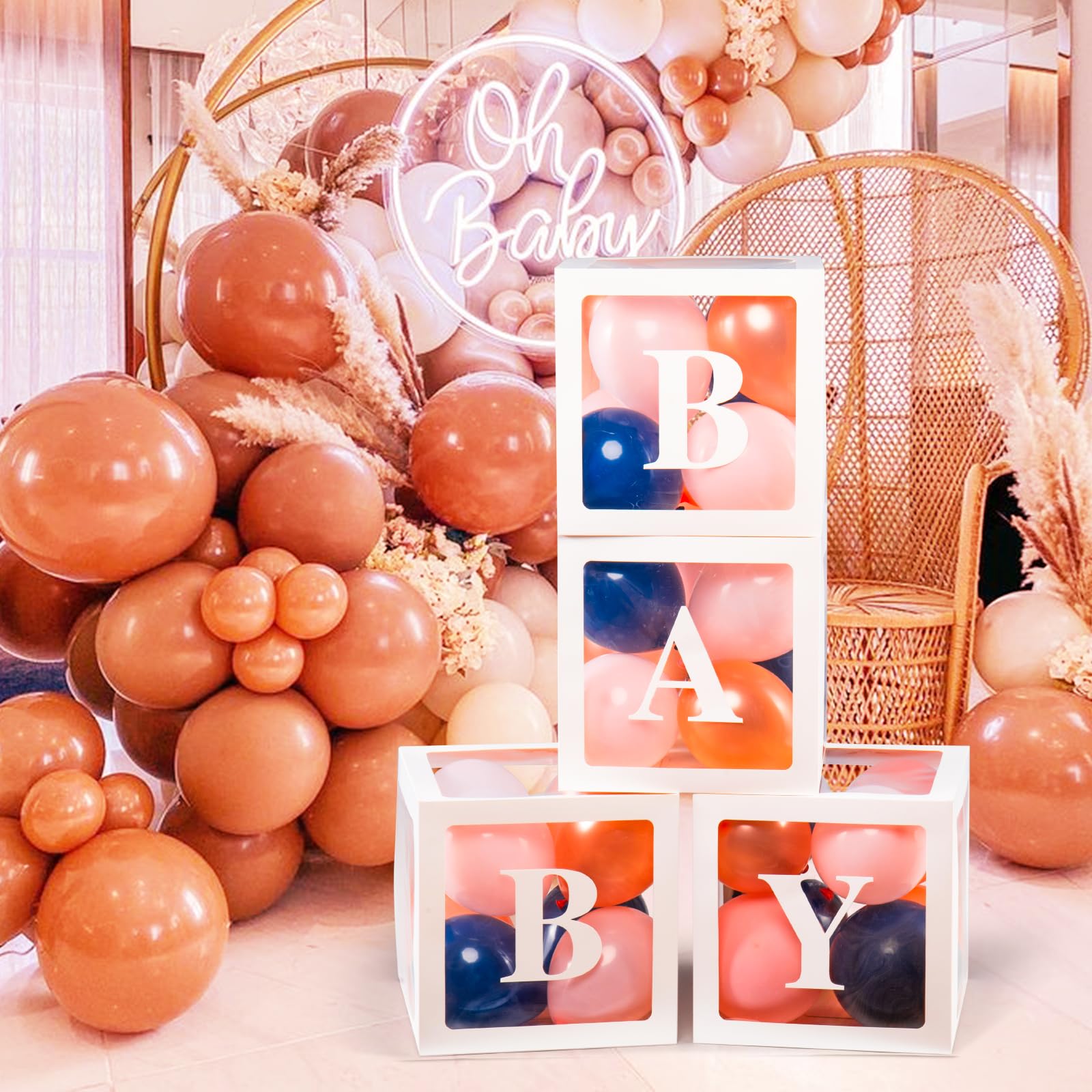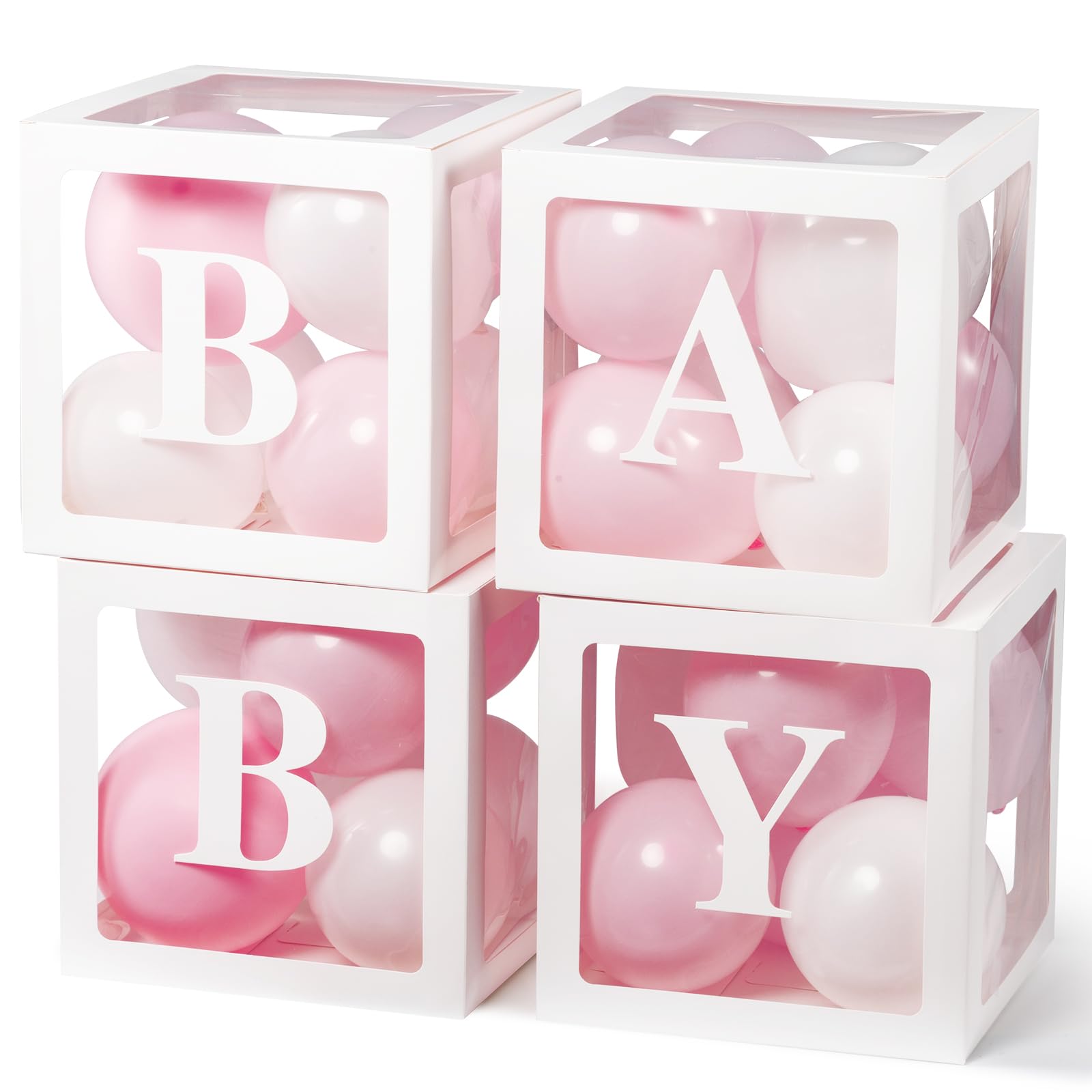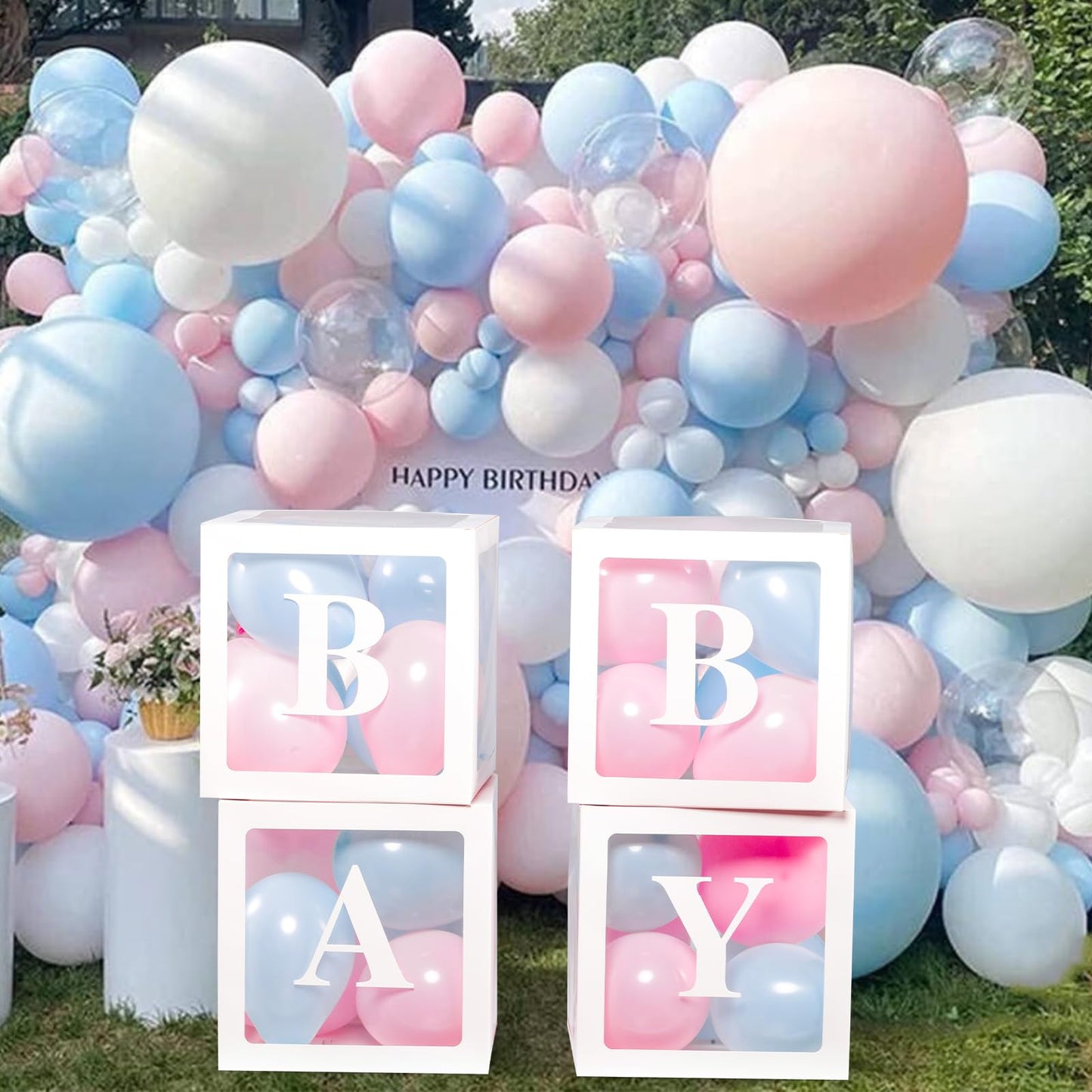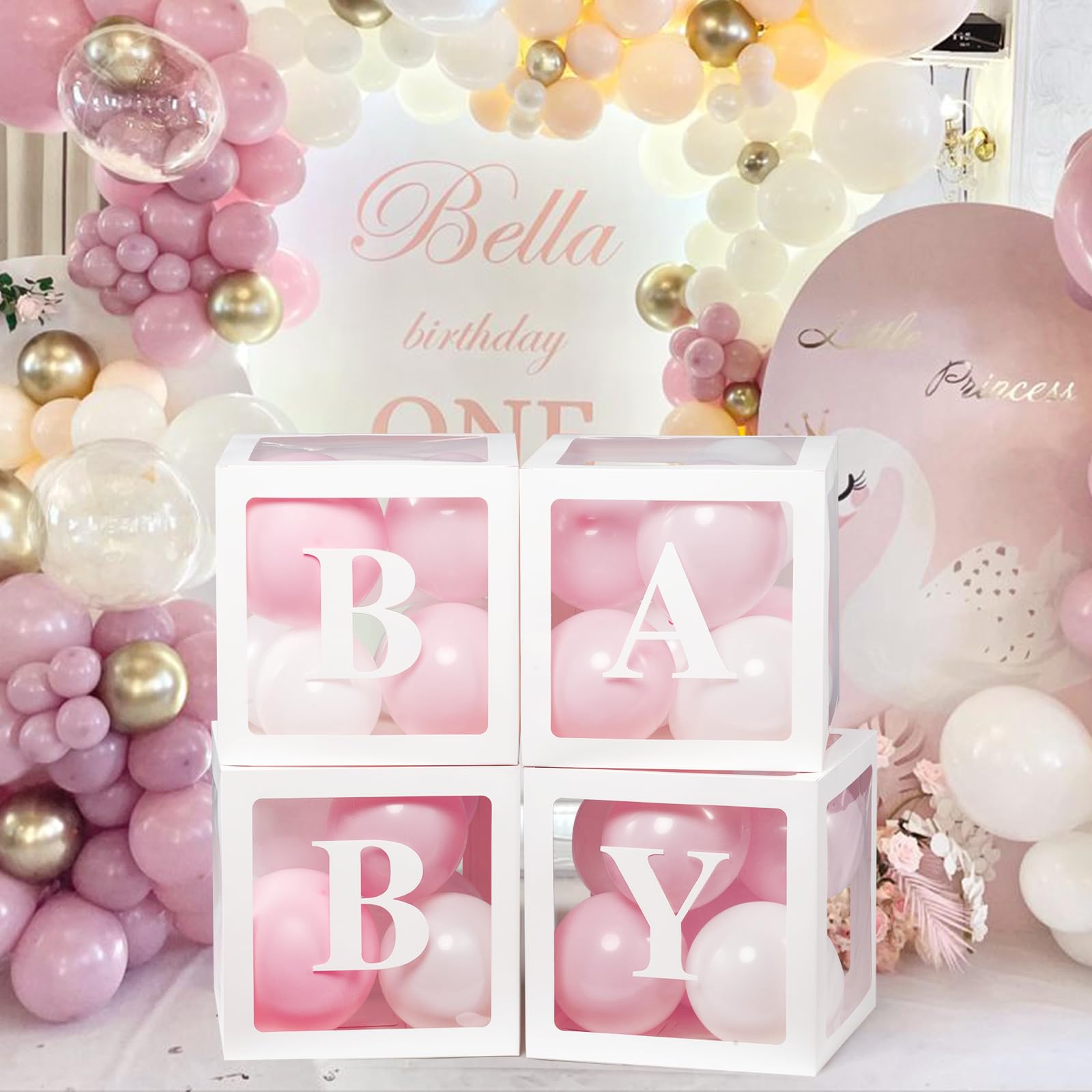 - Package Includes: Voircoloria baby boxes set includes 4pcs transparent balloon boxes, 2set "BABY" letters, 36Pcs pastel balloons and adhesive dots. The size of baby shower box is 11.81 x 11.81 x 11.81inch. The clear balloon boxes are enough to make a beautiful baby shower decorations