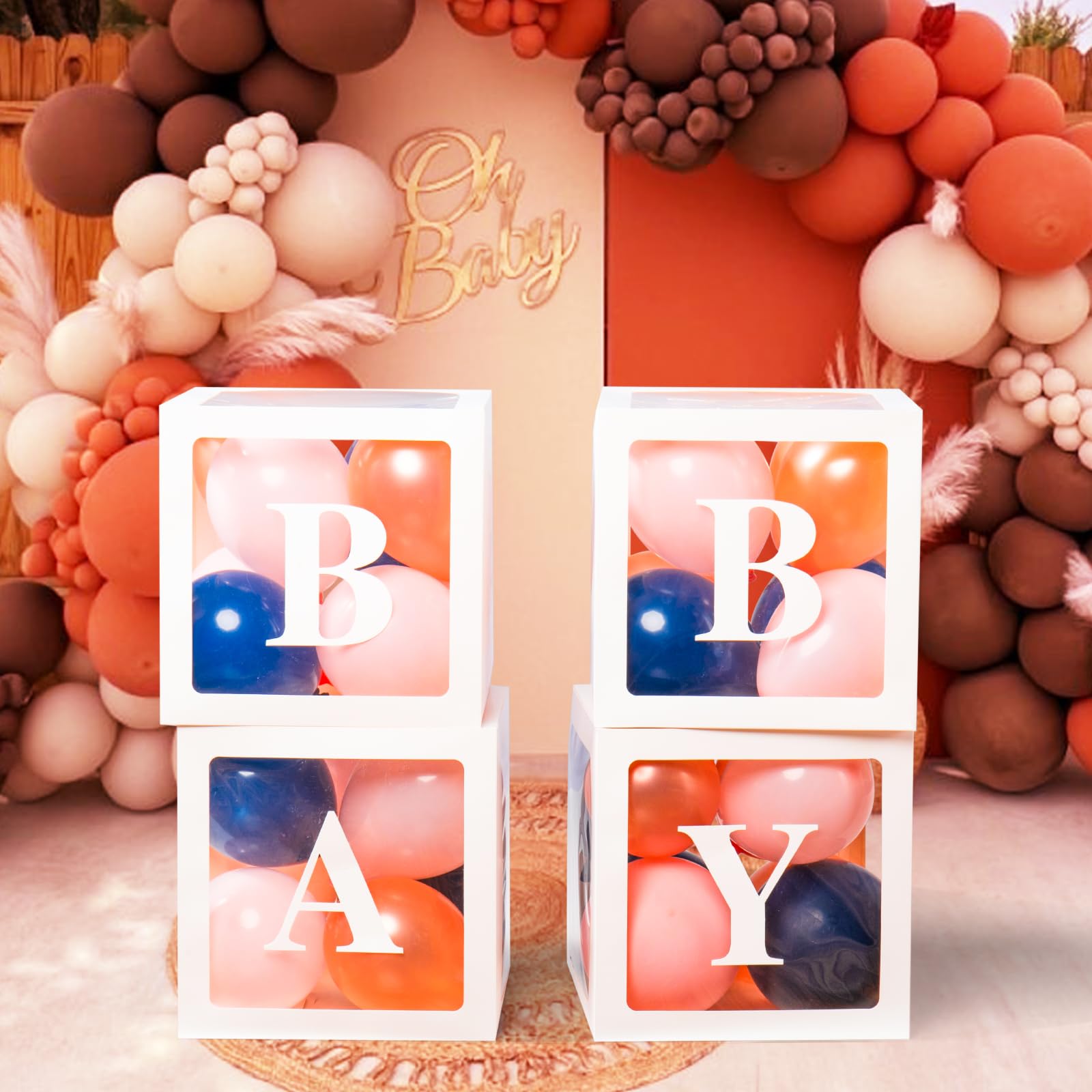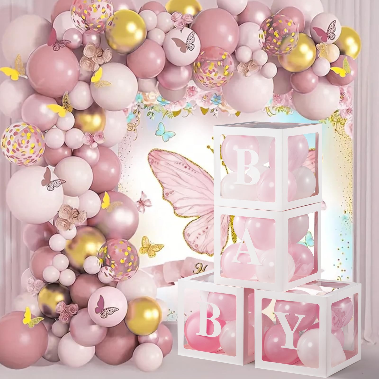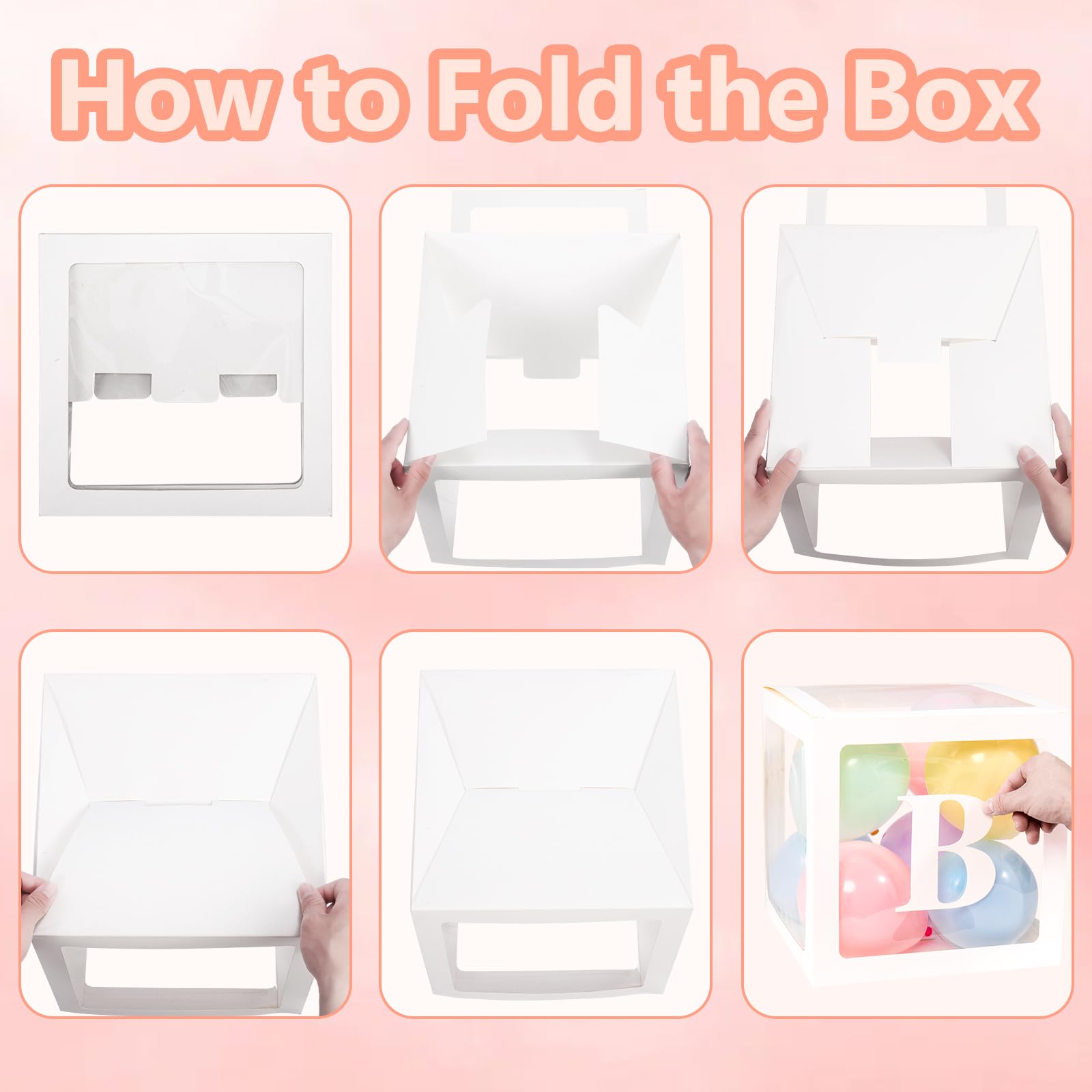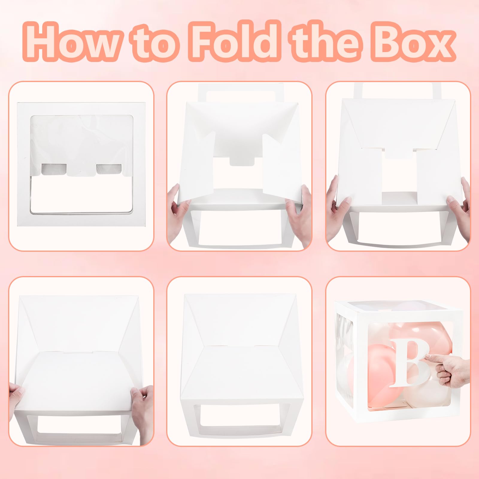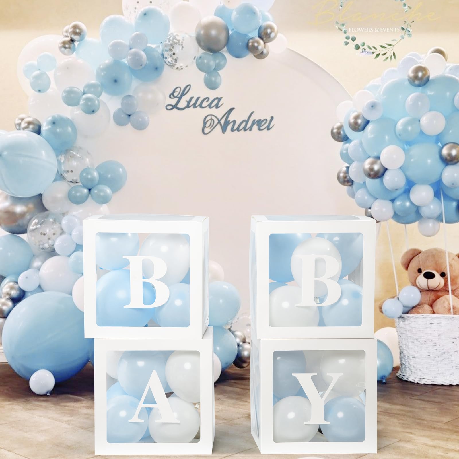 - Package Includes: Voircoloria baby boxes set includes 4pcs transparent balloon boxes, 2set "BABY" letters, 36Pcs pastel balloons and adhesive dots. The size of baby shower box is 11.81 x 11.81 x 11.81inch. The clear balloon boxes are enough to make a beautiful baby shower decorations