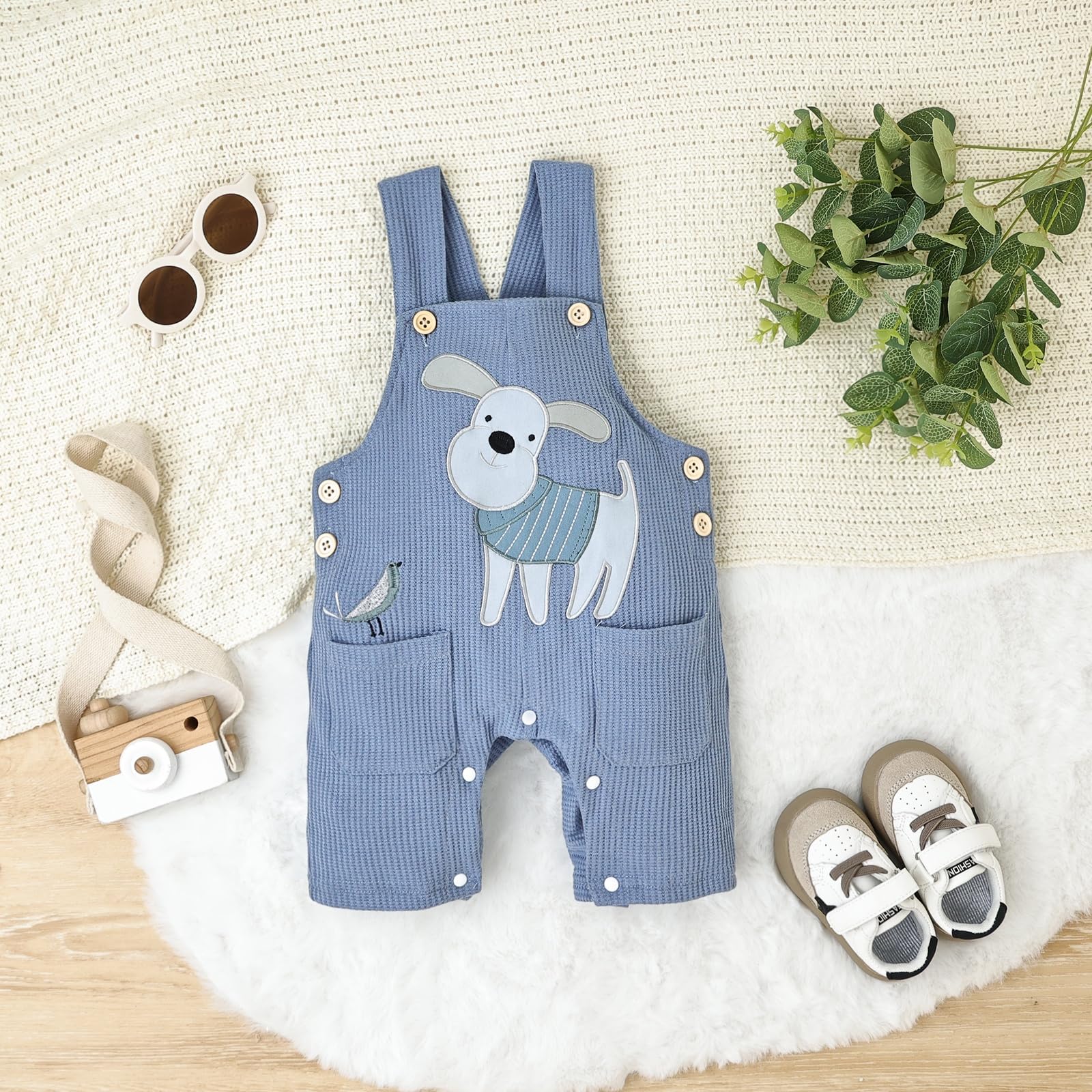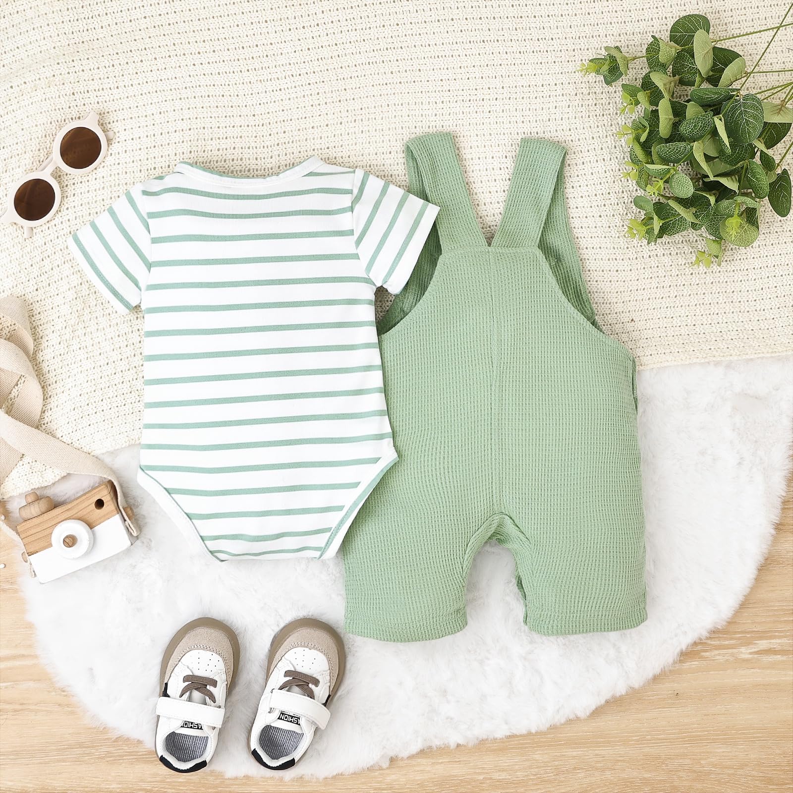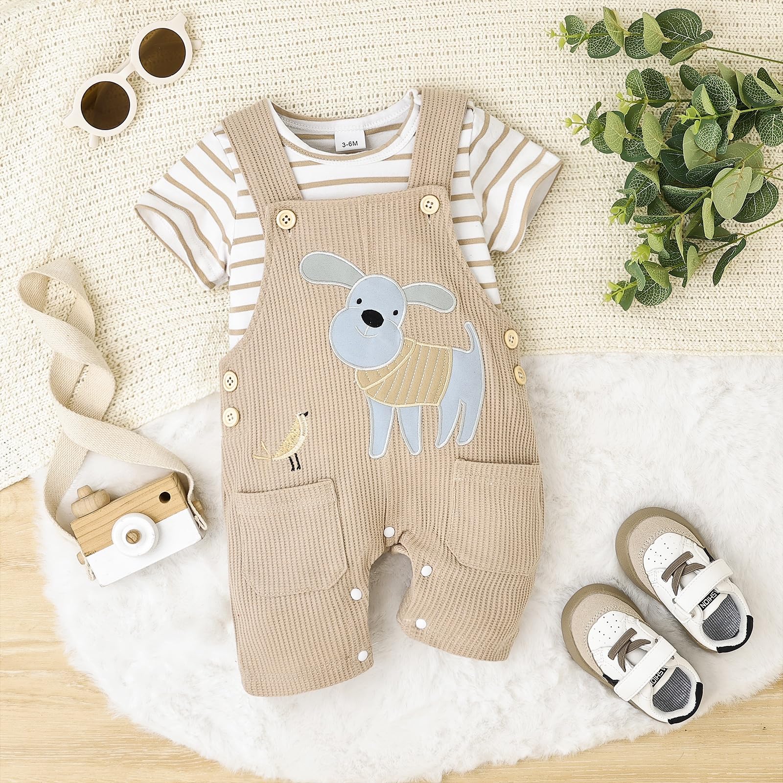 - Complete Set: Includes 1 x Baby Short Sleeve Striped Romper + 1 x Baby Cartoon Dog Overall Shorts. This coordinated outfit set offers a stylish and adorable look, making dressing up fun and effortless.