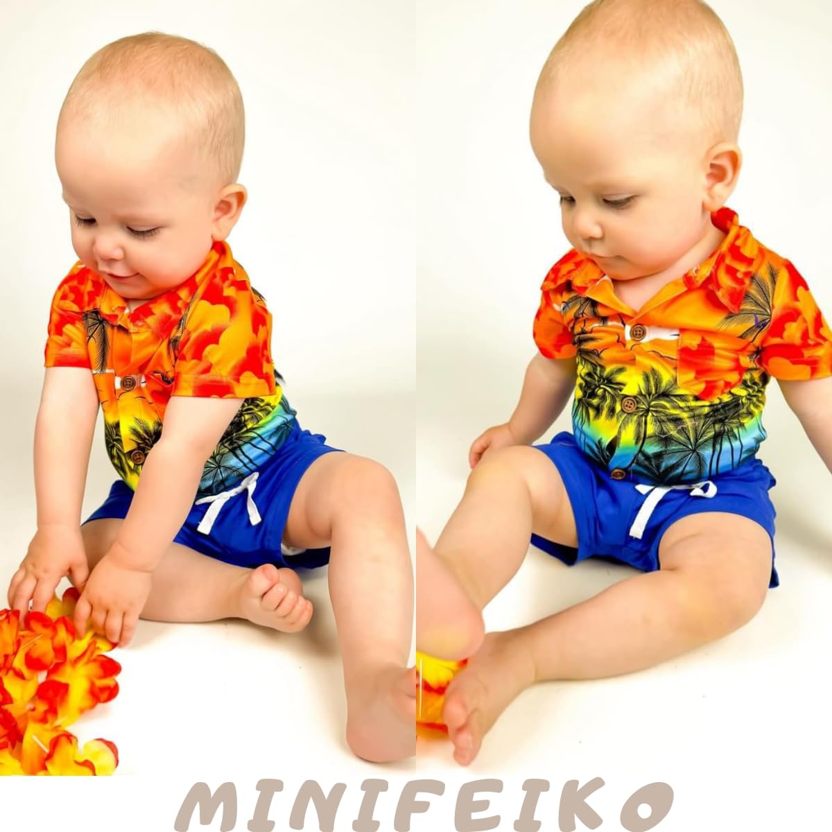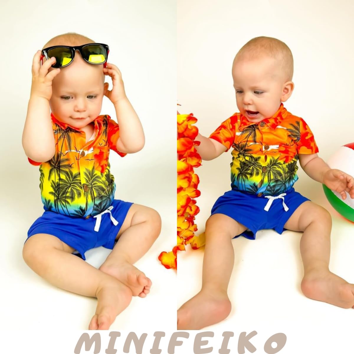 »» FASHION DESIGN «« - Classic Hawaiian theme shirt romper tops & solid color shorts 2 pcs outfit. Buttons + Snaps closure. Convenient to put on and take off while looking smart!