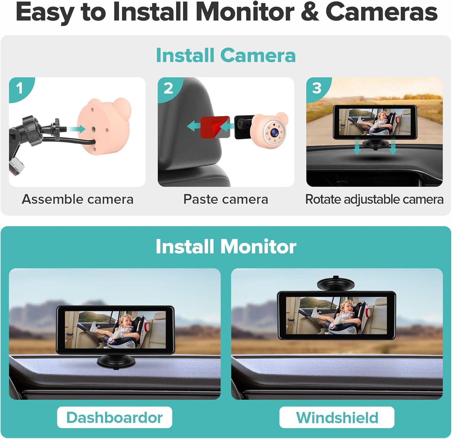 - 【Clear 1080P Image & IR Night Vision】Two cameras that offer 1080P resolution and 940nm not blinding night vision. The night vision function automatically activates in low-light or nighttime conditions, enabling you to clearly see real-time images of your baby even in complete darkness.You can drive without worrying, without the distraction of turning around. The hidden 940nm IR LED light that won't disturb the baby's sleep.