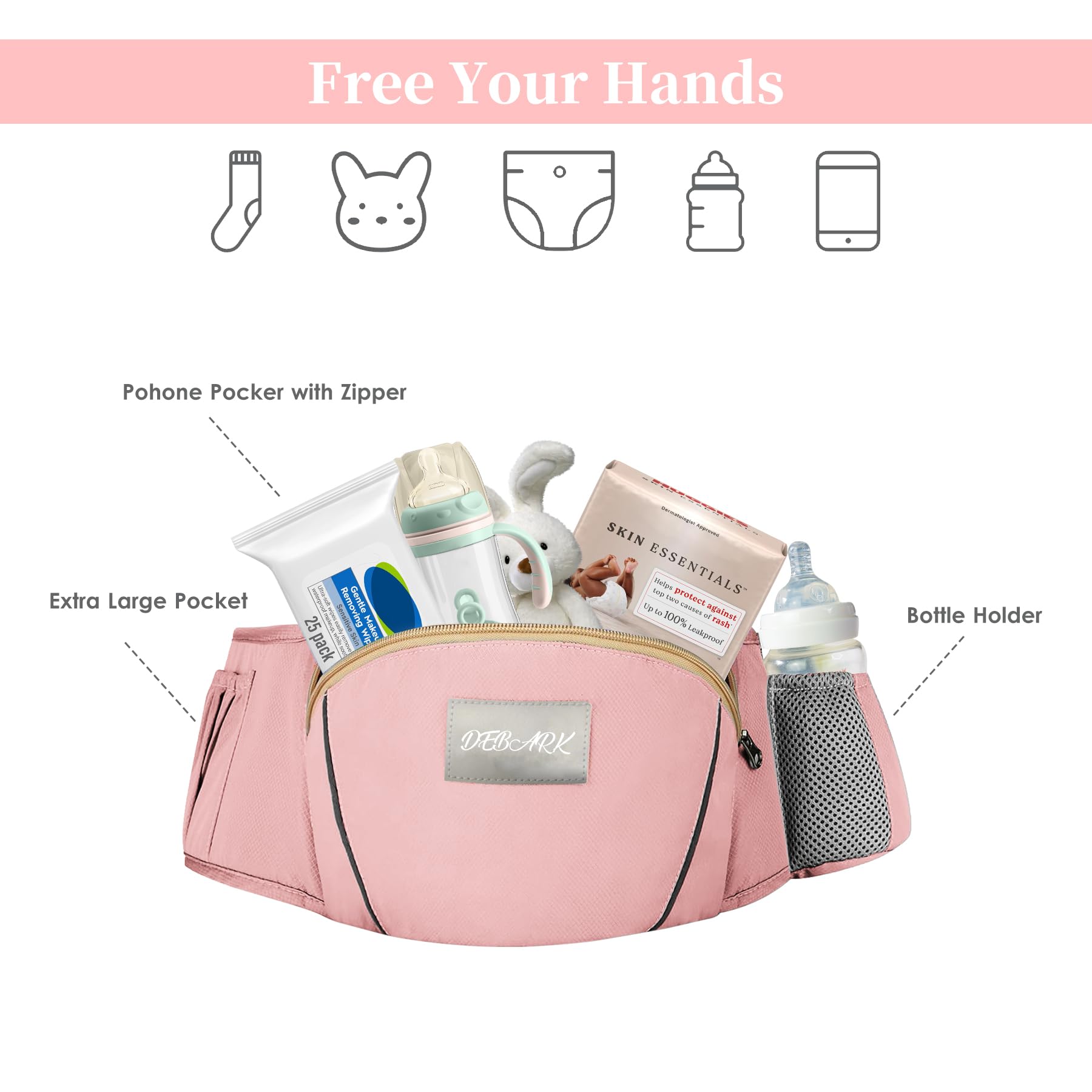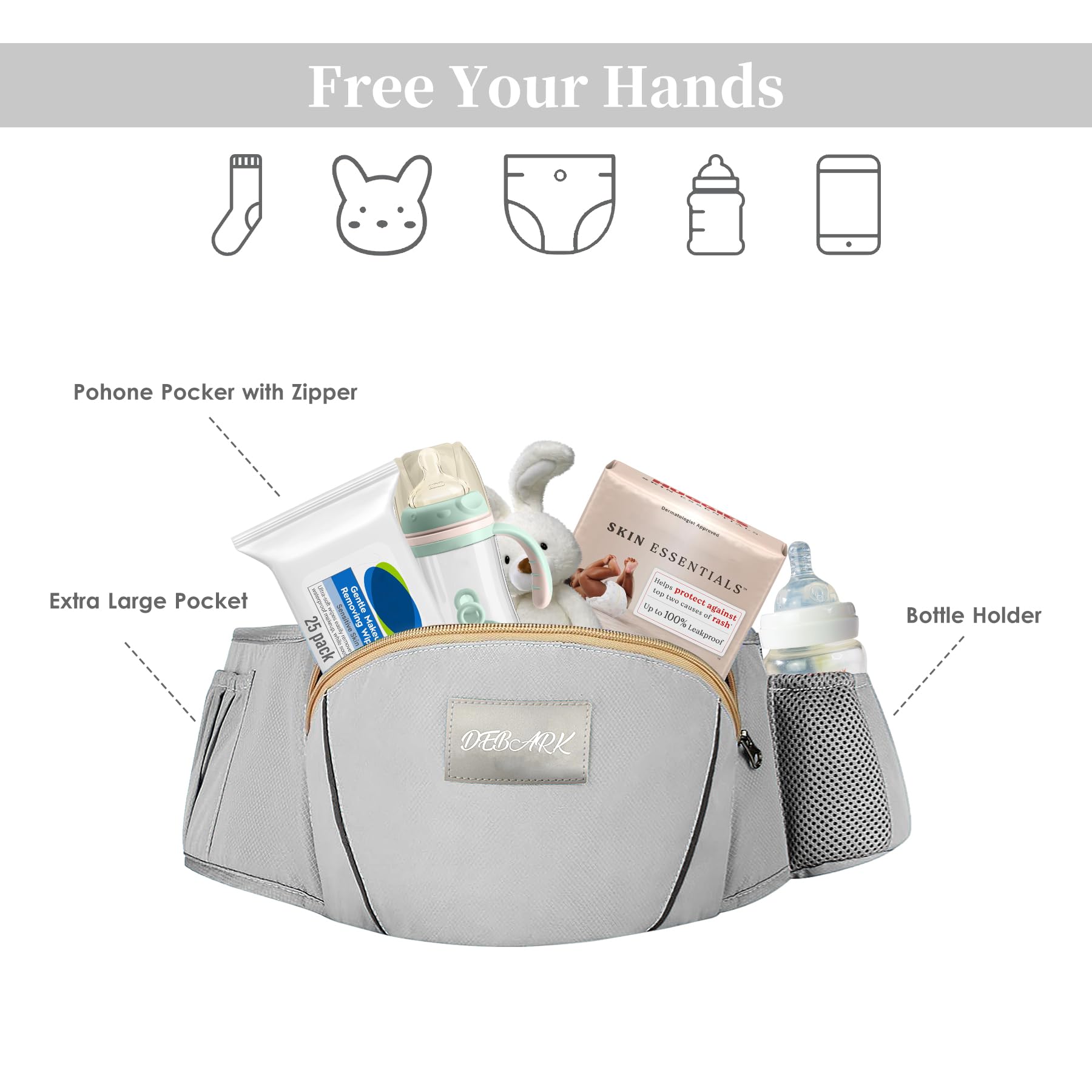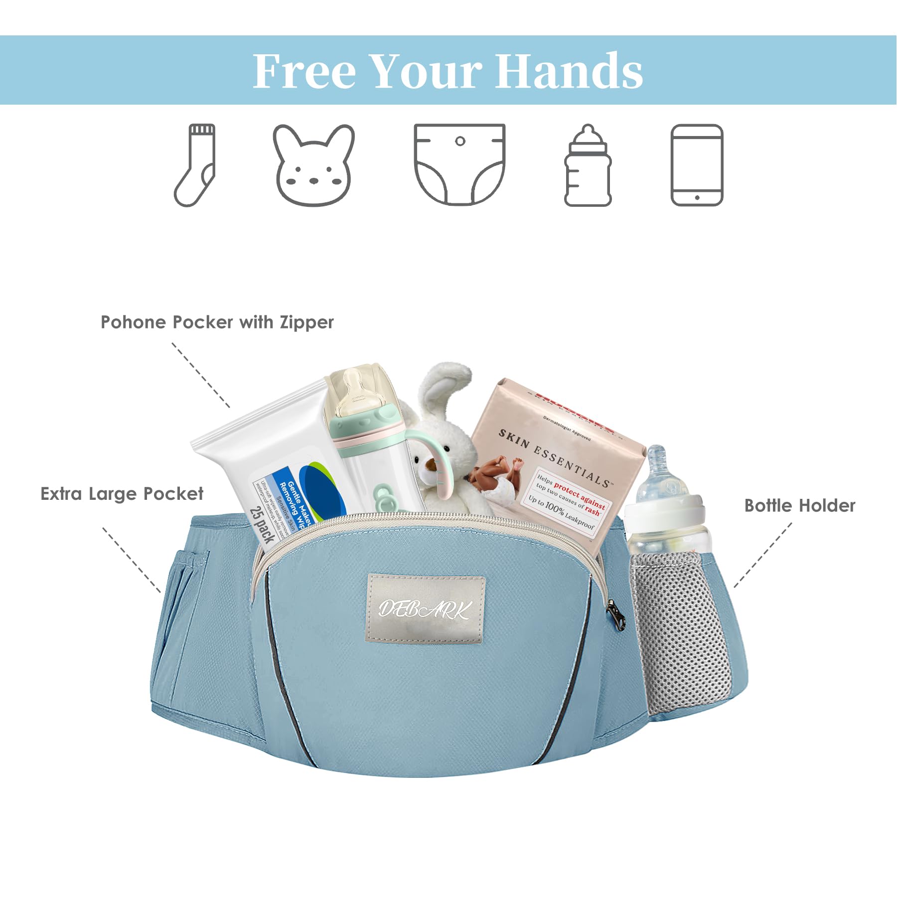 - Extra Large Capacity - Considering that parents may need to out for a long periods of time, Debark baby carrier newborn has designed four pockets. With large storage pockets beneath the seat, you can easily throw in diapers and wipes, making them easy to grab whenever needed. The side pockets are perfect for storing the keys, phone, and pacifiers, etc