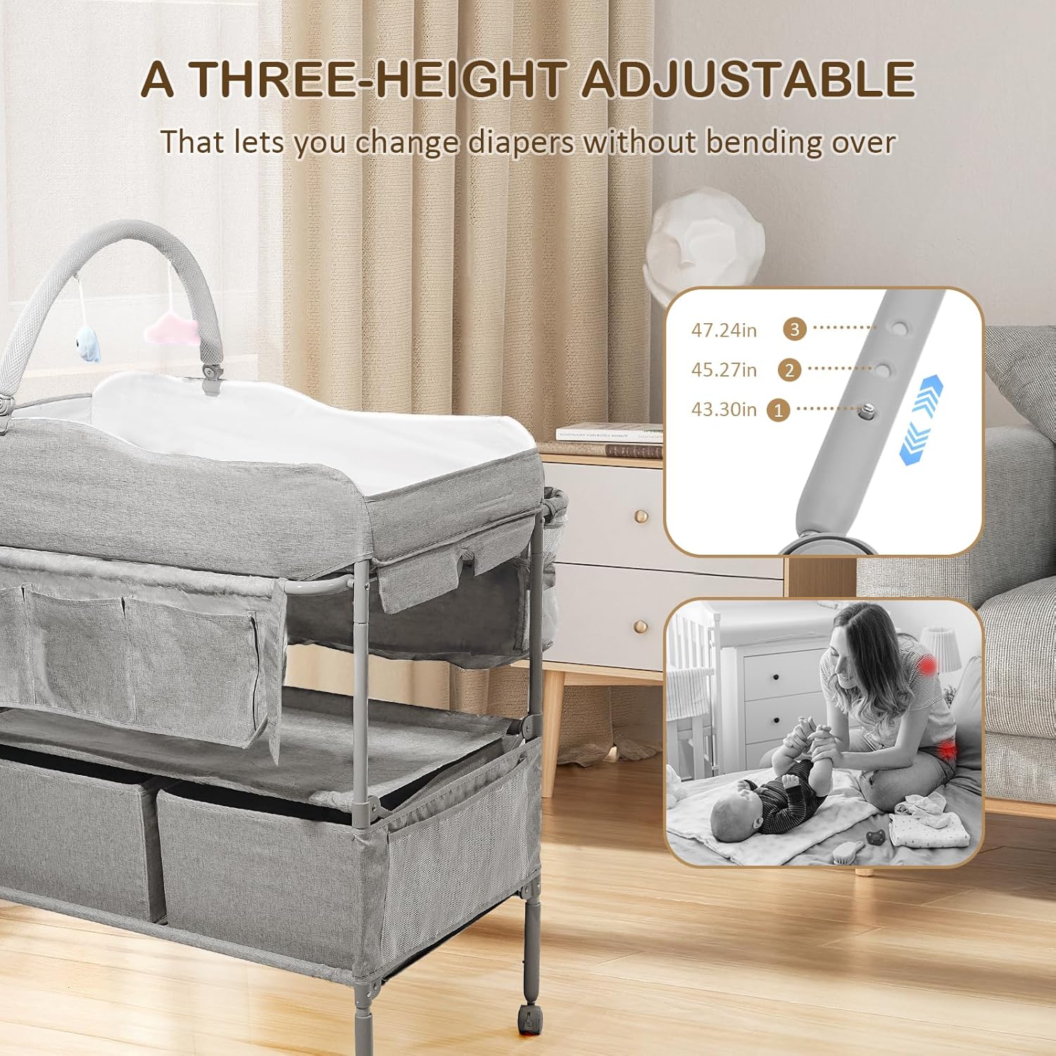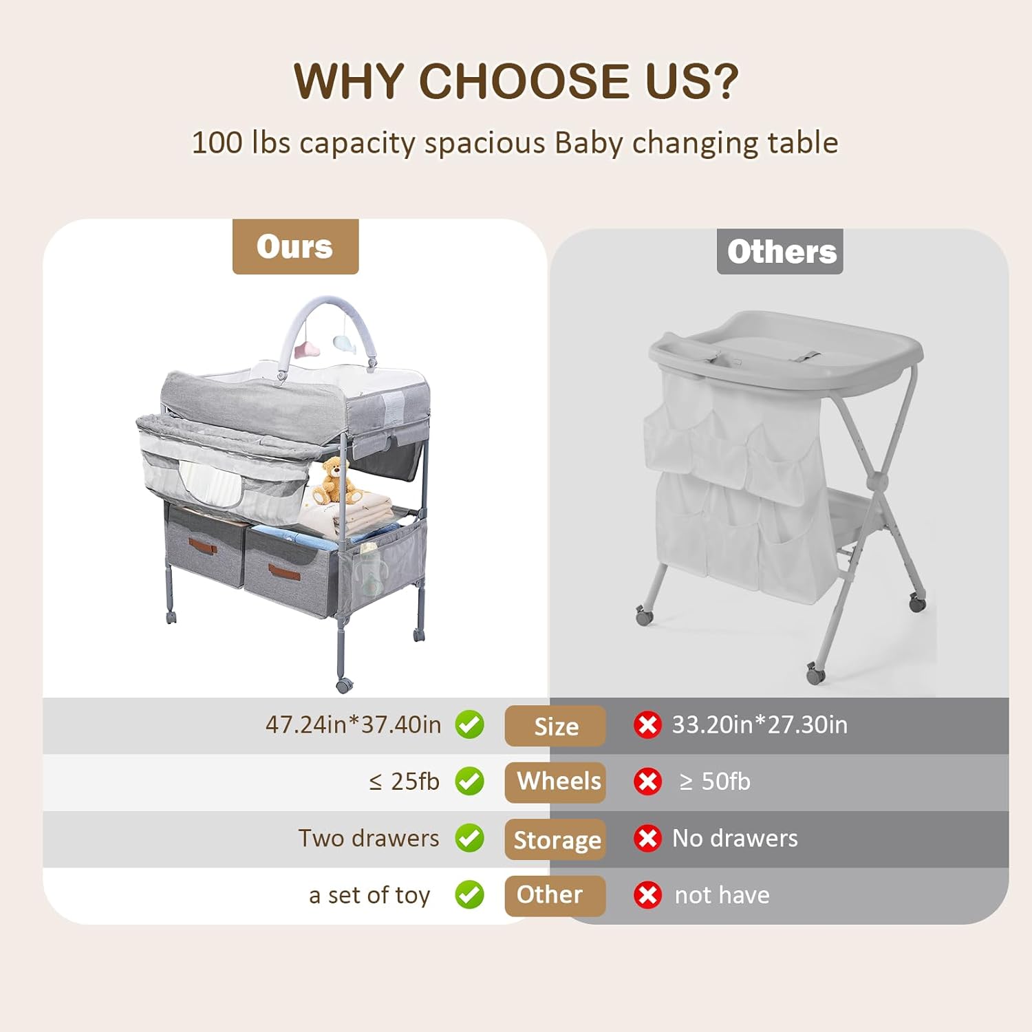 Baby Changing Table,Versatile Folding Changing Table,Waterproof/Foldable/Height Adjustable/Movable/with Silent Wheels/2 Drawers Diaper Changing Station,Mobile Nursery Organizer for Newborn Essentials