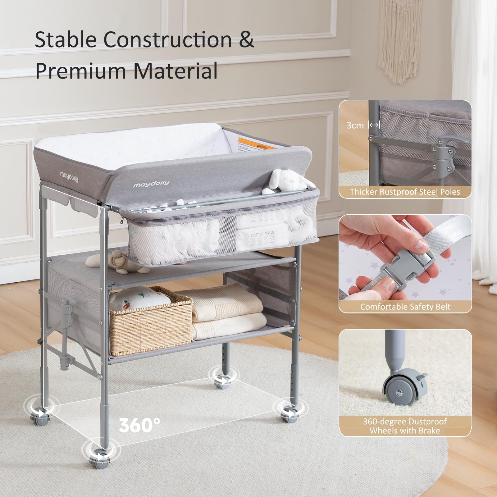 Baby Changing Table with Wheels, Maydolly Portable Foldable Changing Table, Waterproof Diaper Changing Station, Adjustable Height Changing Station, Mobile Nursery for Newborn and Infant (Grey)