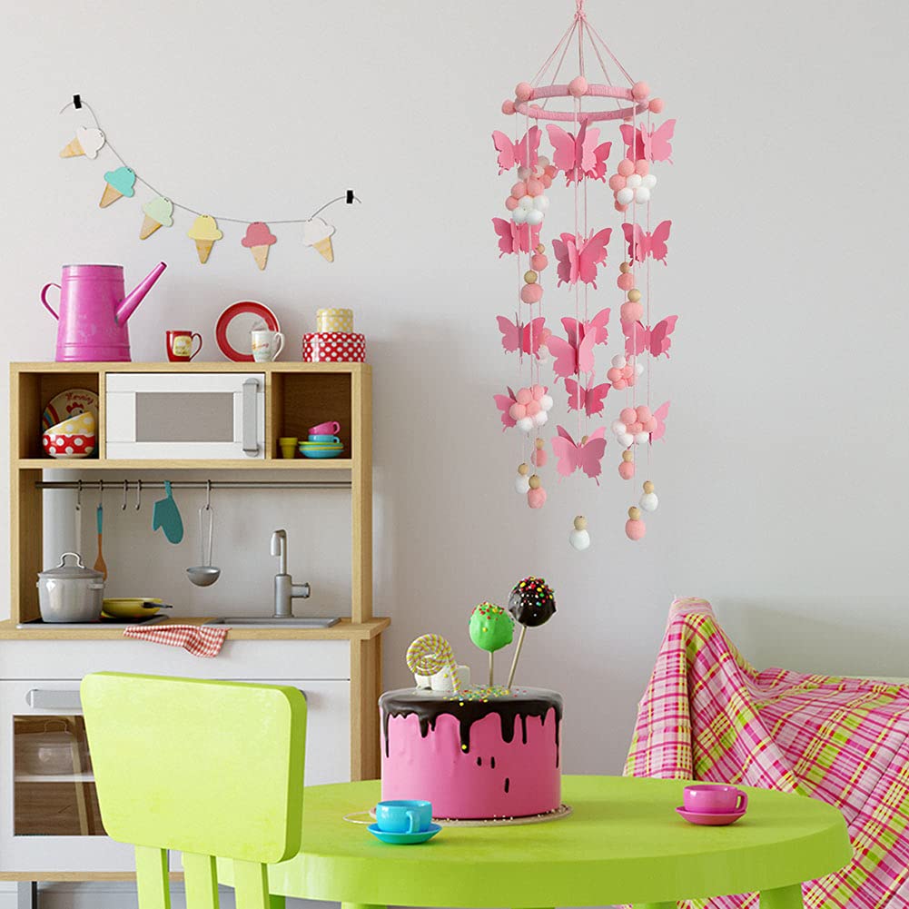 Baby Crib Mobile, Cute Butterfly Wind Chime, Handmade Felt Ball Mobile Ceiling Mobile Hanging Decoration for Newborn Nursery, Baby Nursery Room Decor(Pink)