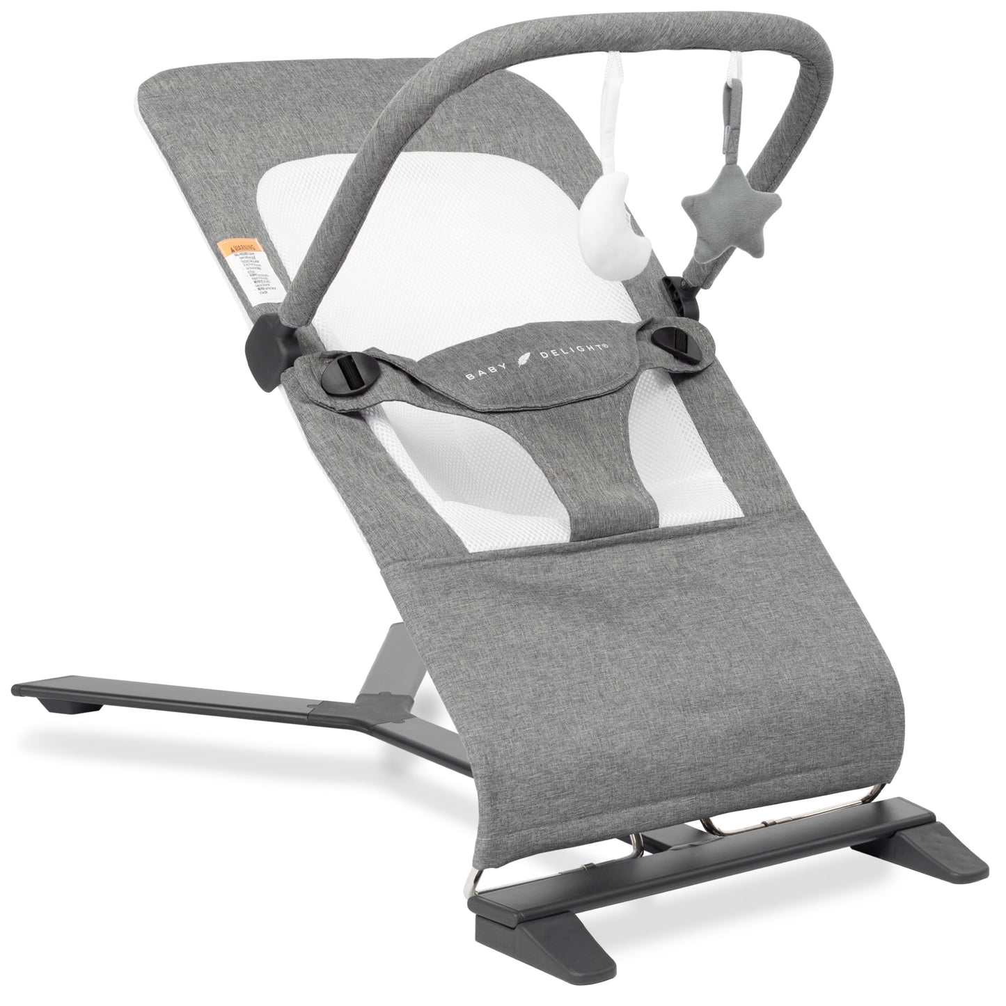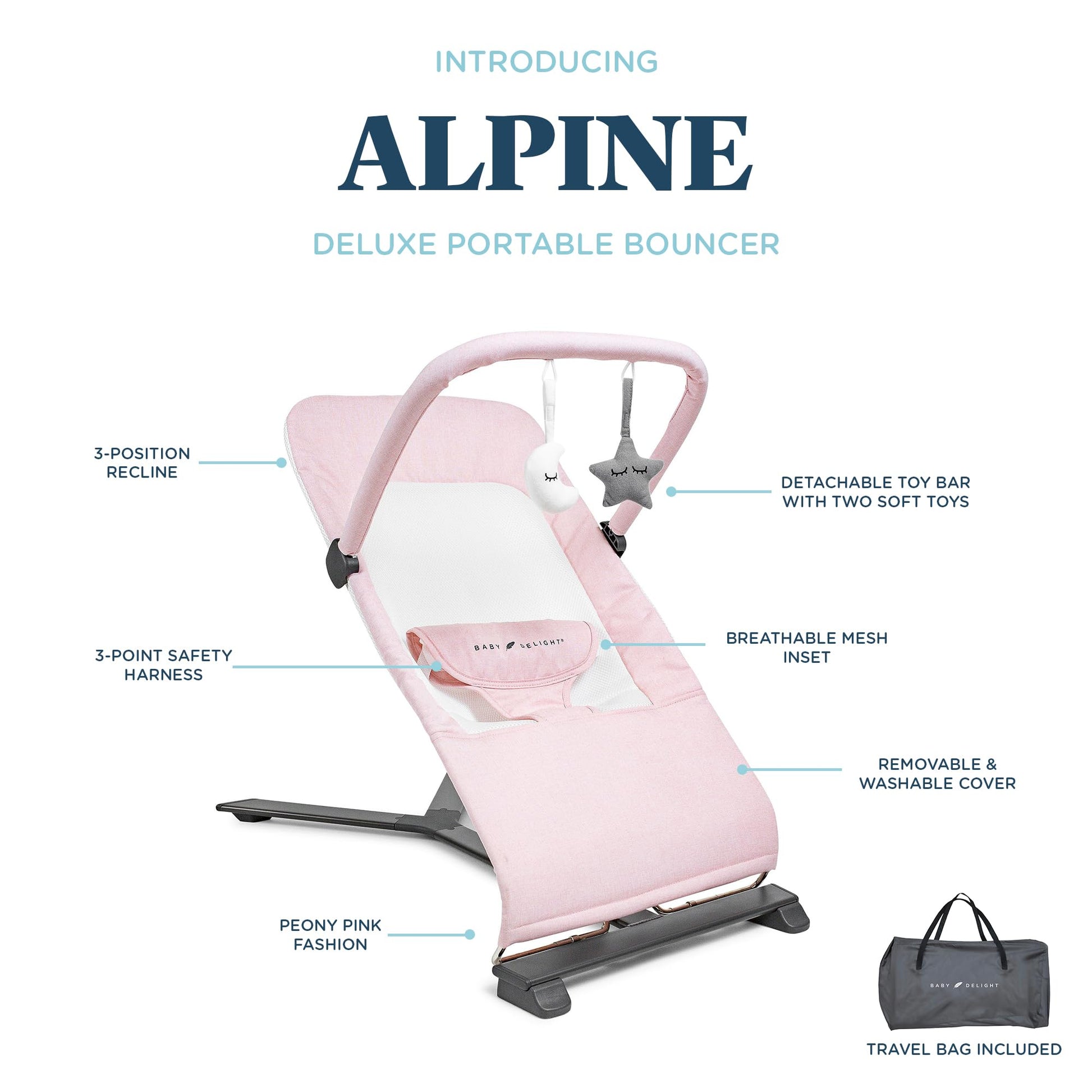 Sit. Play. Relax. And do it all in style. The Baby Delight Alpine Deluxe portable Bouncer offers your little one 3 positions of recline to optimize their comfort level. The mesh inset in the cover allows for increased airflow, while the entire cover can be removed for machine washing. A 3-point harness keeps your baby securely in place and the removable toy bar provides an adorable entertainment option. And since most parents today are always on the go, The Alpine is portable. When you're ready to travel or store away, fold it flat and put it into the included carry bag.