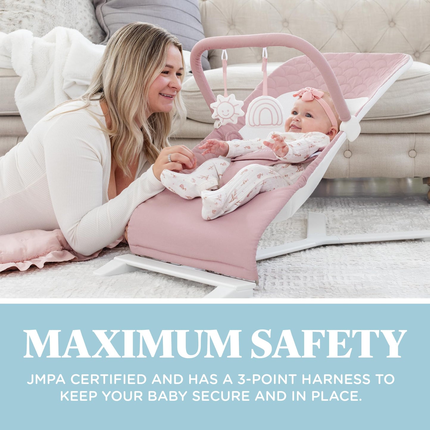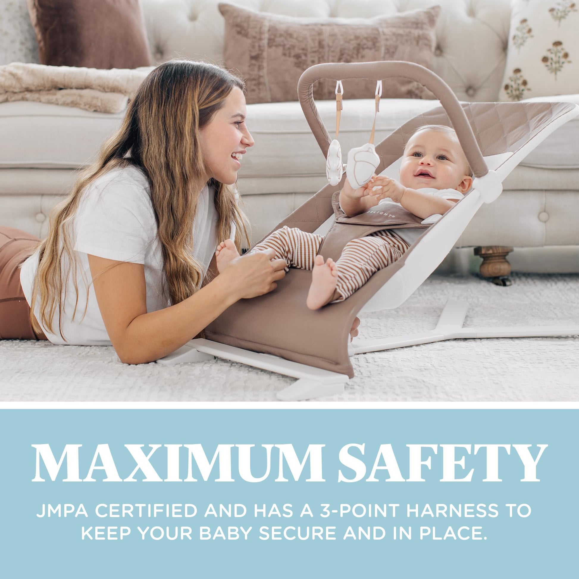 - MAXIMUM SAFETY AND STYLE: JMPA certified and has a 3-point harness to keep your baby secure and in place. At Baby Delight, we believe that parents shouldn’t have to sacrifice style for safety. That is why we created this baby bouncer with an organic oat quilted fabric, meant to fit into any home's décor. Recommended age range is 0-6 months or up to 20lbs.